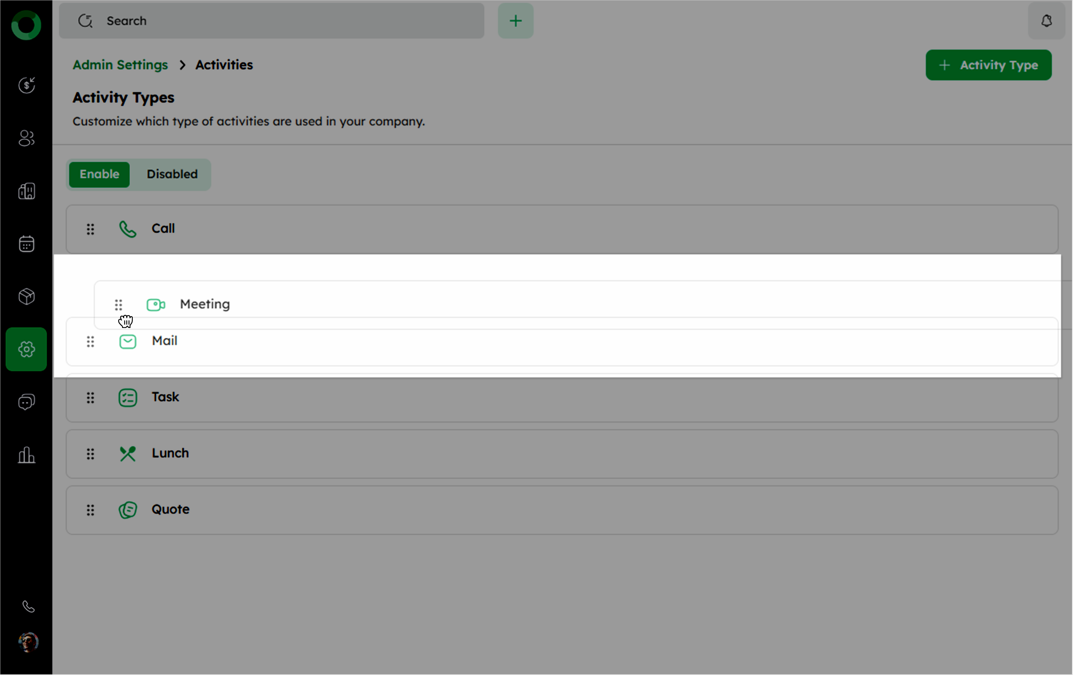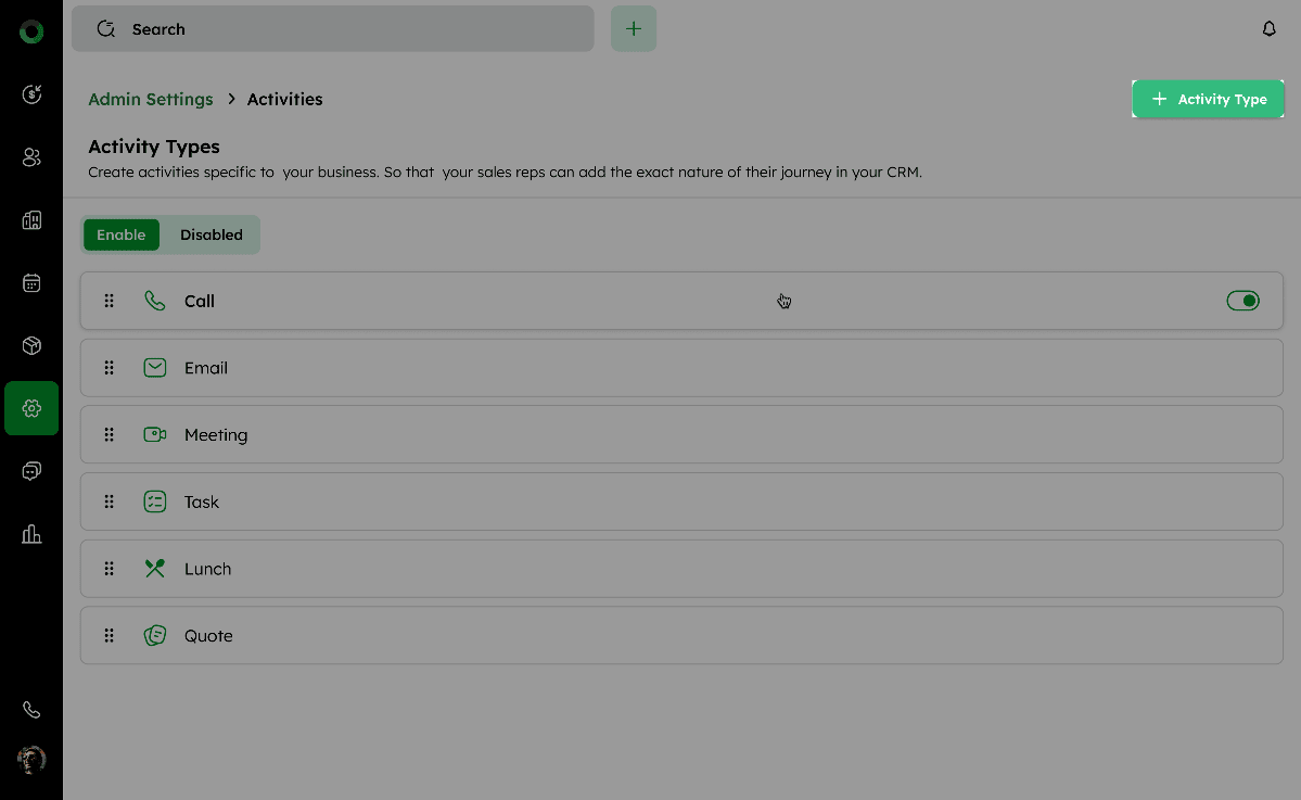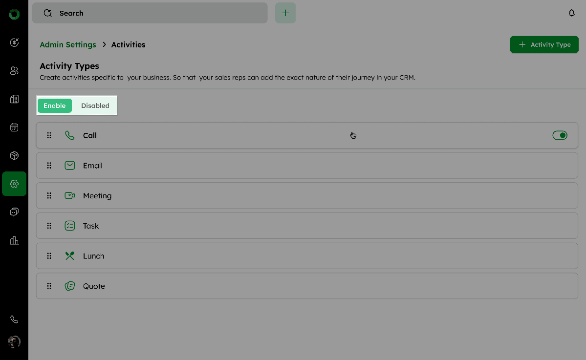 Follow these steps to view, edit, reorder, enable/disable, and manage the activity types in your CRM system.