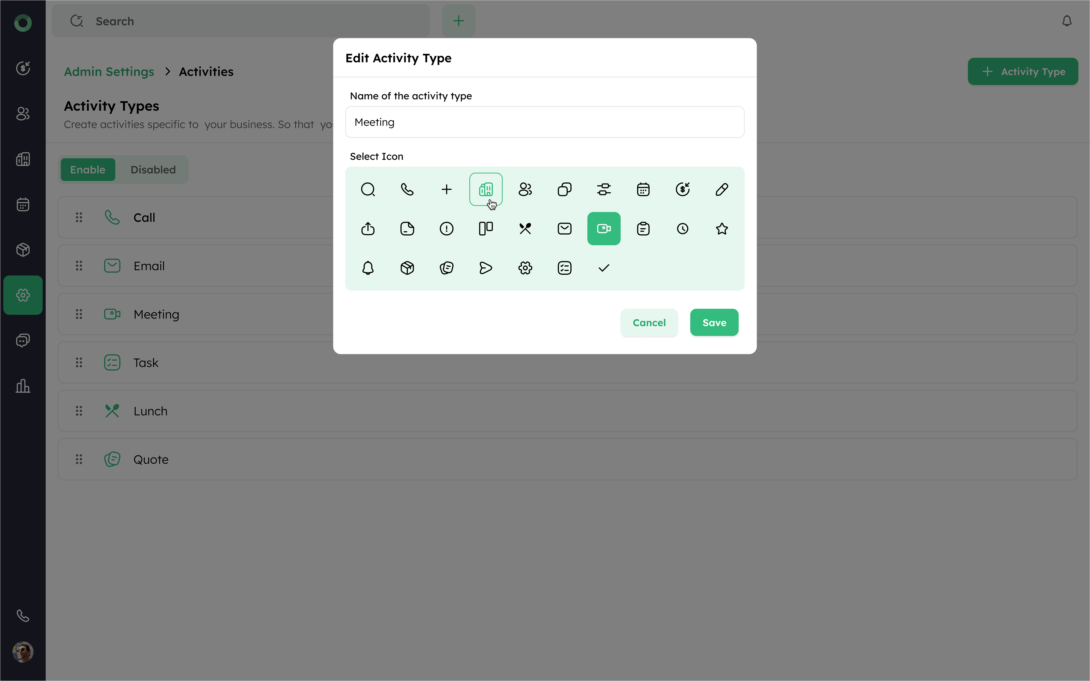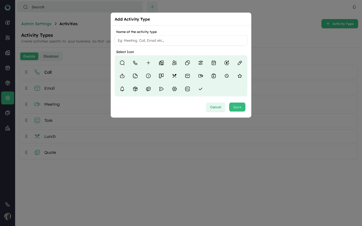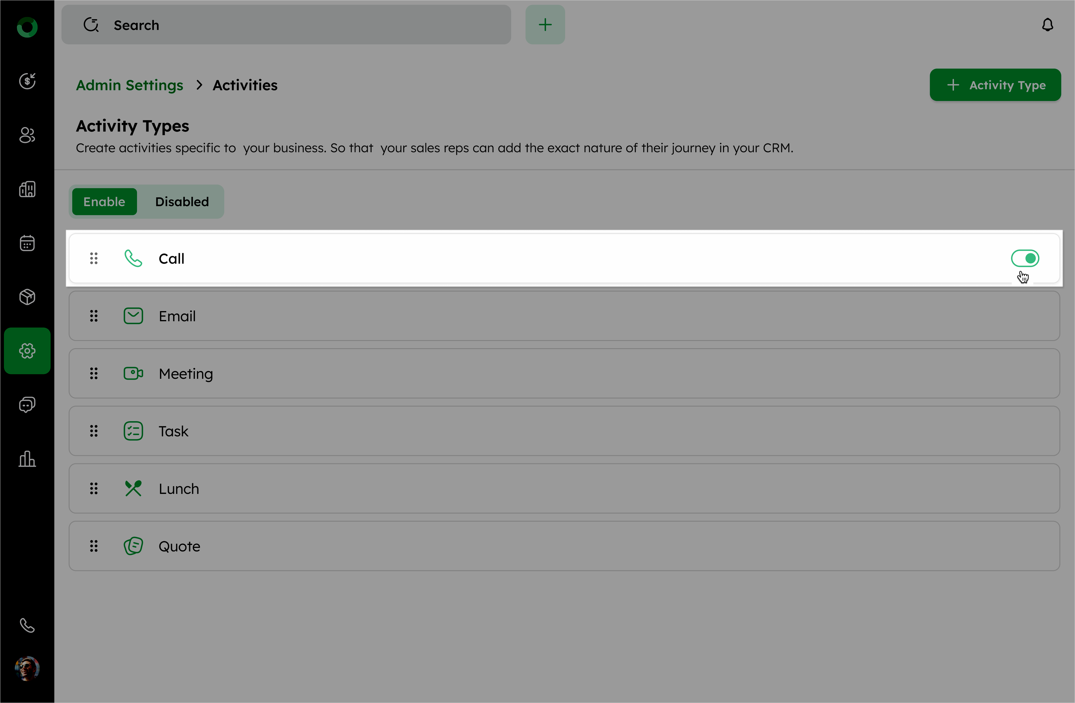 Follow these steps to view, edit, reorder, enable/disable, and manage the activity types in your CRM system.