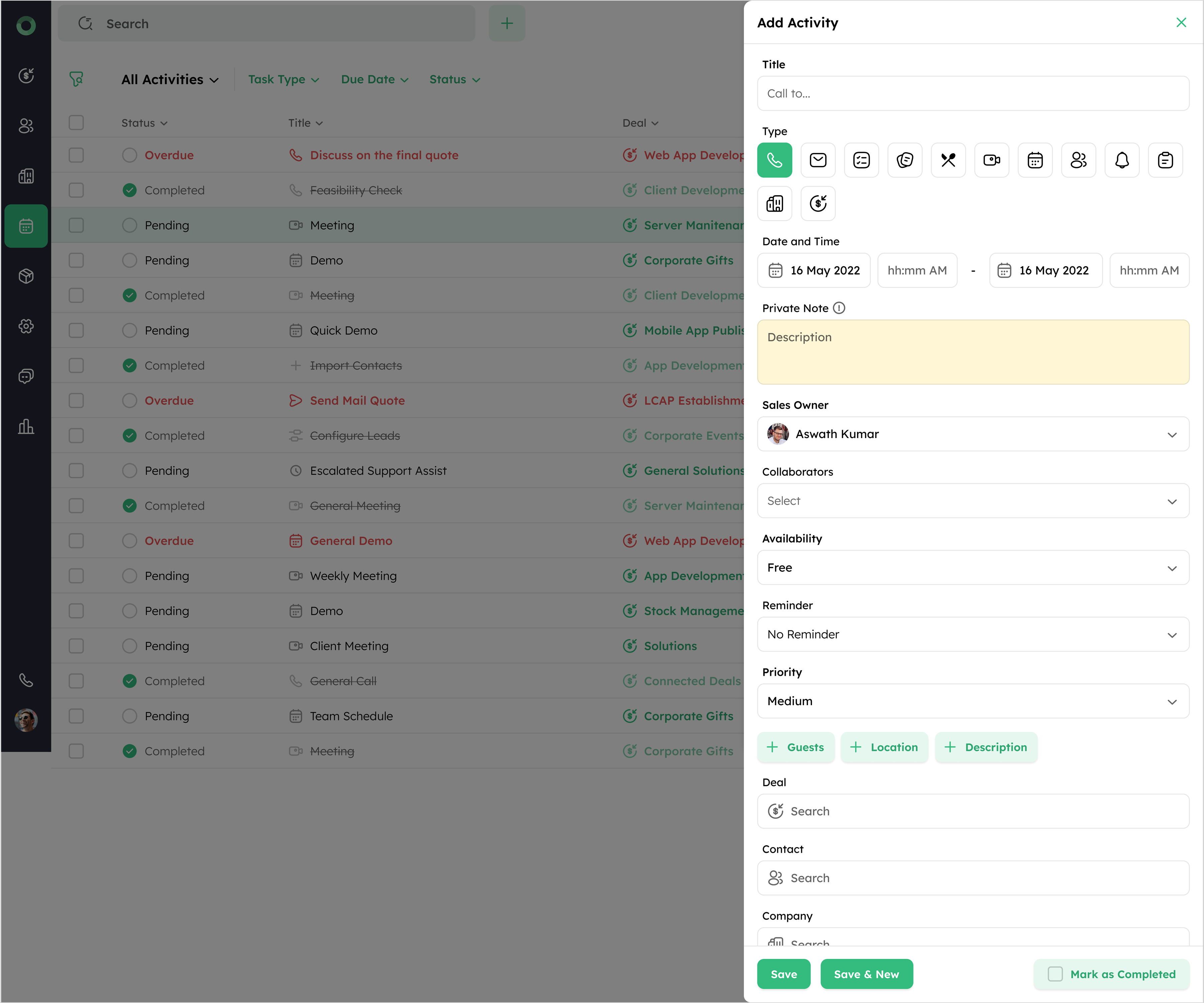 - In the Add Activity form, fill in the required details, such as Title, Type, Date and Time, Availability, Reminder, Priority, Sales Owner, Collaborators, Private Note, Deal, Contact, and Company.