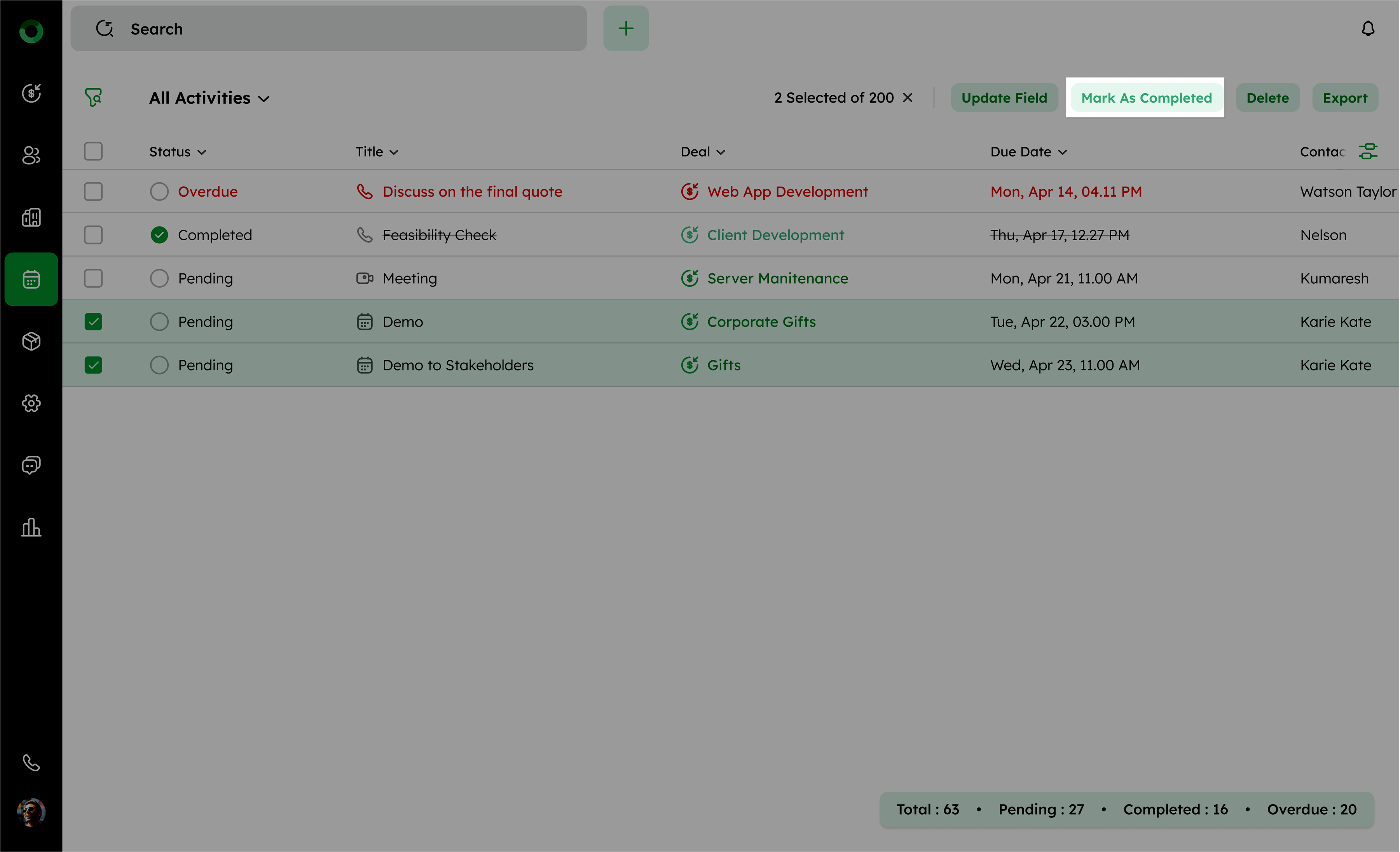 Bulk action enables you to mark multiple activities as completed instead of handling them individually.