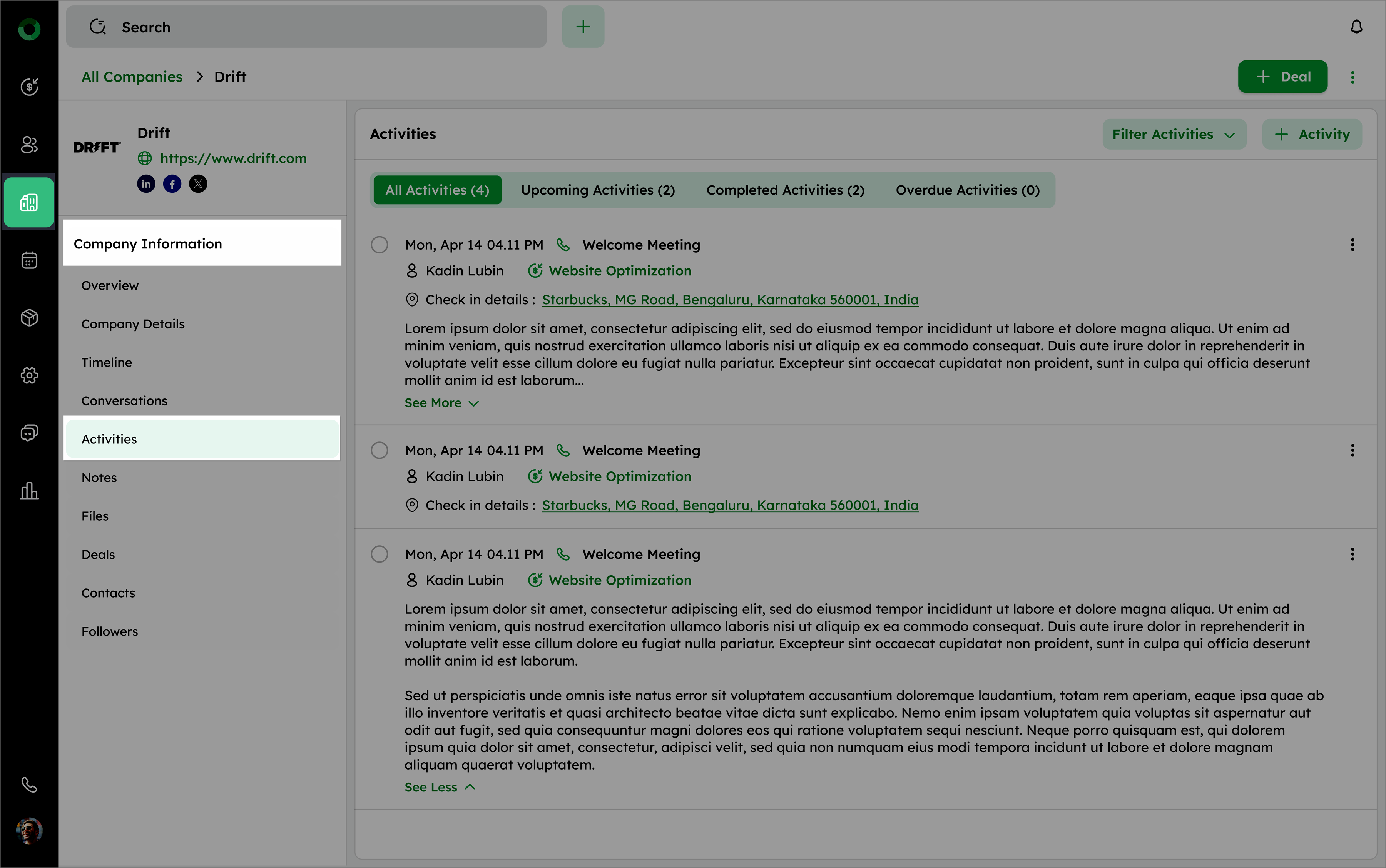In the Company Detail Page, go to the Activities tab under the Company Information.