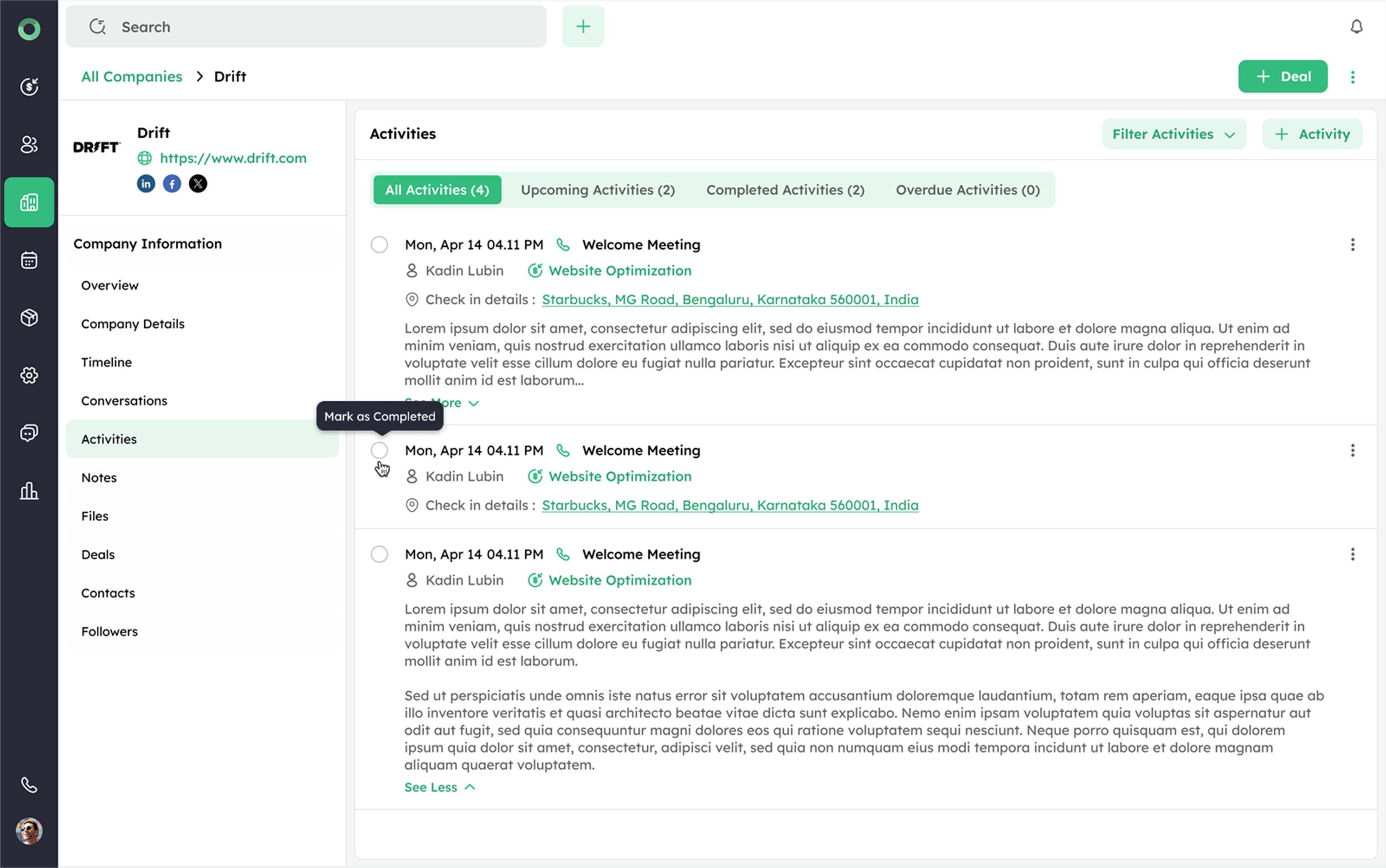 Activities tied to a company can be marked as complete from the Company Detail Page.