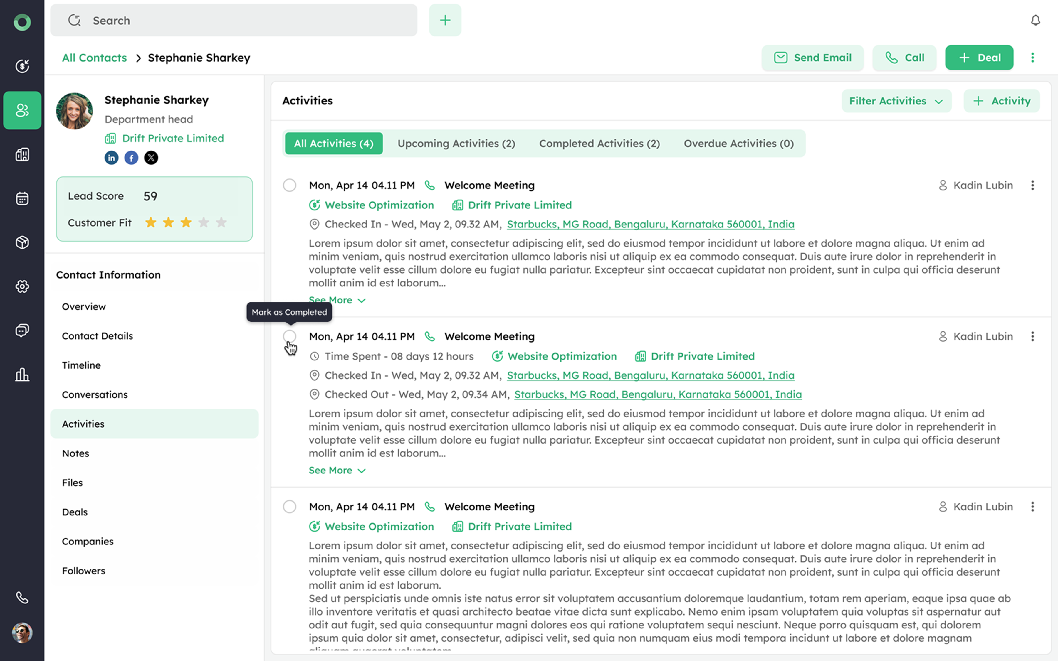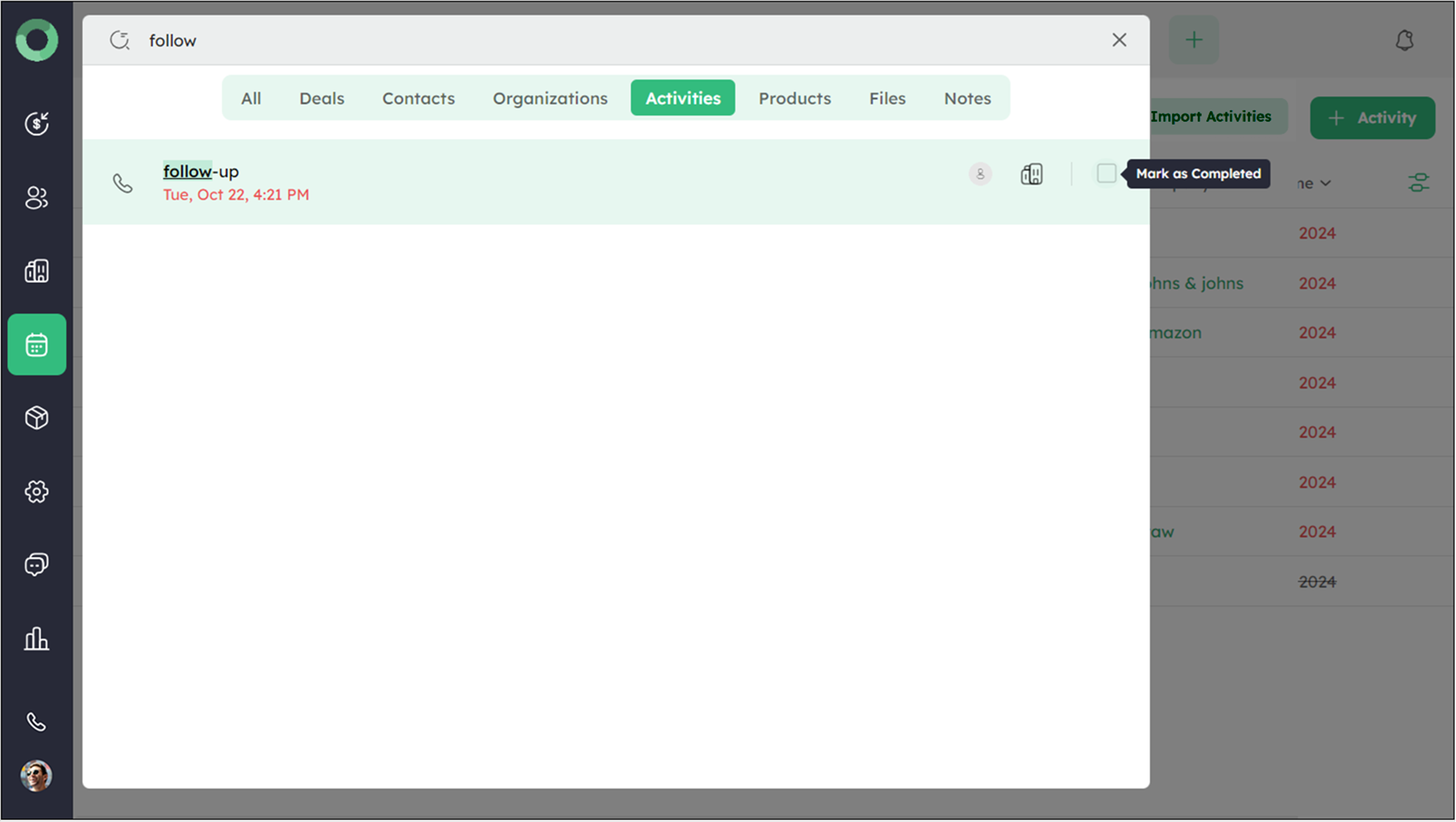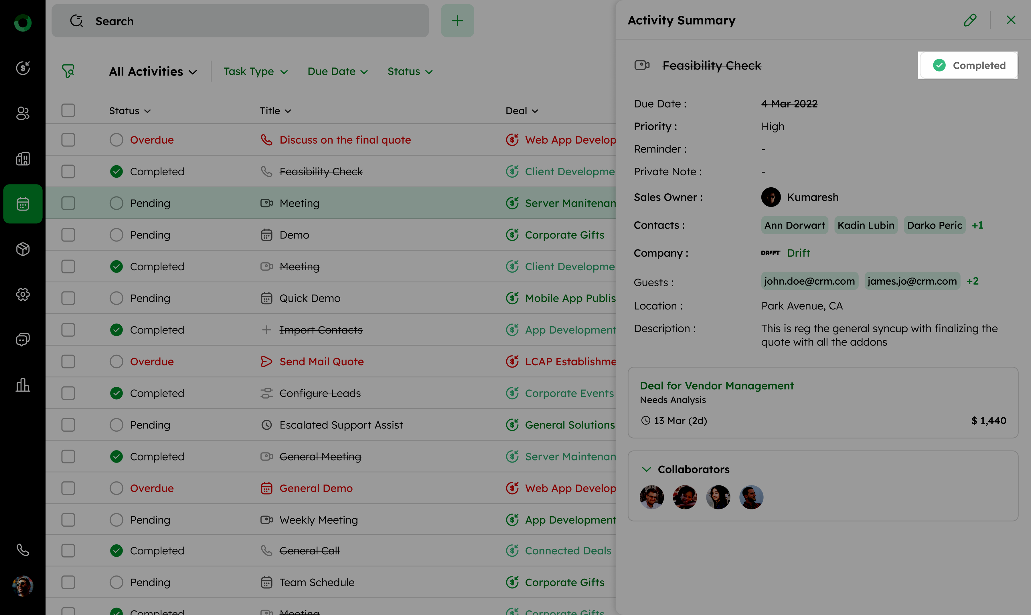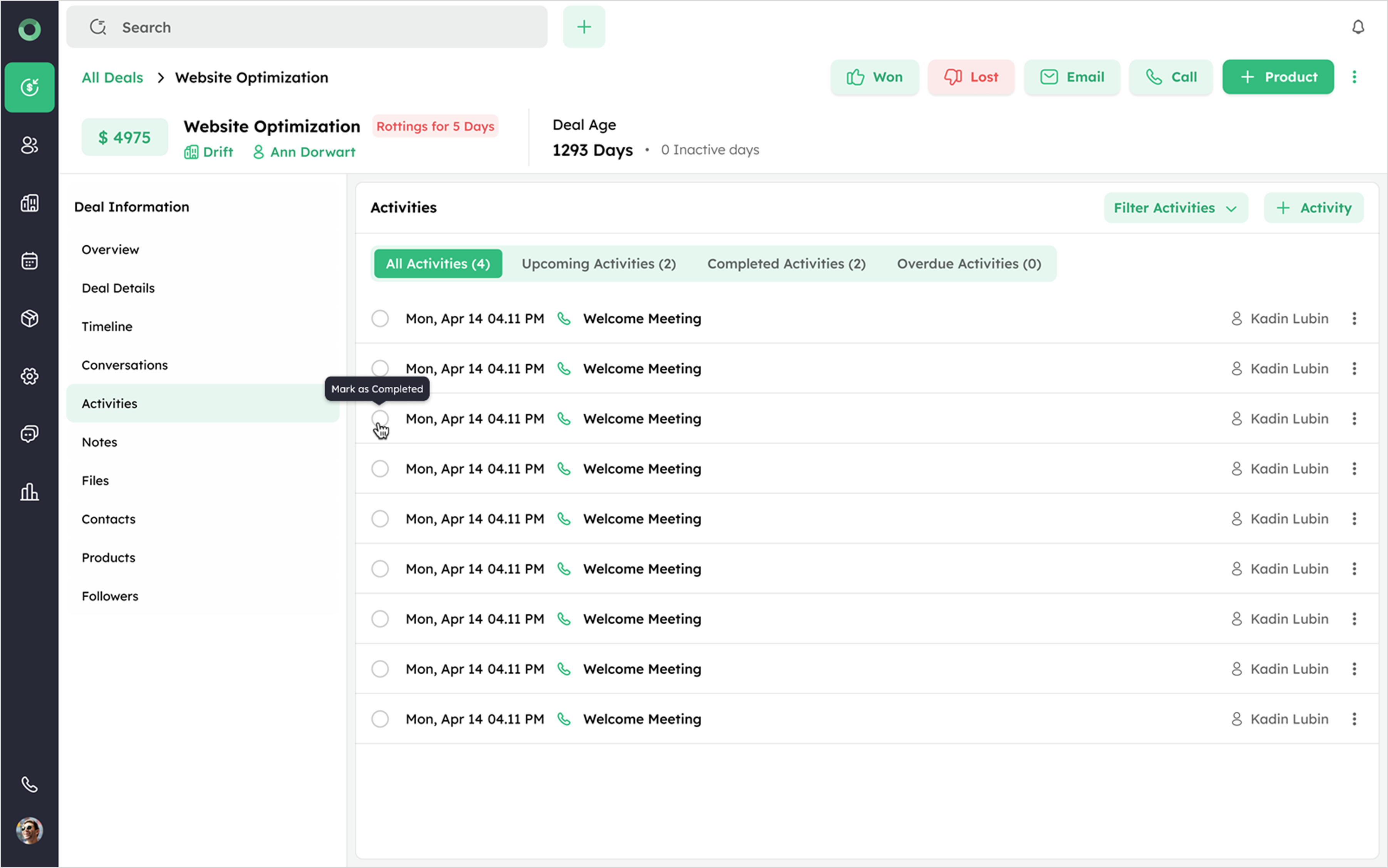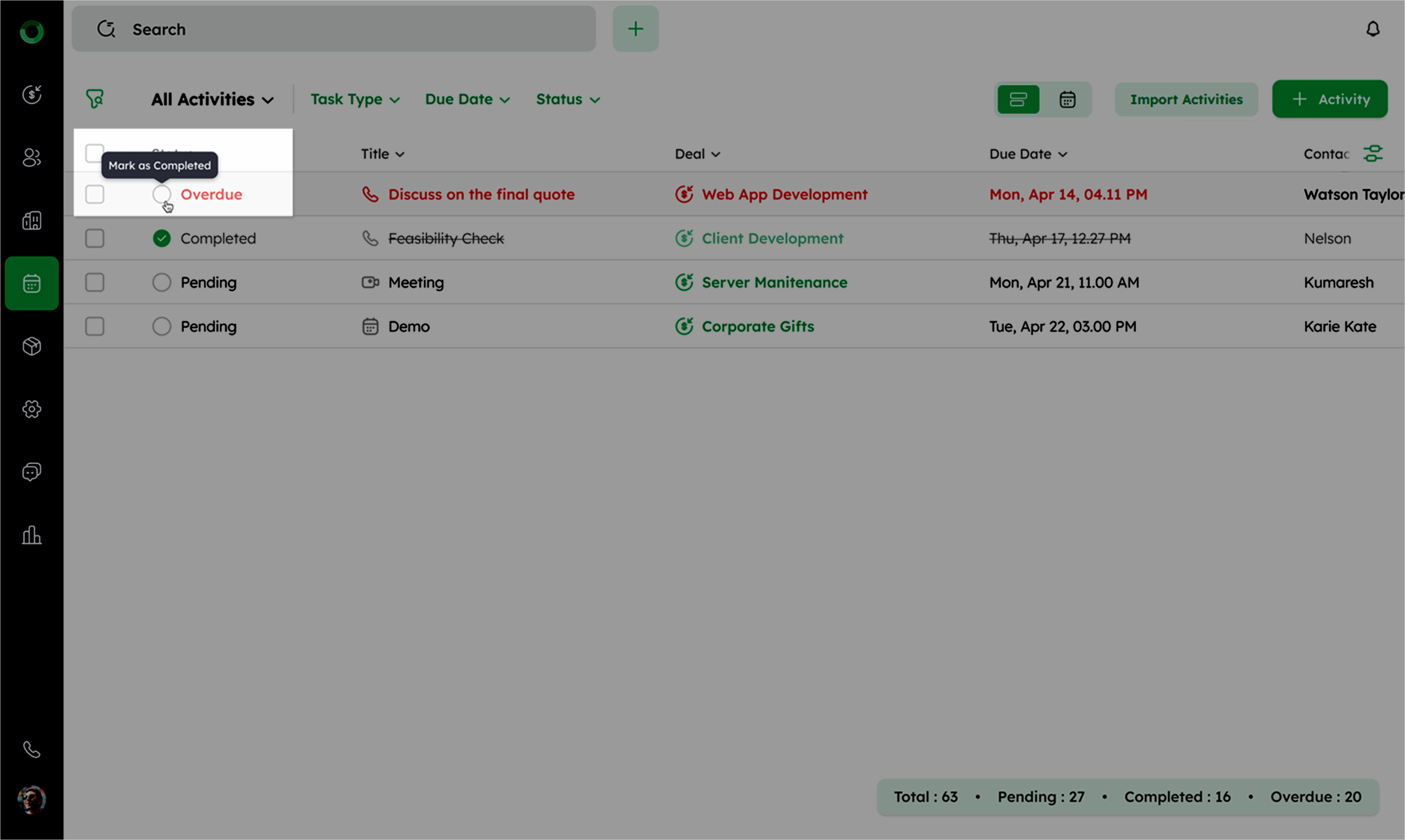 Activities linked to specific deals can be marked as complete from the Deal Detail Page.