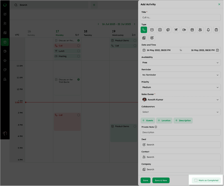 Setting Status as Completed in the Add Activity Form