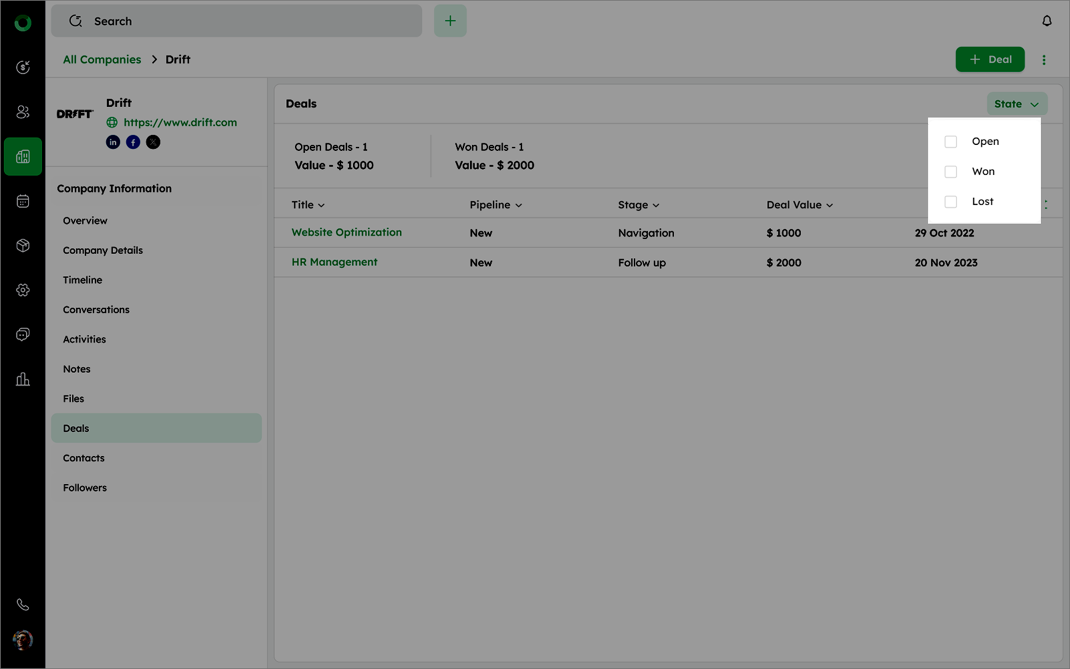 Use the State Filter to view deals by status (Open, Won, Lost). Multiple selections are supported.