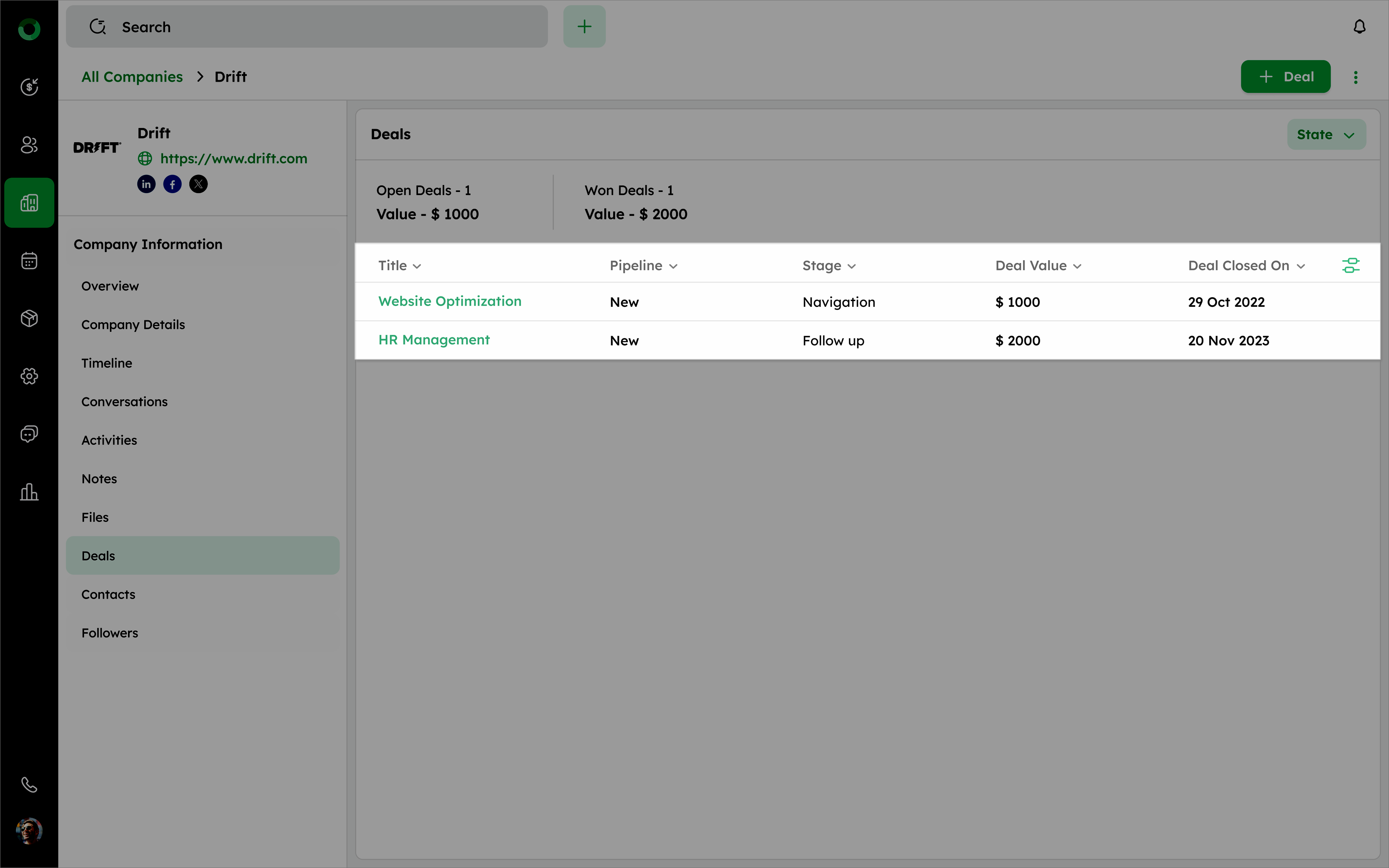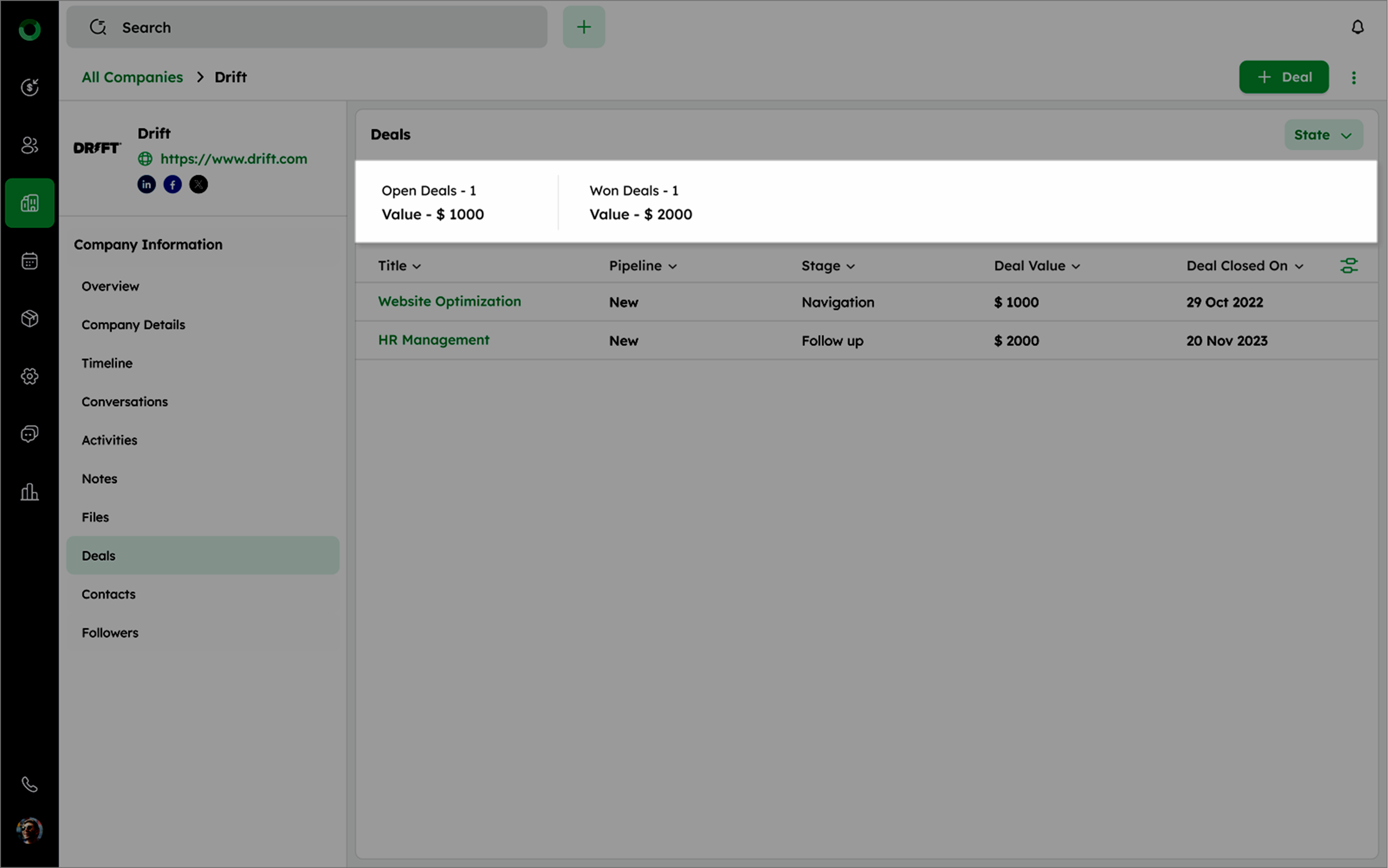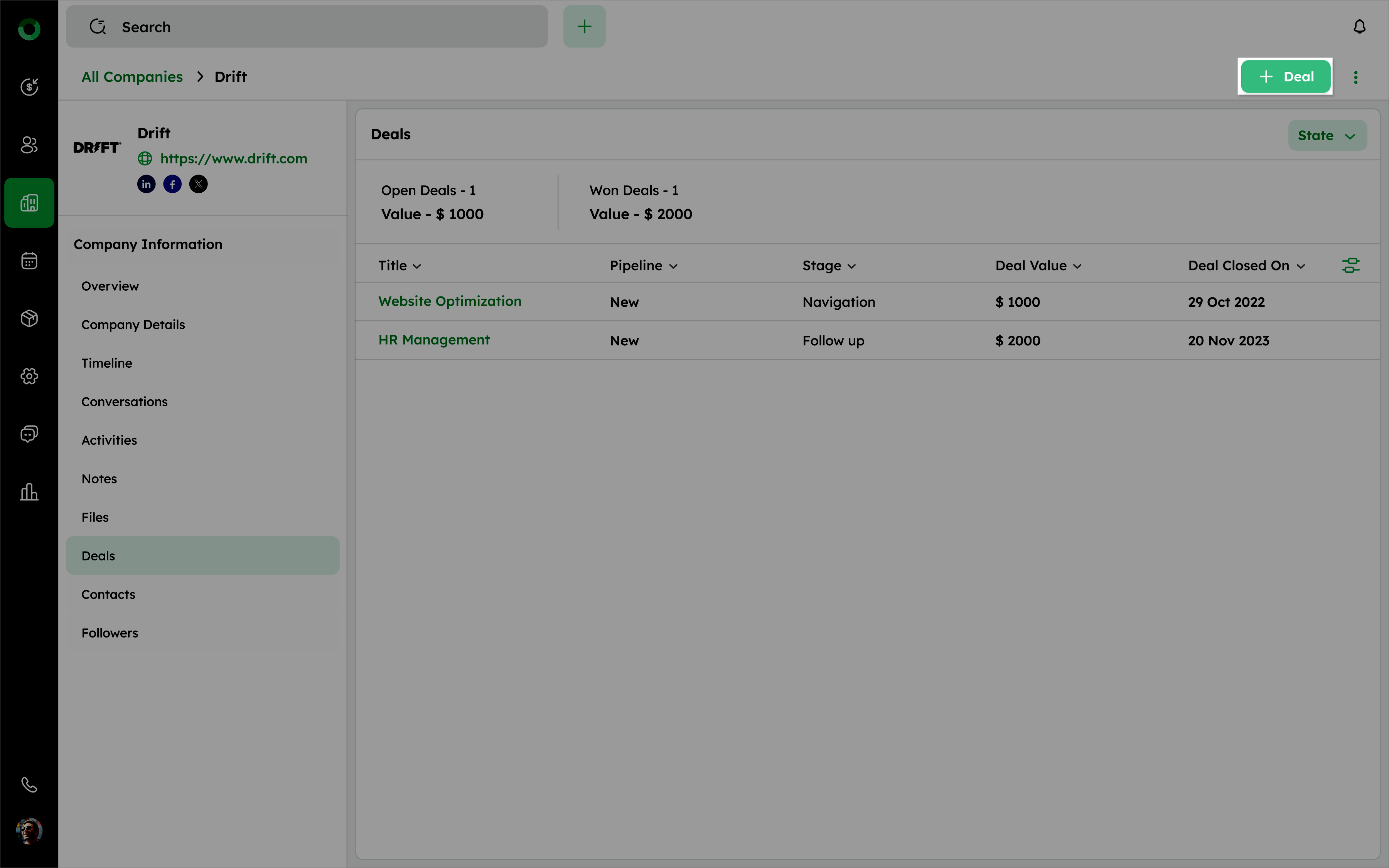 - Click the + Deal button on the company detail page.