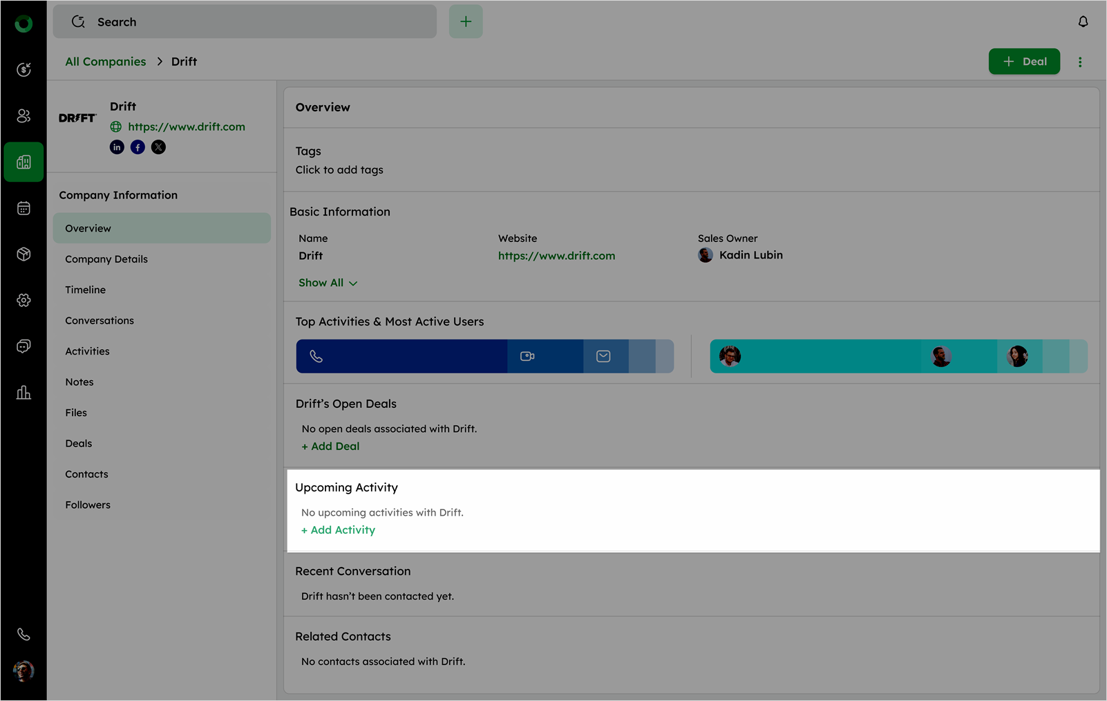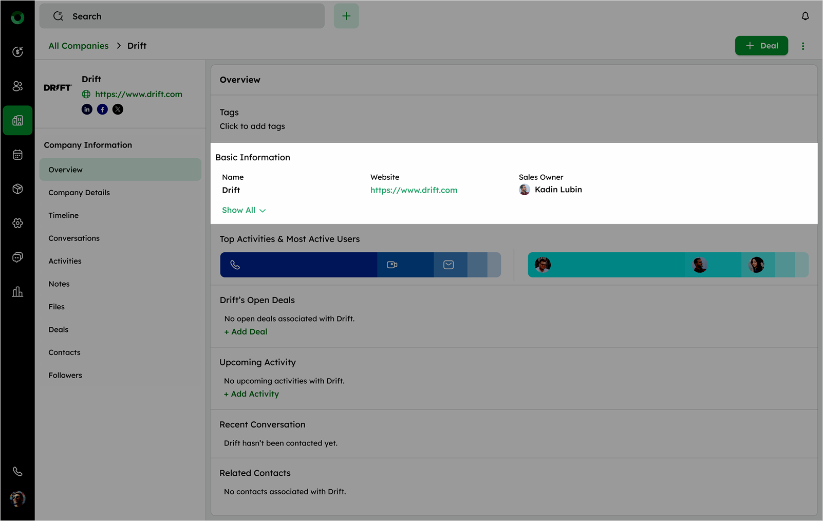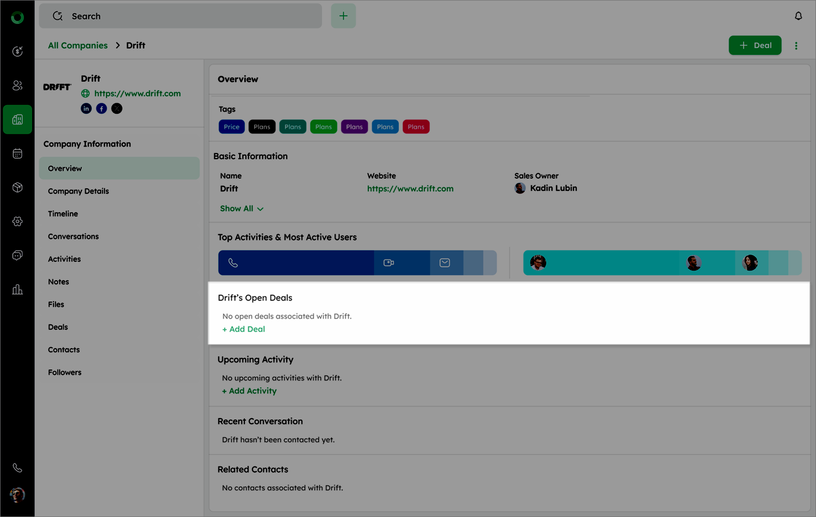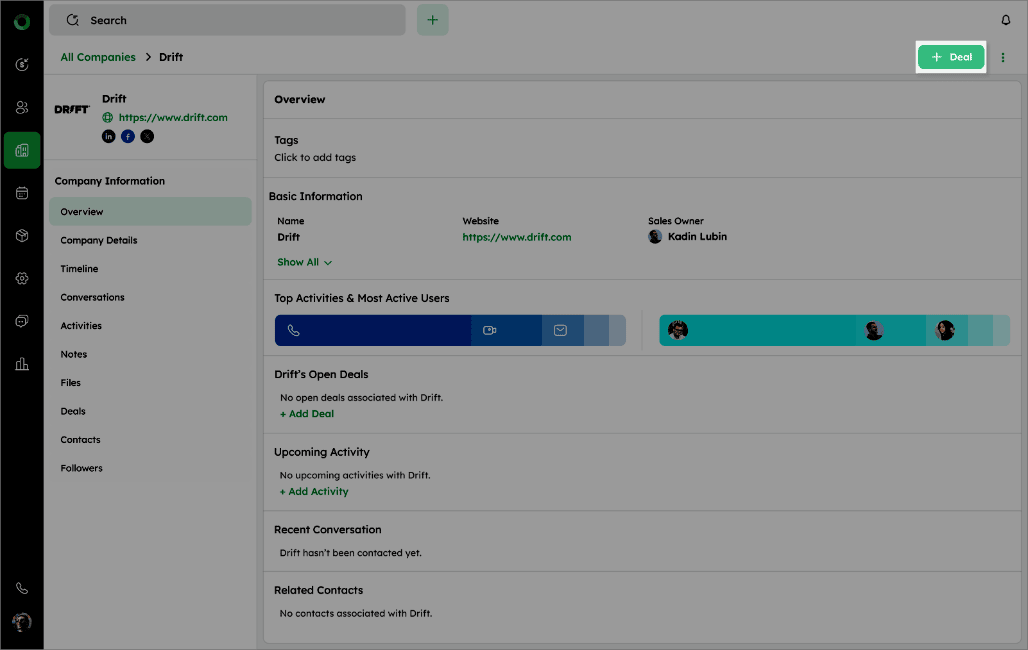 - Check Open Deals to see all deals linked to the company or use +Add Deal if none exist.
