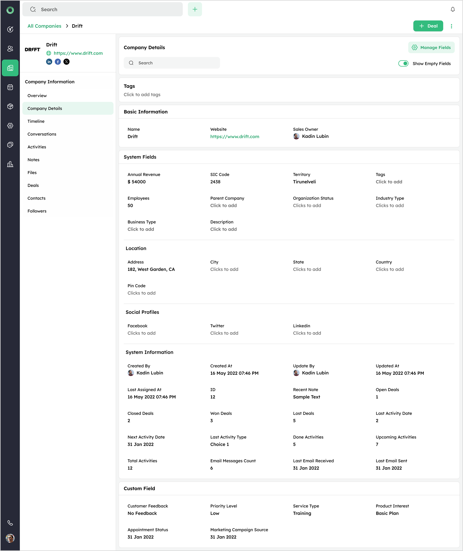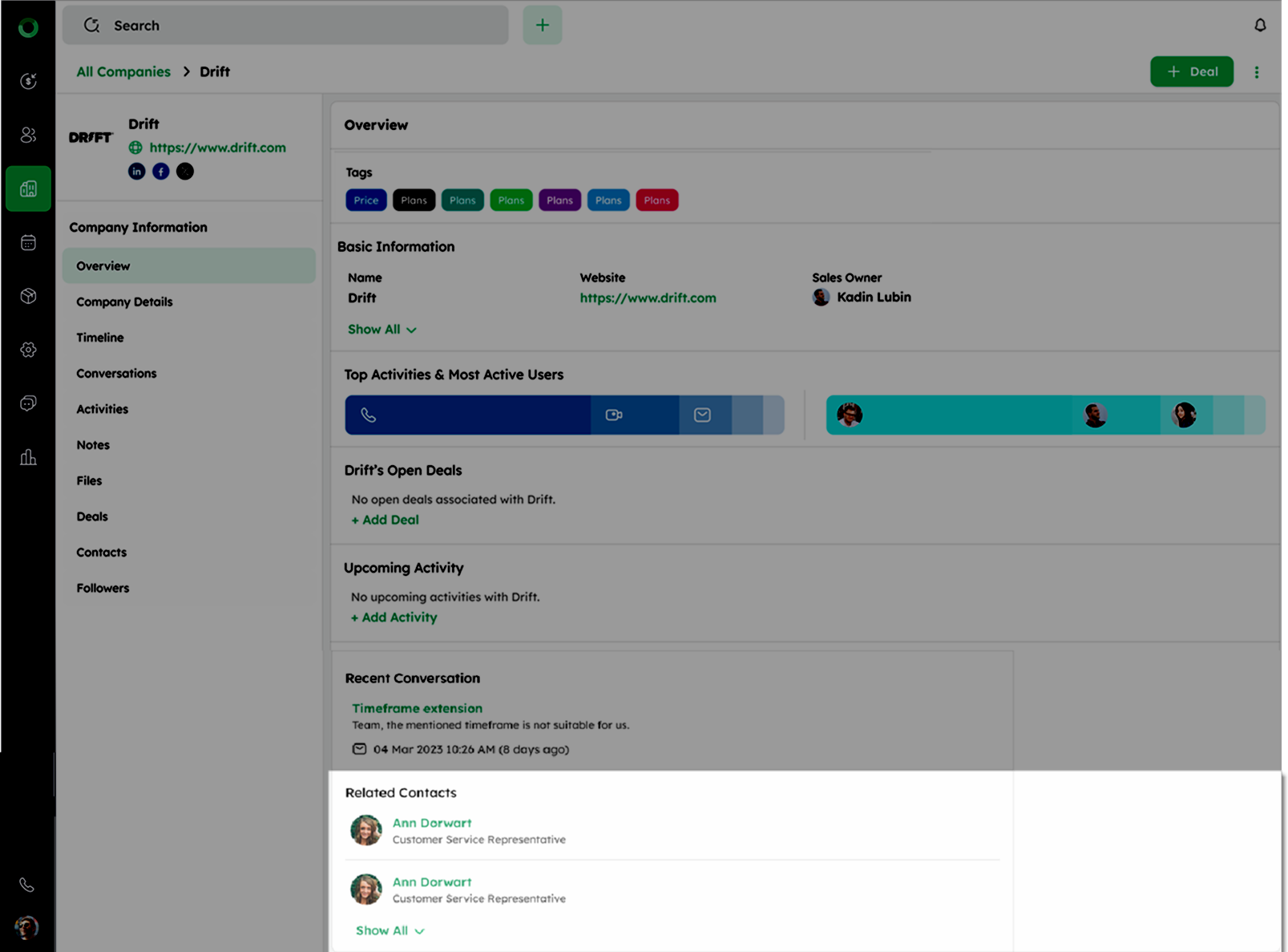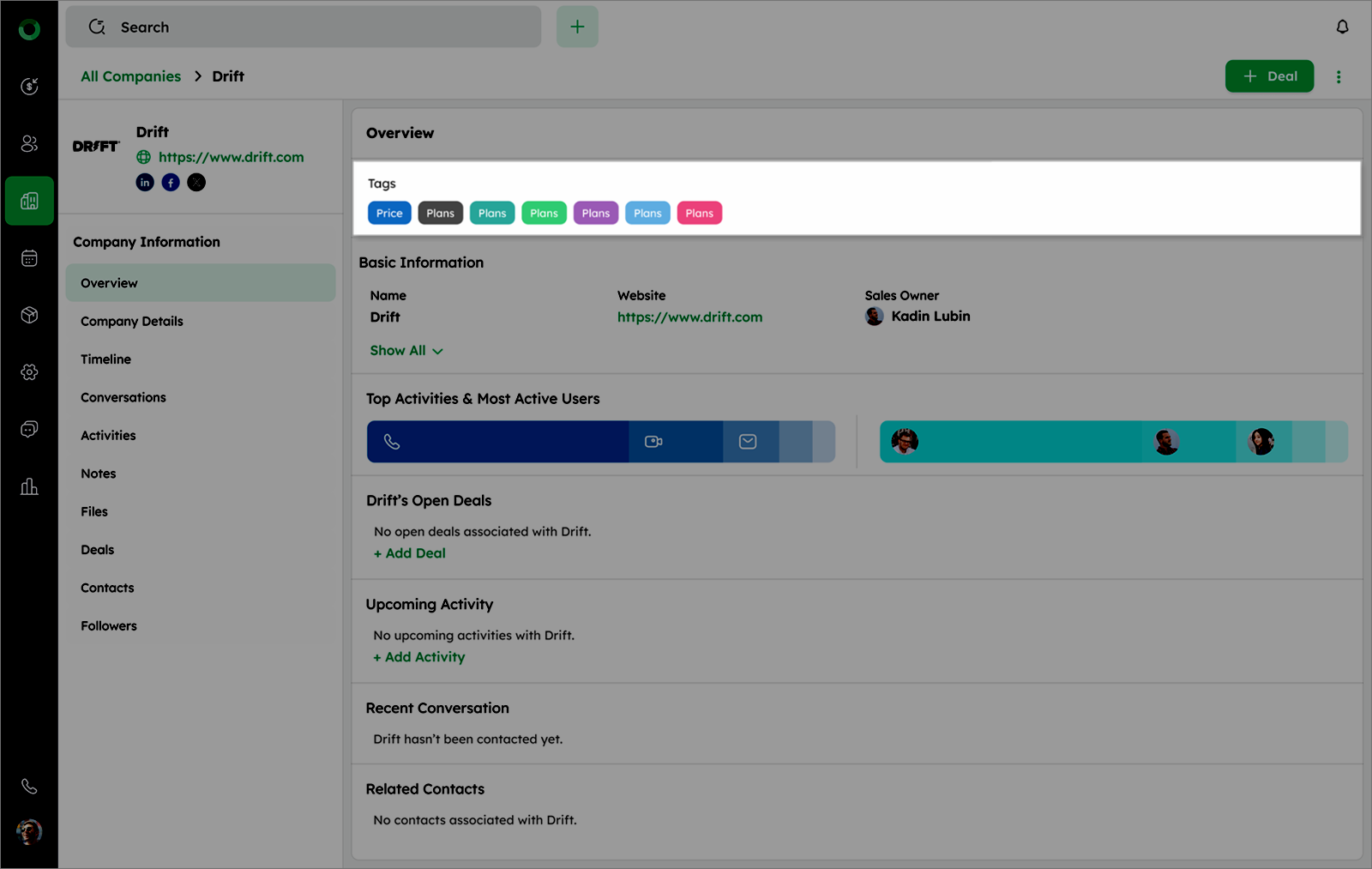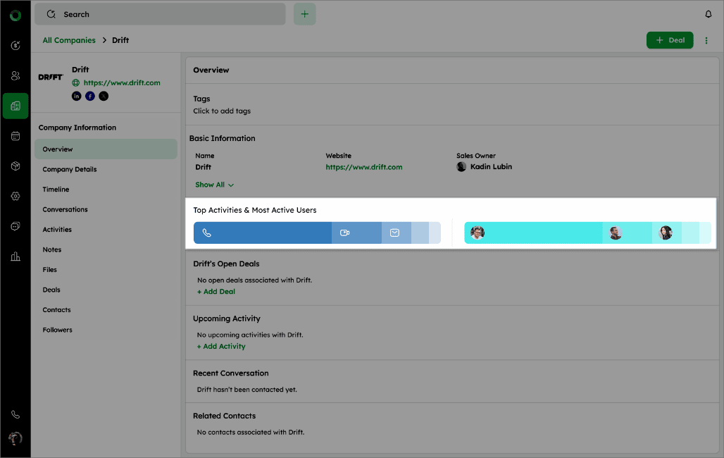 - Check Open Deals to see all deals linked to the company or use +Add Deal if none exist.