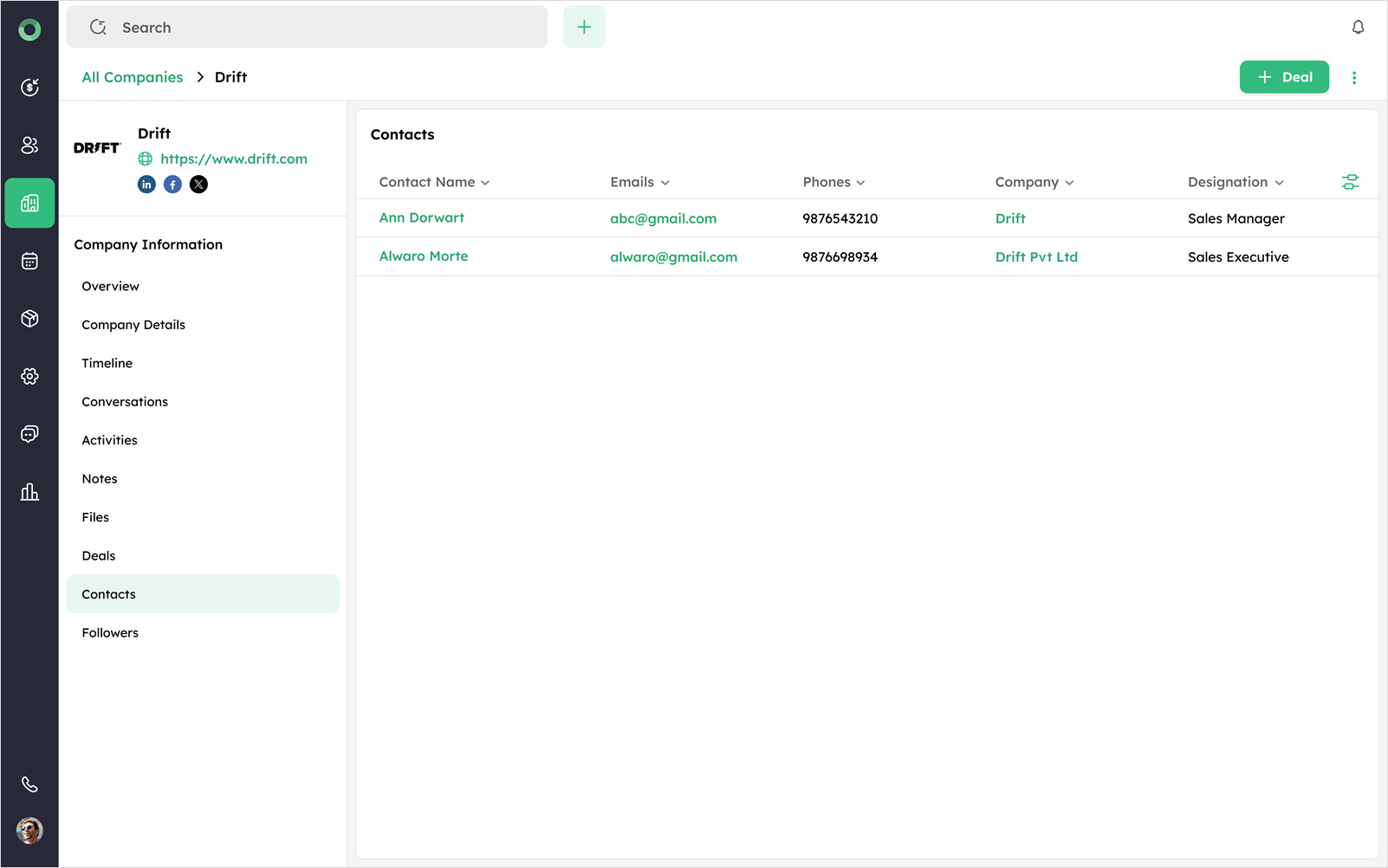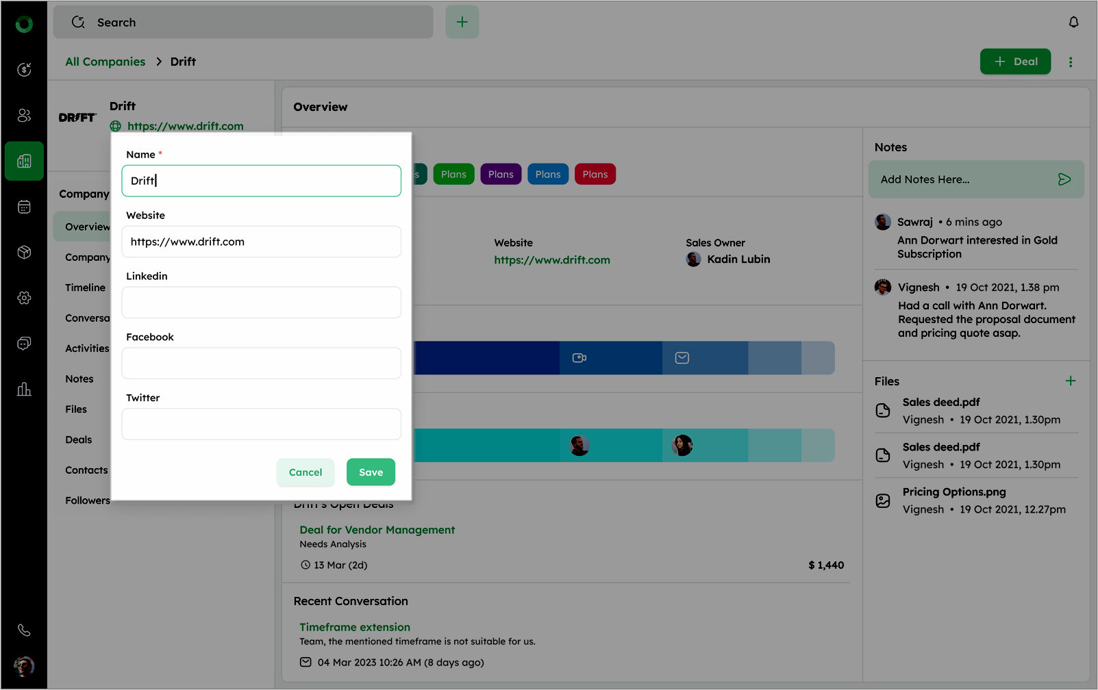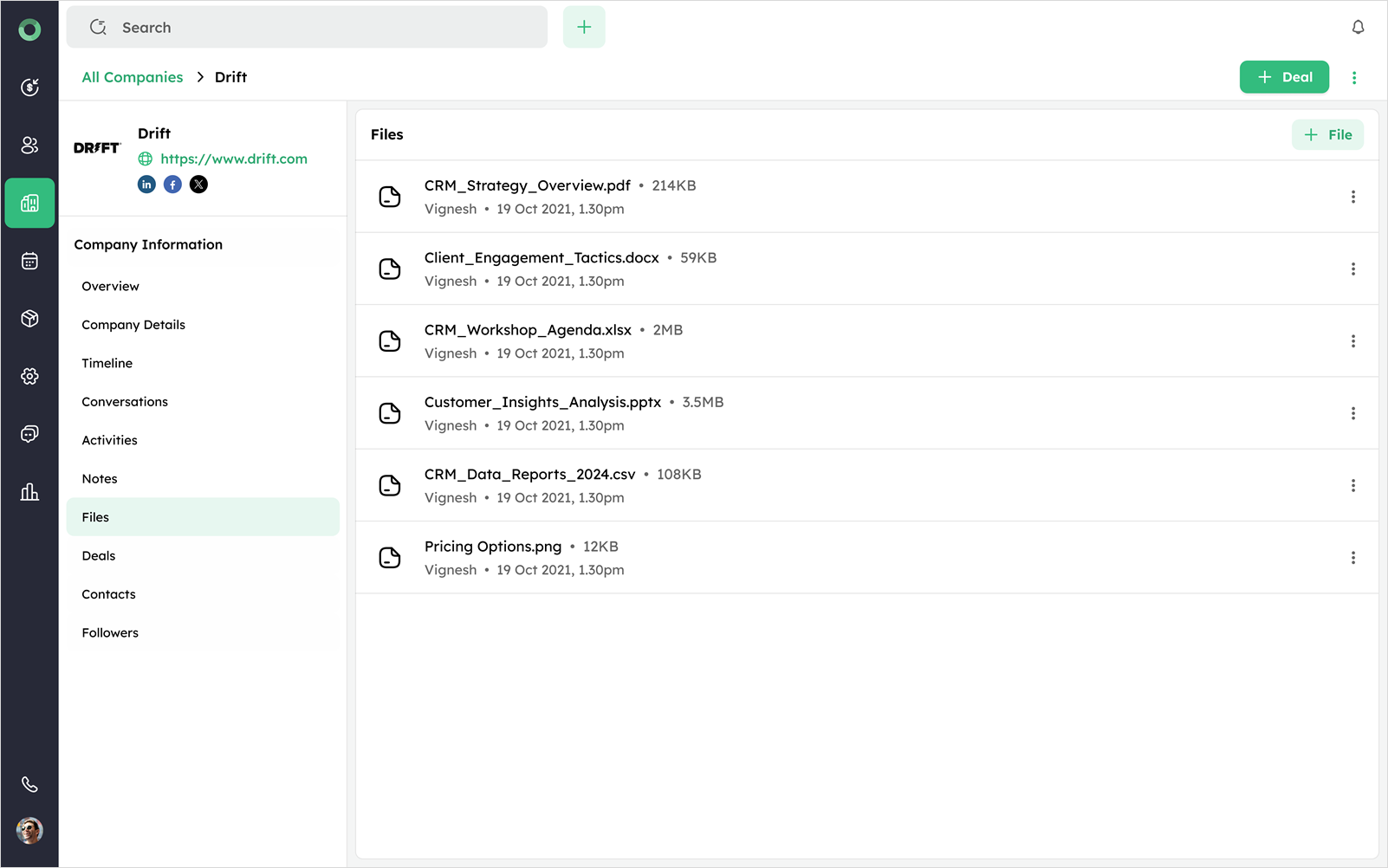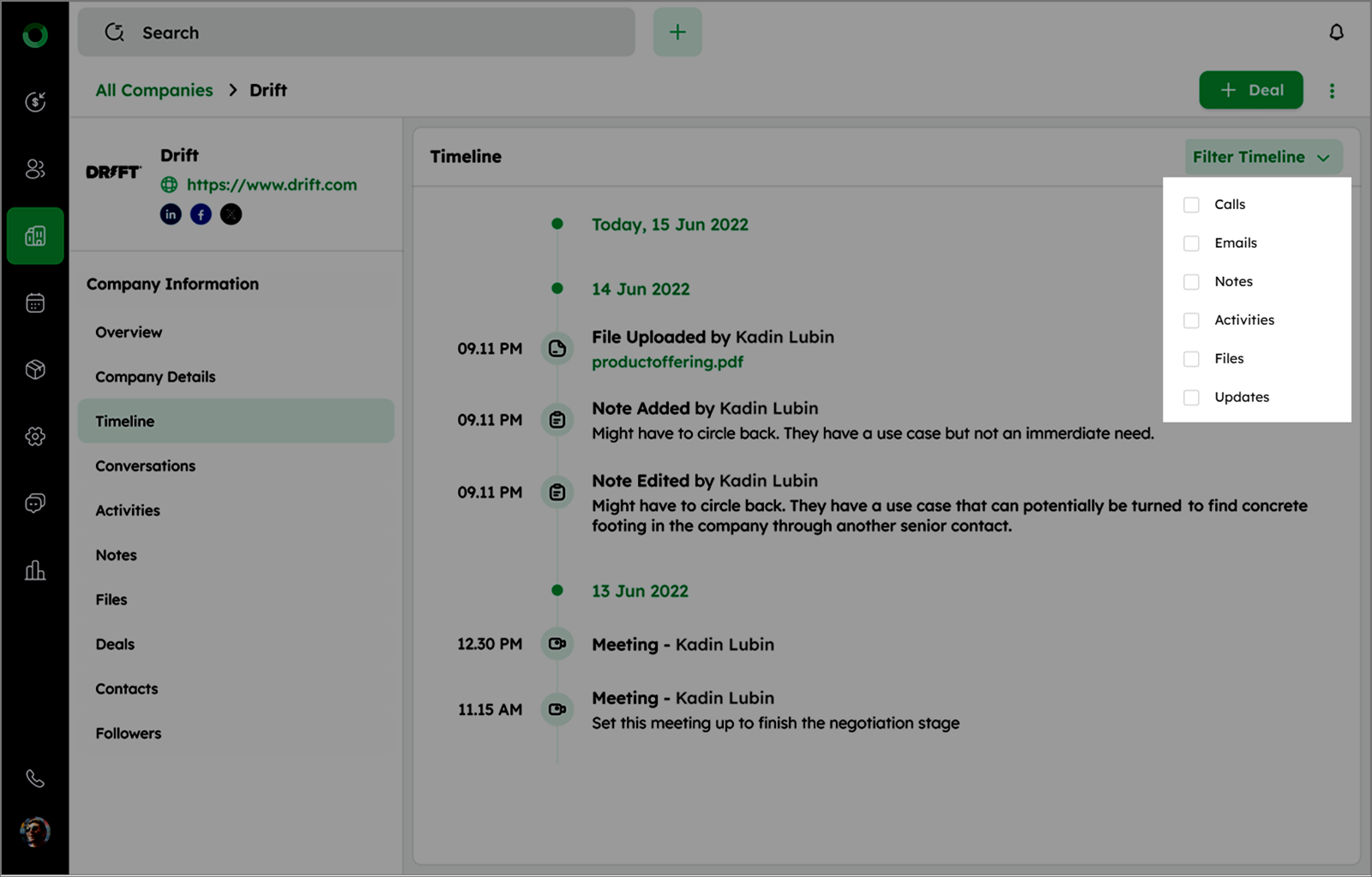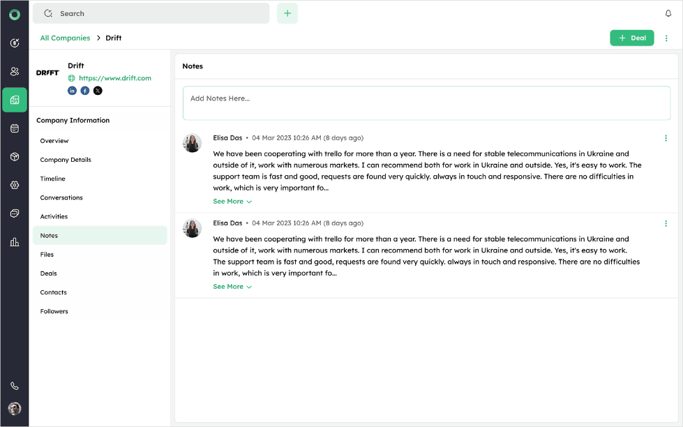 To create a new deal directly from the Company Detail Page, use the + Deal option. This feature allows you to link a deal with the selected company without navigating from the Company's profile.