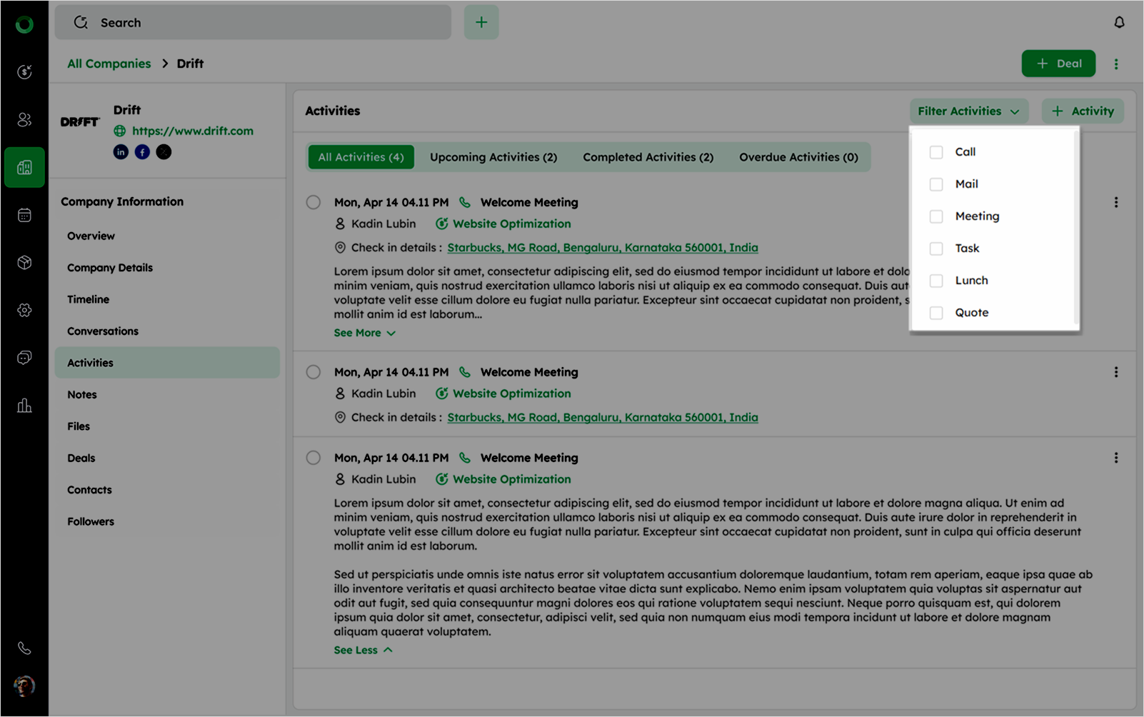 - Use the Filter Activities option on the top right to filter by activity type.