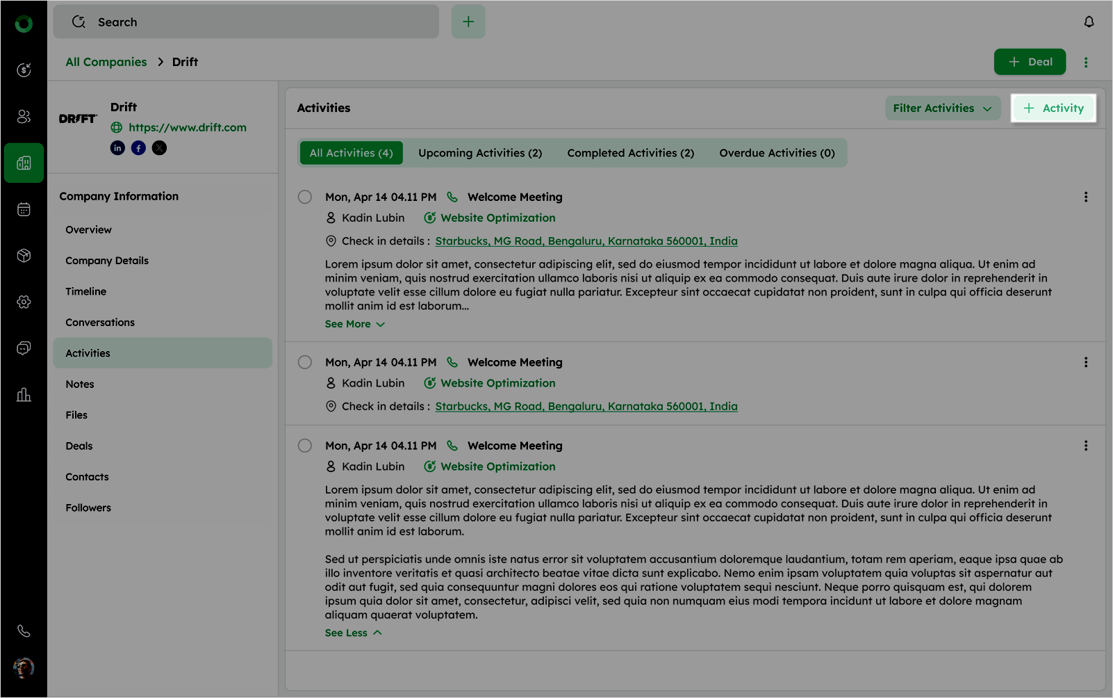 - Go to Upcoming Activity to review scheduled activities or add a new one using +Add Activity.