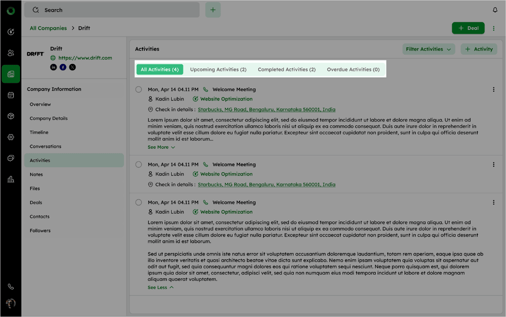 Go to the Activities section to view scheduled and completed tasks related to the company.