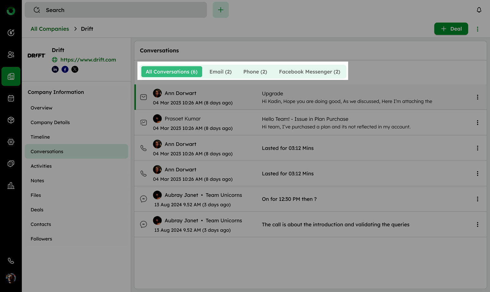 Use the toggles at the top to switch between different communication channels, such as All Conversations, Email, Phone, and Facebook Messenger.
