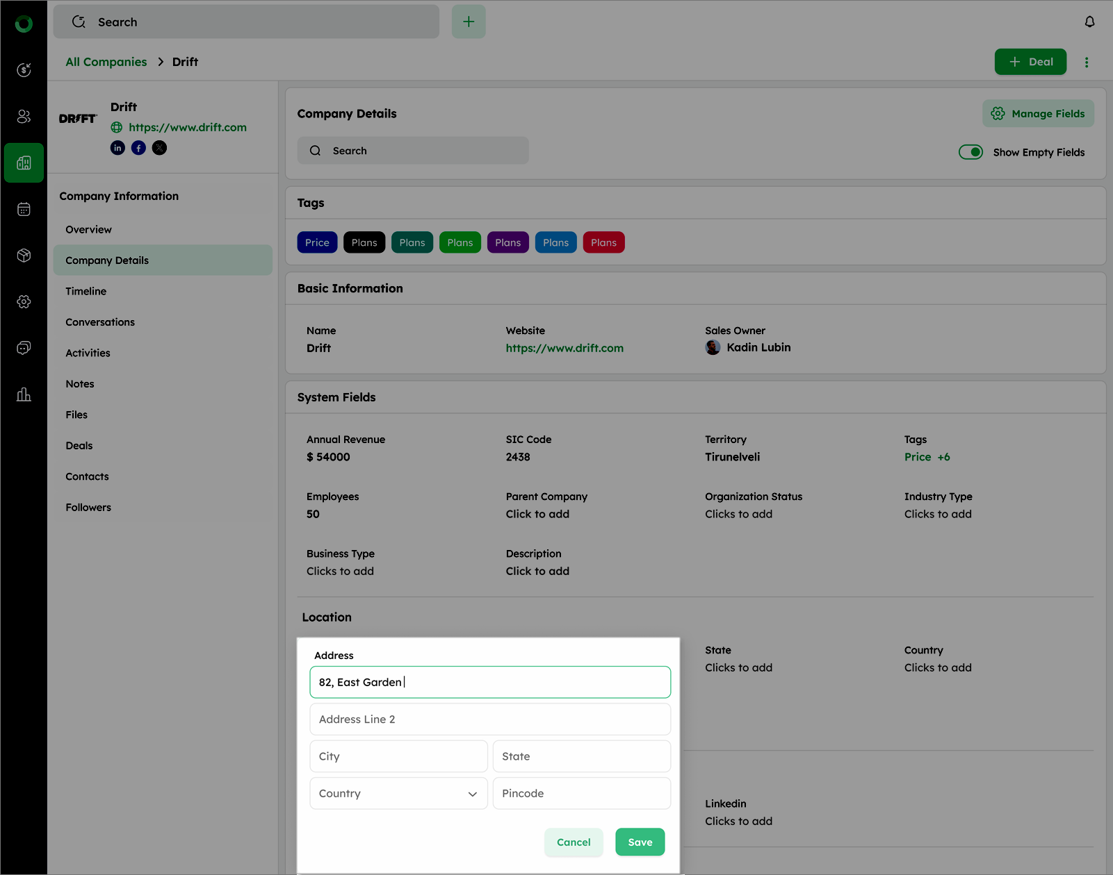 Edit option from ellipsis menu, leads to open the Update Company drawer. The drawer displays all the fields related to the company, you can modify these details as needed, such as updating the Name, Website, Sales Owner, or Address. After making the necessary changes, simply save the updates to apply them into the company record.