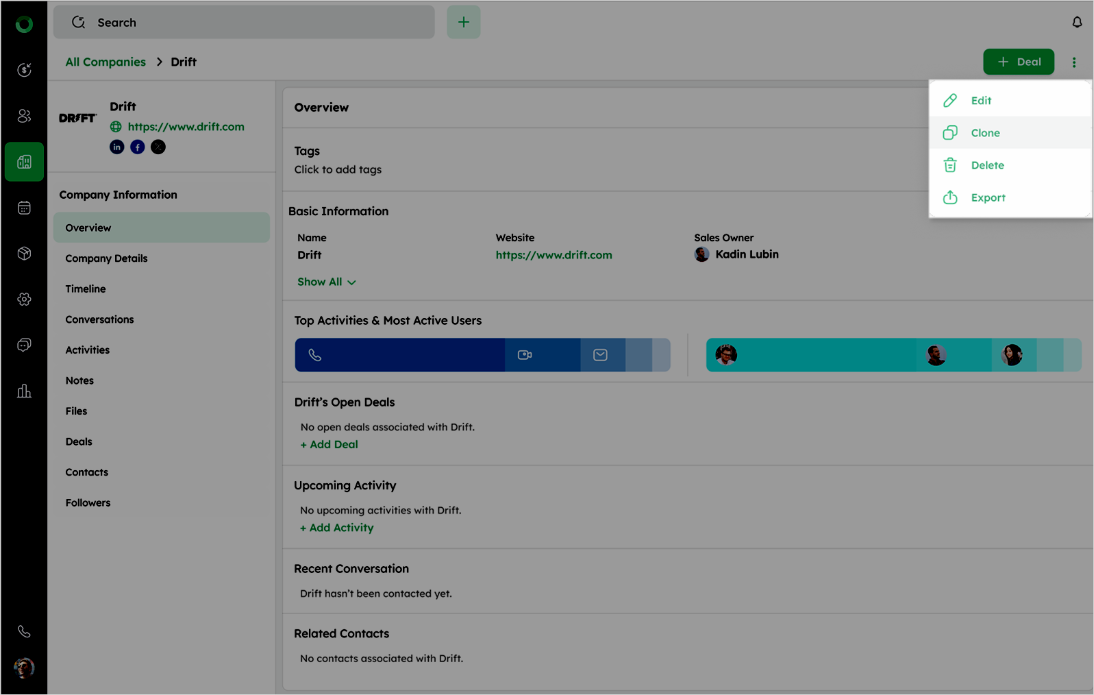 The CRM automatically populates certain fields. Editable fields are filled based on existing values, and auto-generated fields do not appear in the Clone drawer. This feature simplifies adding similar companies by eliminating the need for manual data entry.