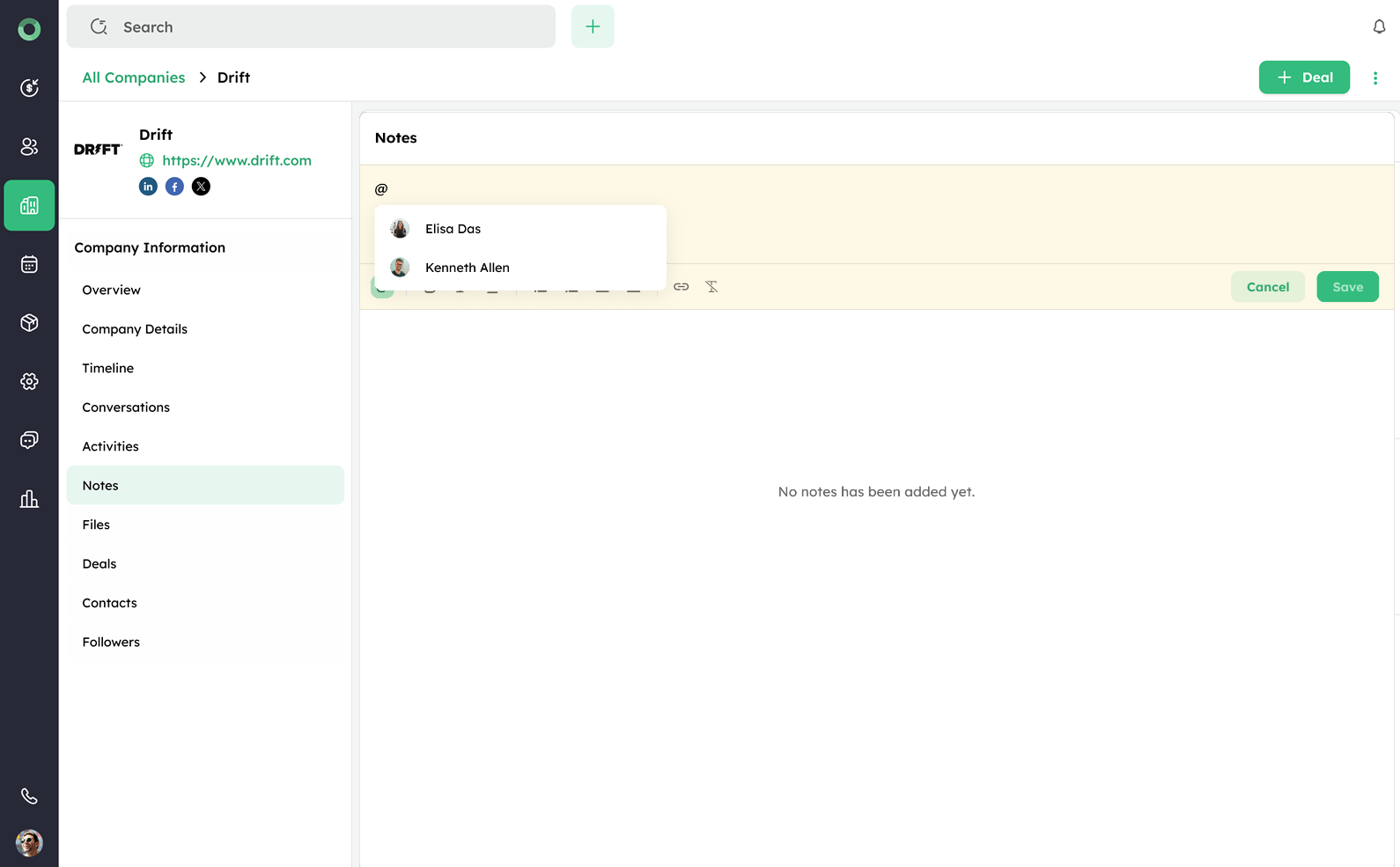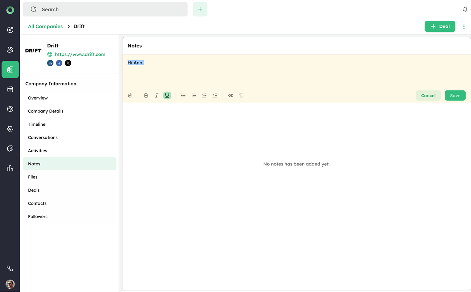 - Once all details are entered, click Save to add the deal. It will now be linked to the company and accessible from both the Company profile and the Deals section.