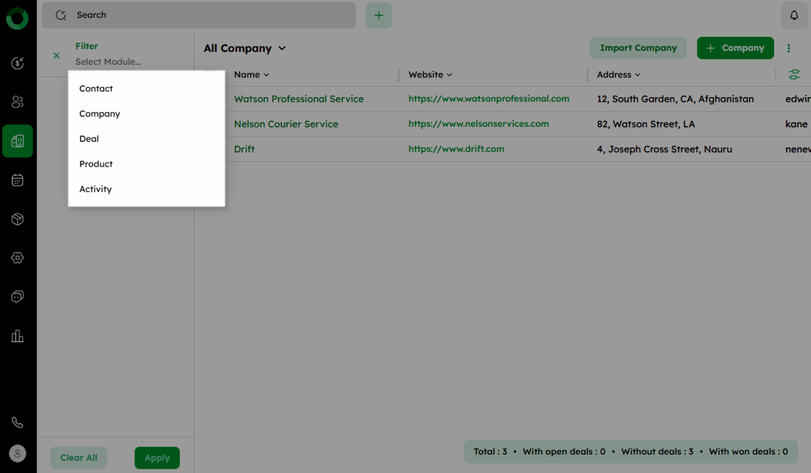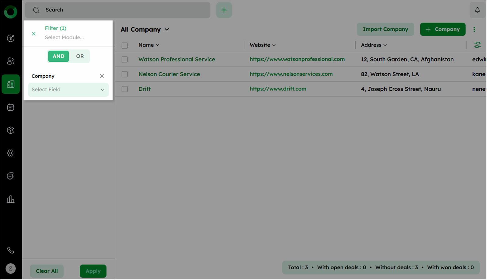 Access the Company List View page where you want to filter companies. Click the filter icon located at the top left corner of the page.