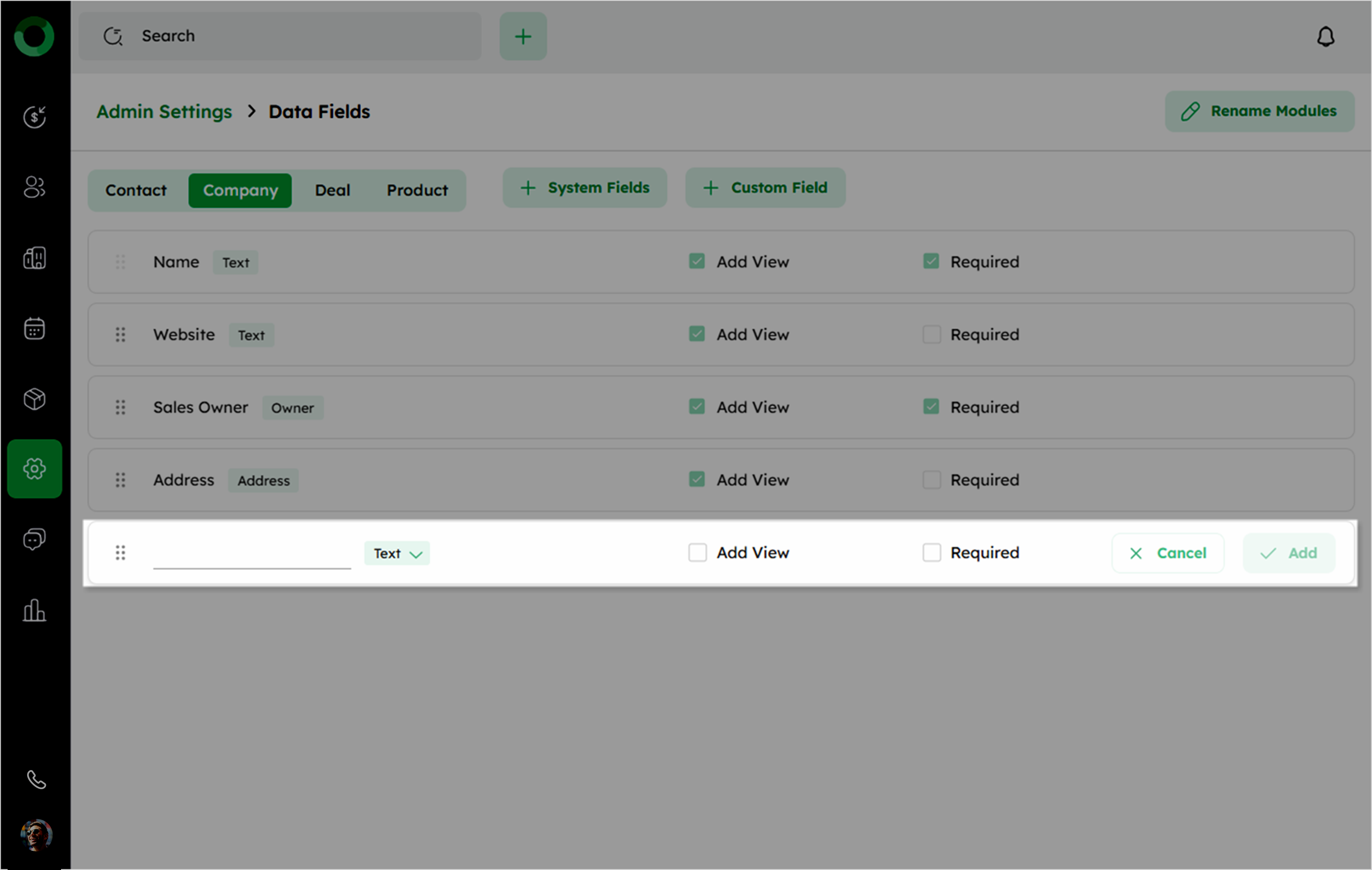 - Enter the field name and select options such as Add View or Required to ensure the field's visibility and mark it as mandatory.