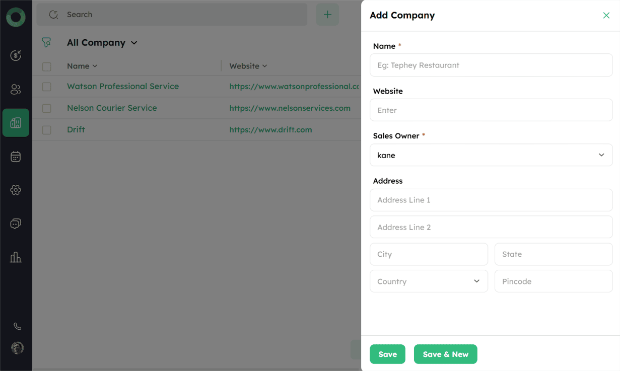 Add a company in Twozo to foster a streamlined communication for efficient relationship management. You can add Name, Website, Sales Owner, and Address as essential details to quickly fetch the information without searching through external sources. This feature connects relevant contacts and assigns sales owners to enhance your overall workflow and effective sales.