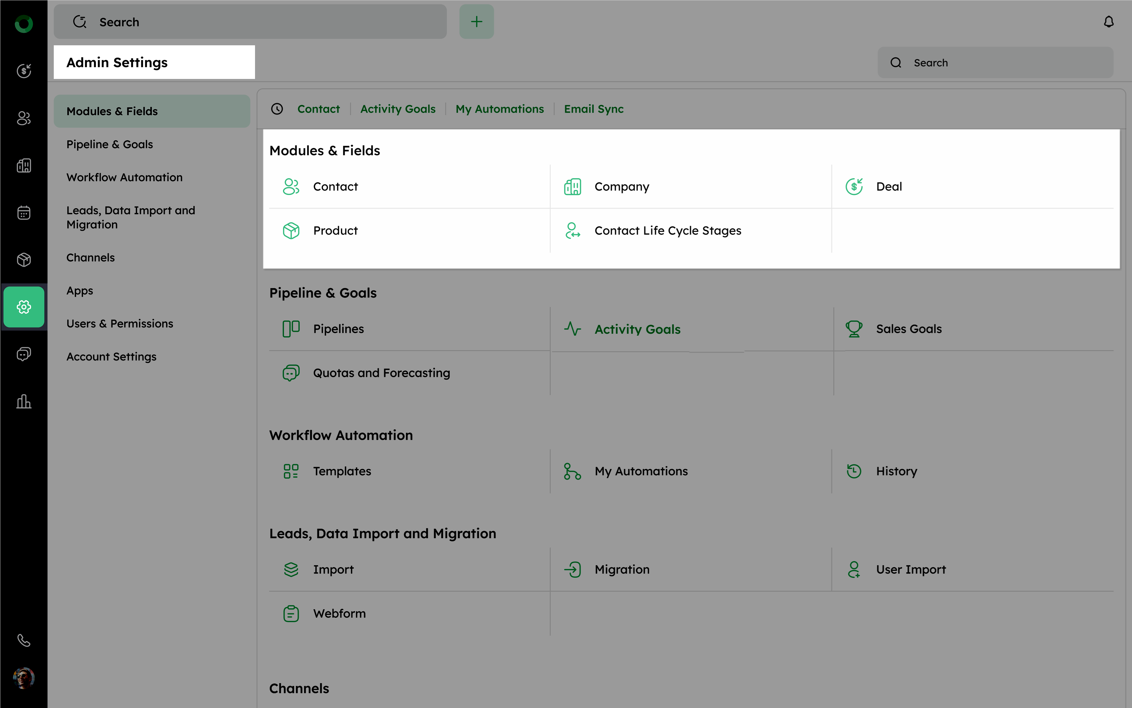 Choose the specific field you want to apply from the drop-down menu, such as Contact, Company, Deal, Product, or Activity.