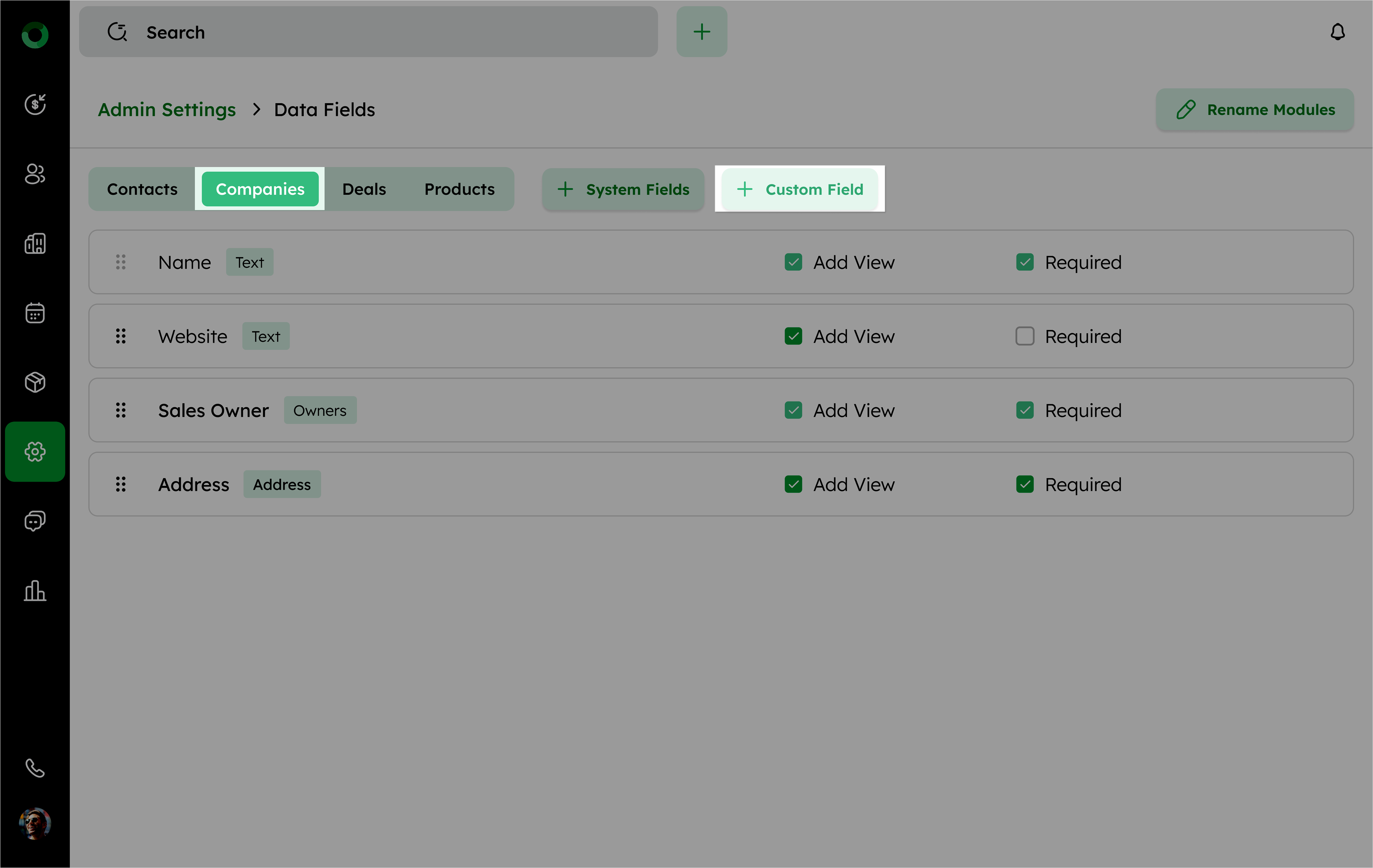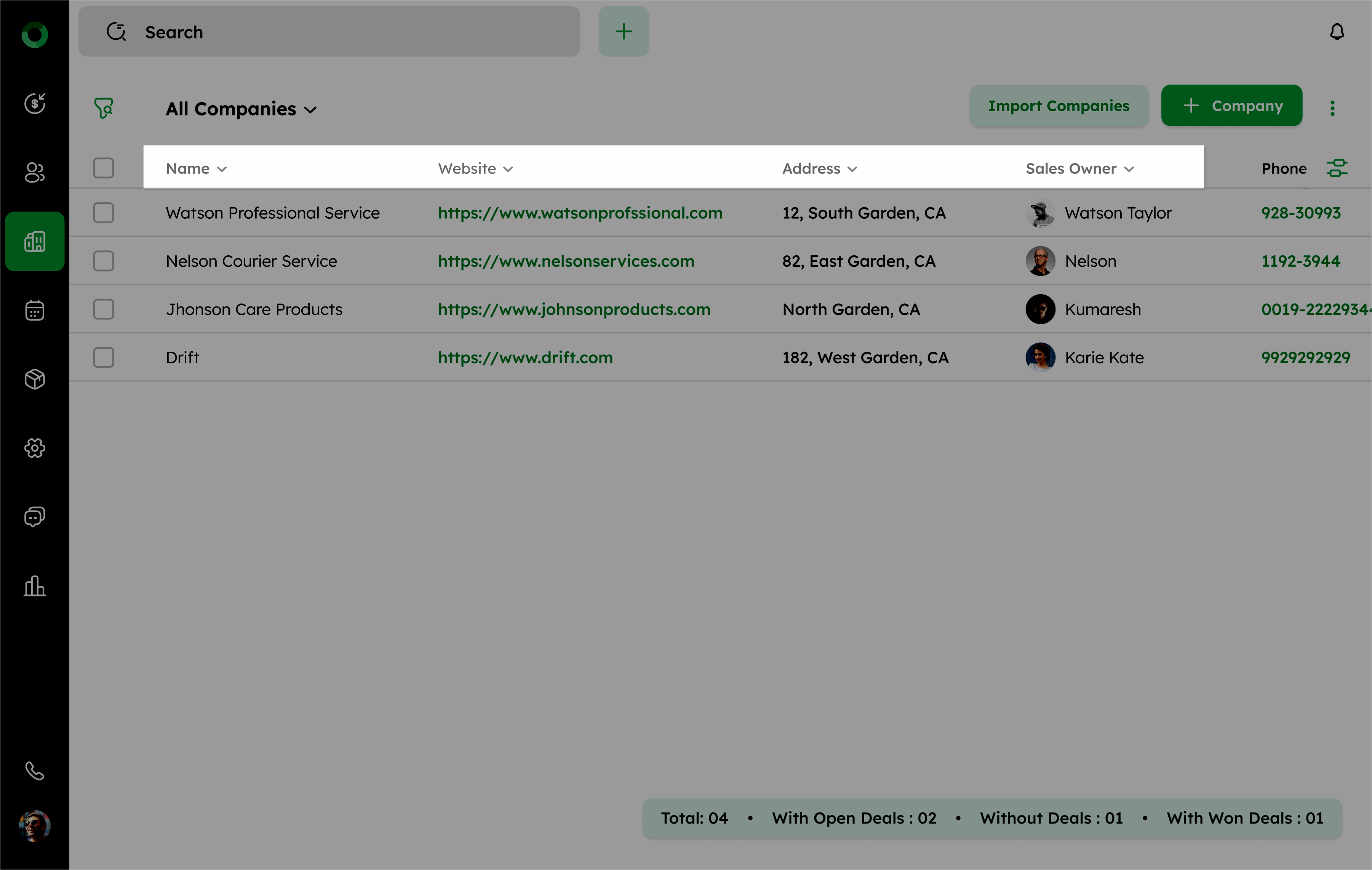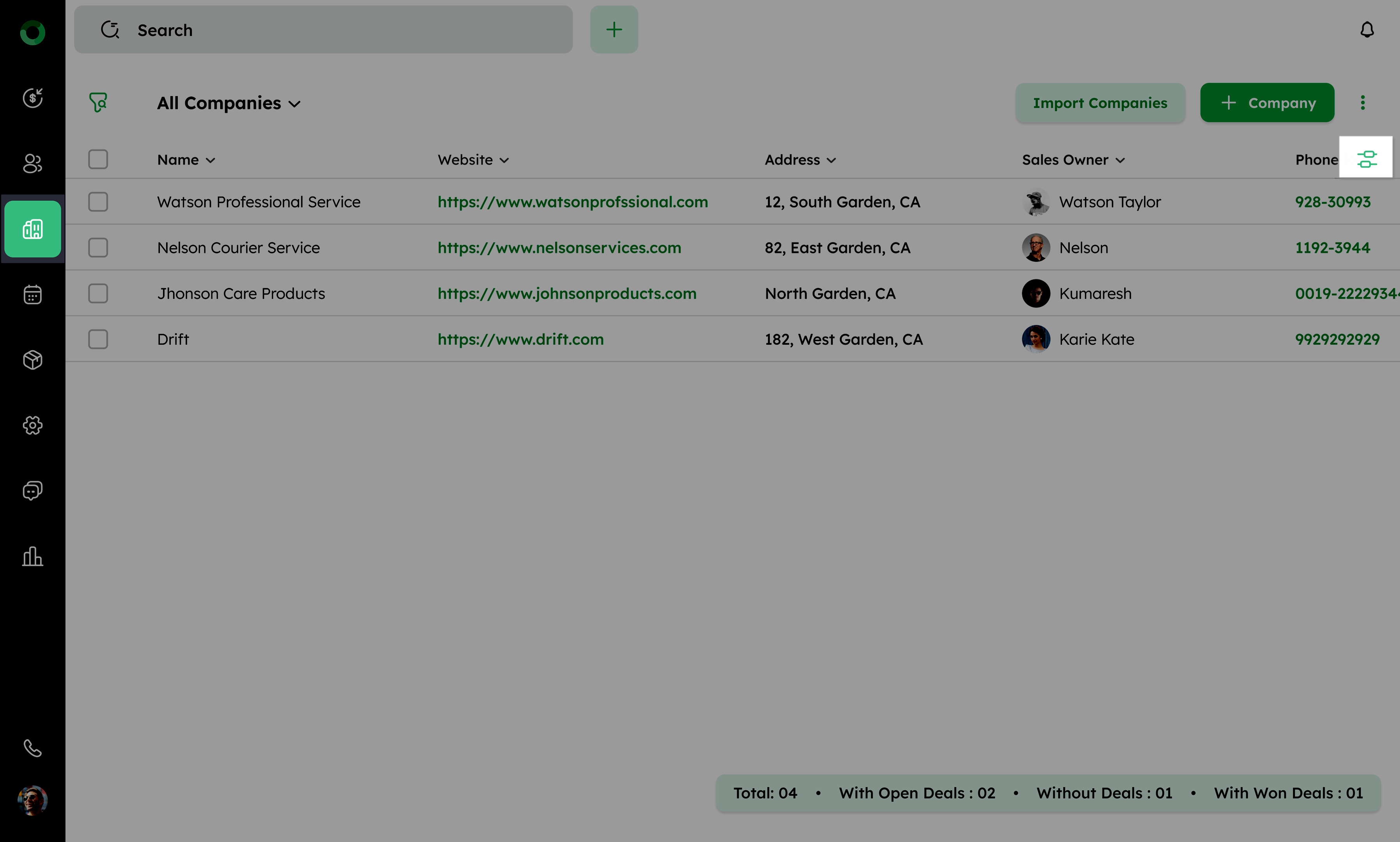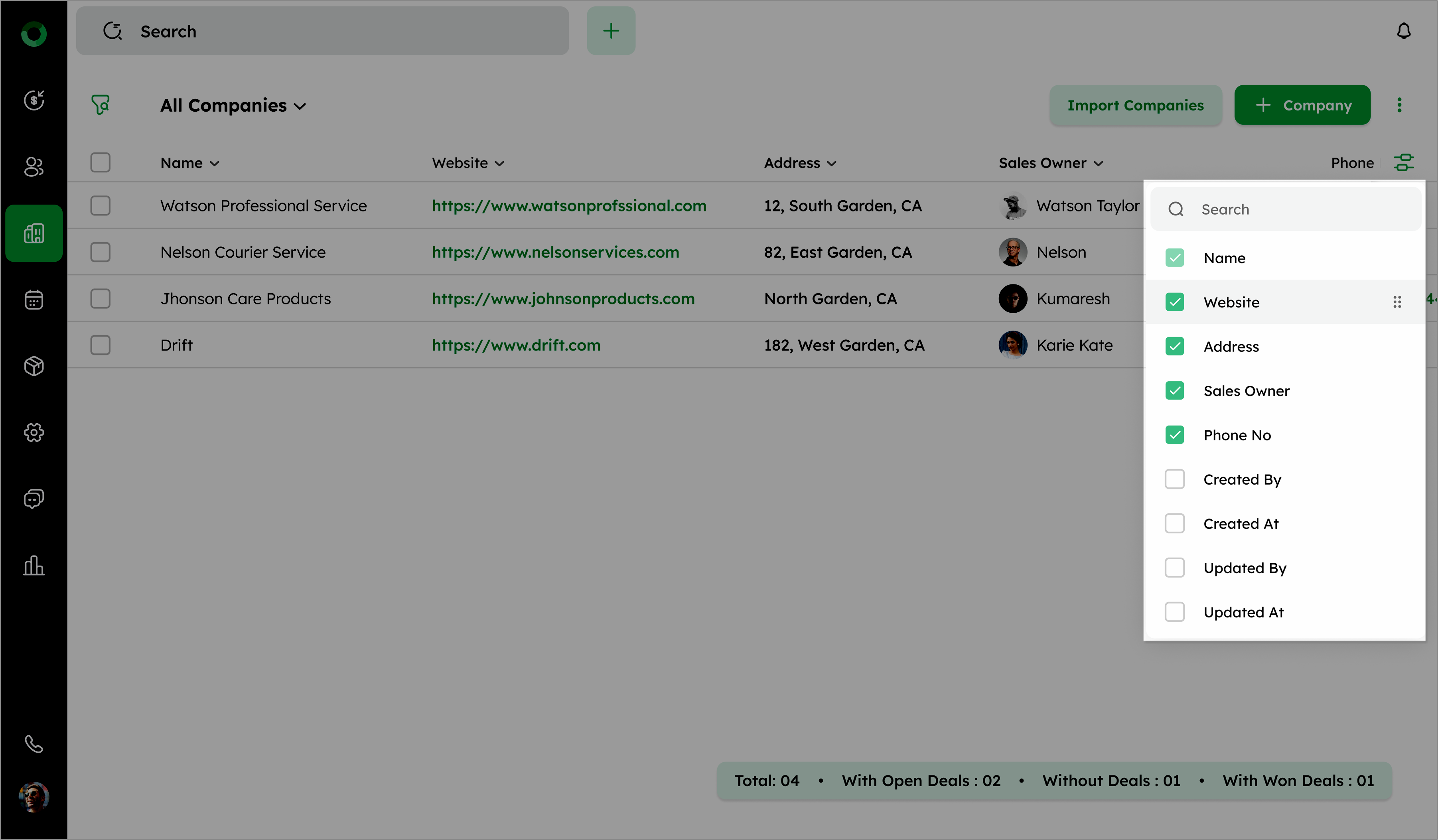 Twozo offers you customize the Company List View to easily access the information you need. Add or remove columns to highlight key details, making data management faster and more organized. By default, the visible fields include Name, Website, Sales Owner, and Address, and these fields can be customized as needed.