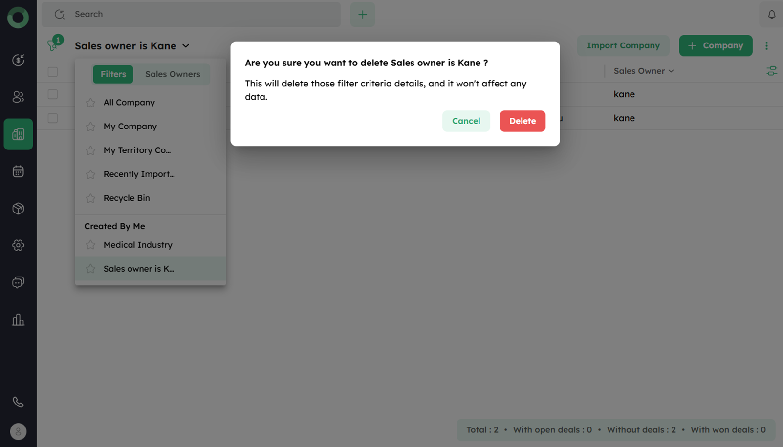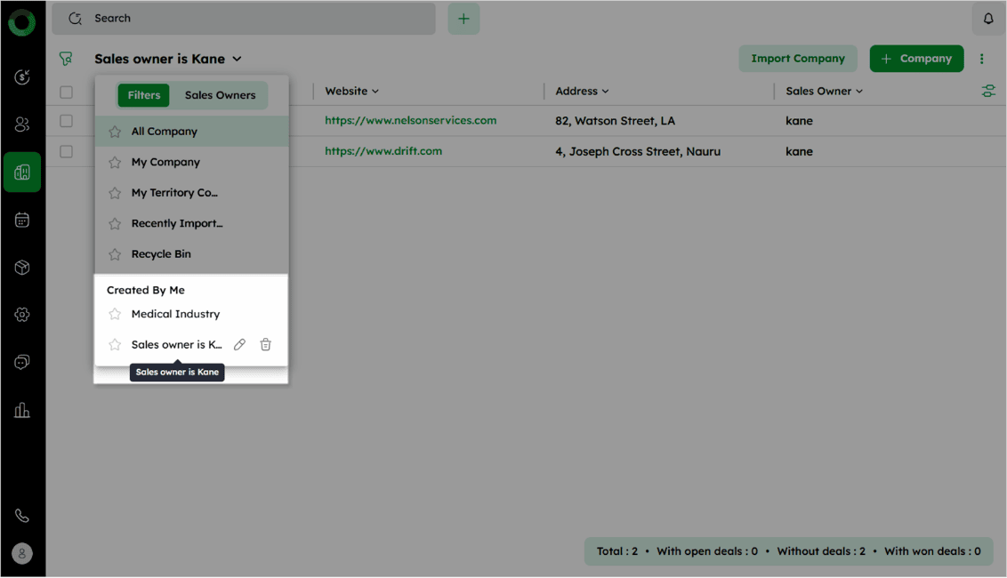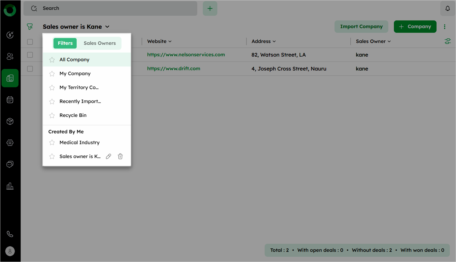 - Twozo CRM includes predefined filters such as All Company, My Company, My Territory Company, Recently Imported, and Recycle Bin. You can also filter companies by Sales Owners for quick access.