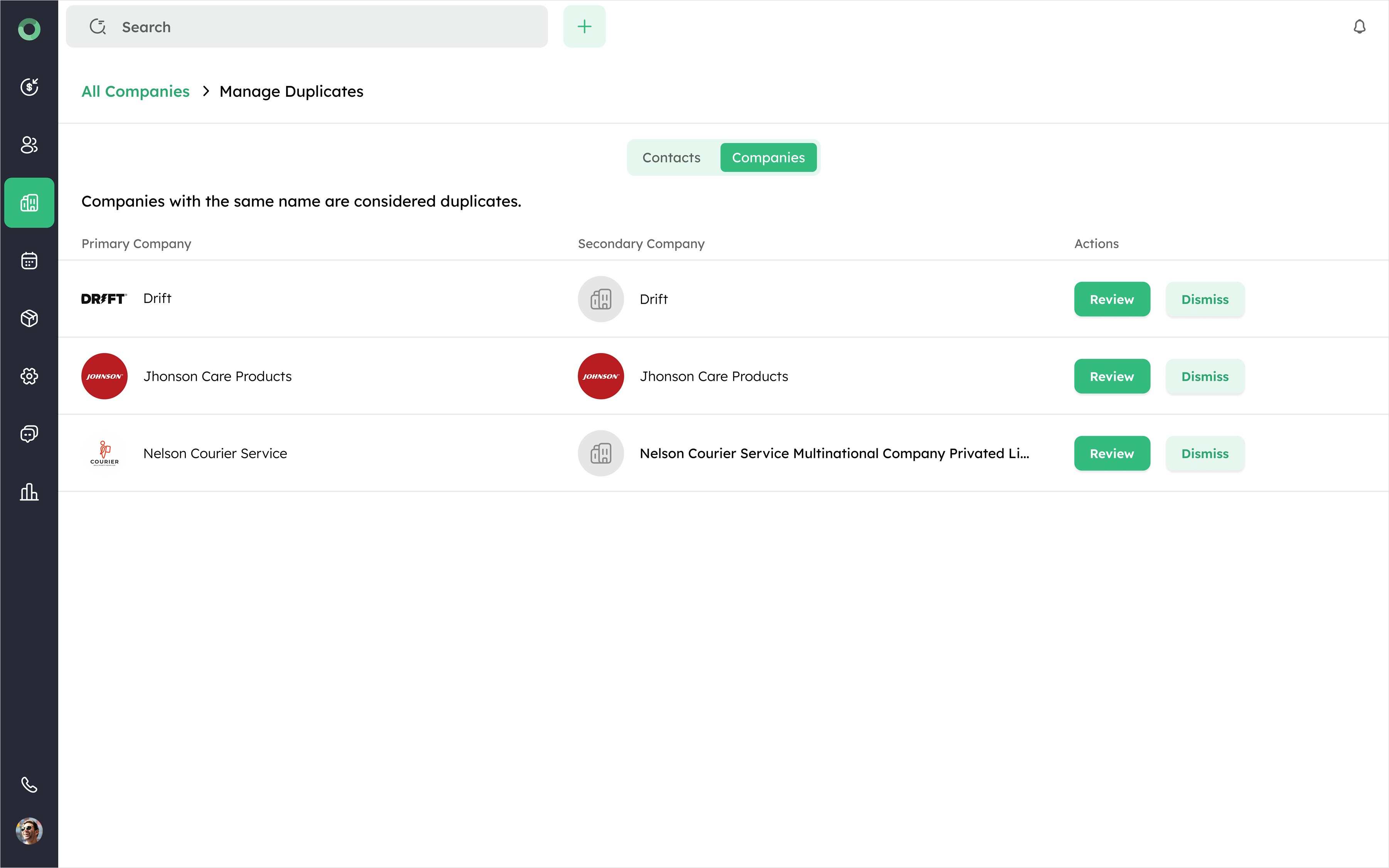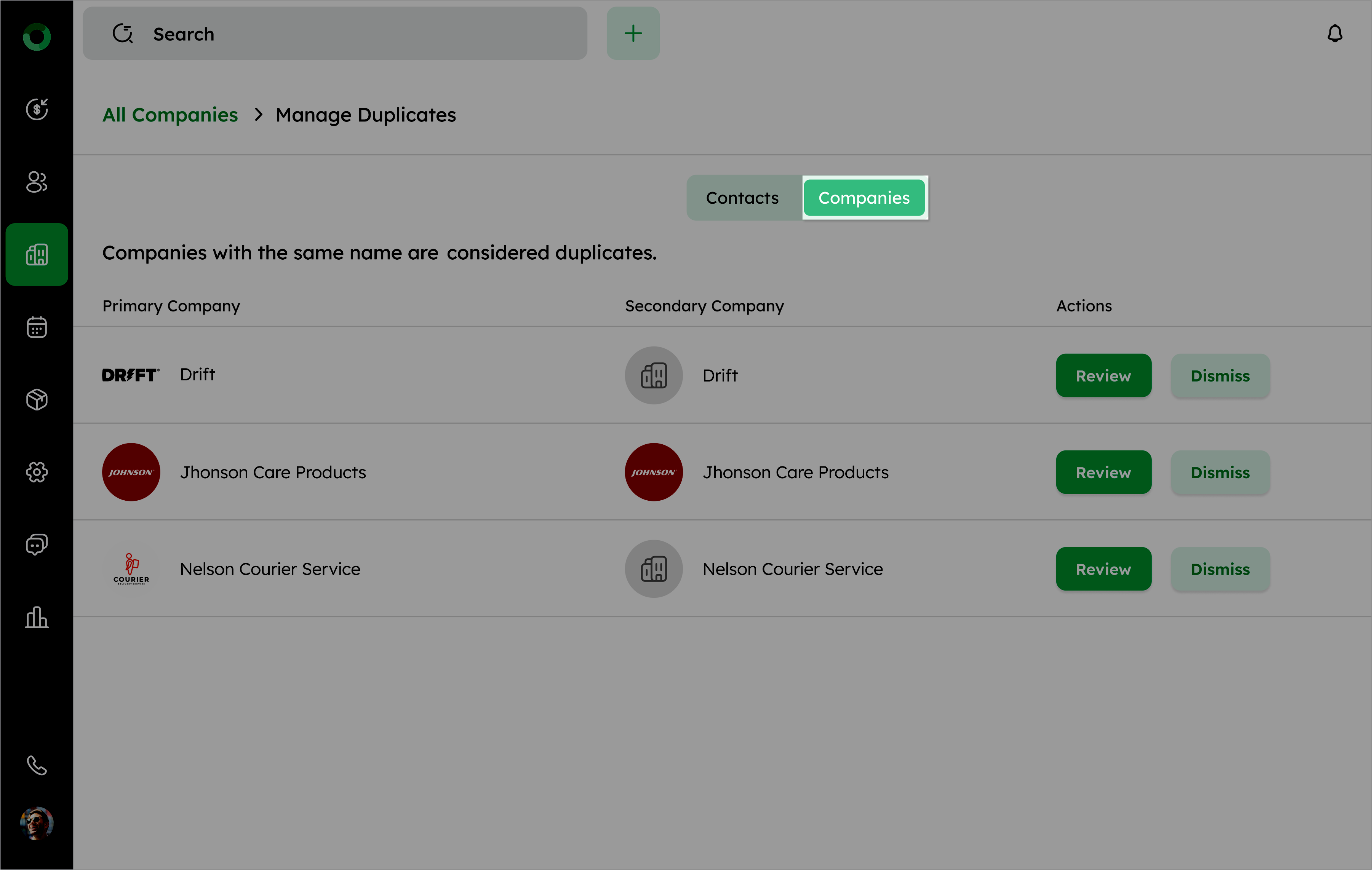 - Clicking Dismiss will temporarily remove the company from the duplicates list. However, if a new company is later created with the same name, the duplicates will reappear.