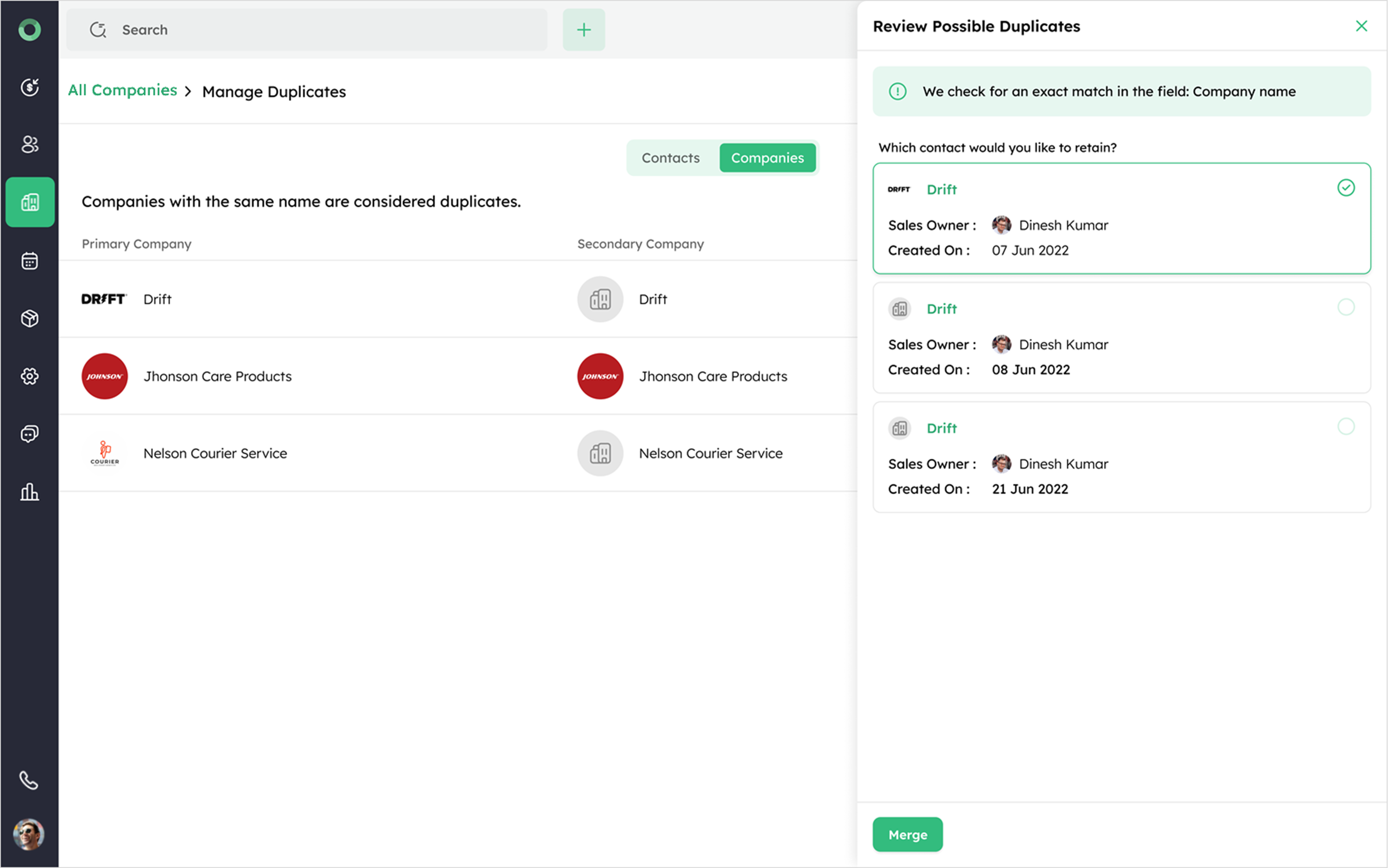 Review the list of potential duplicates based on exact matches in the Company Name field.