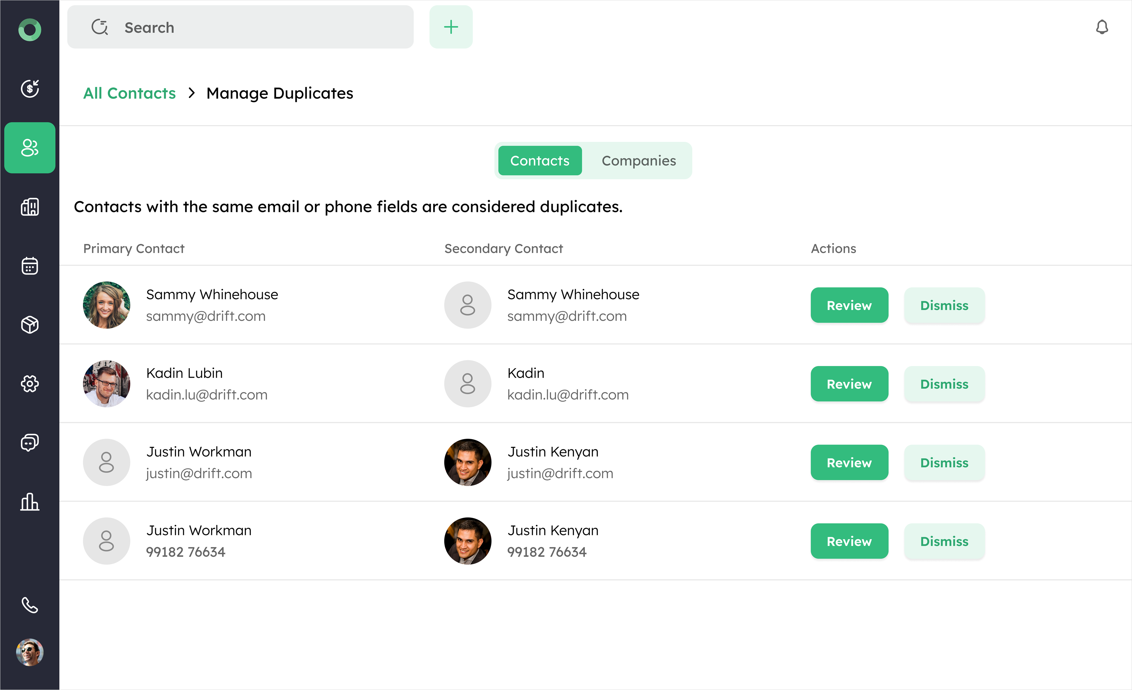- Click the Review button to open the Review Possible Duplicates window. This window displays the contact's name, profile, email, and phone number.