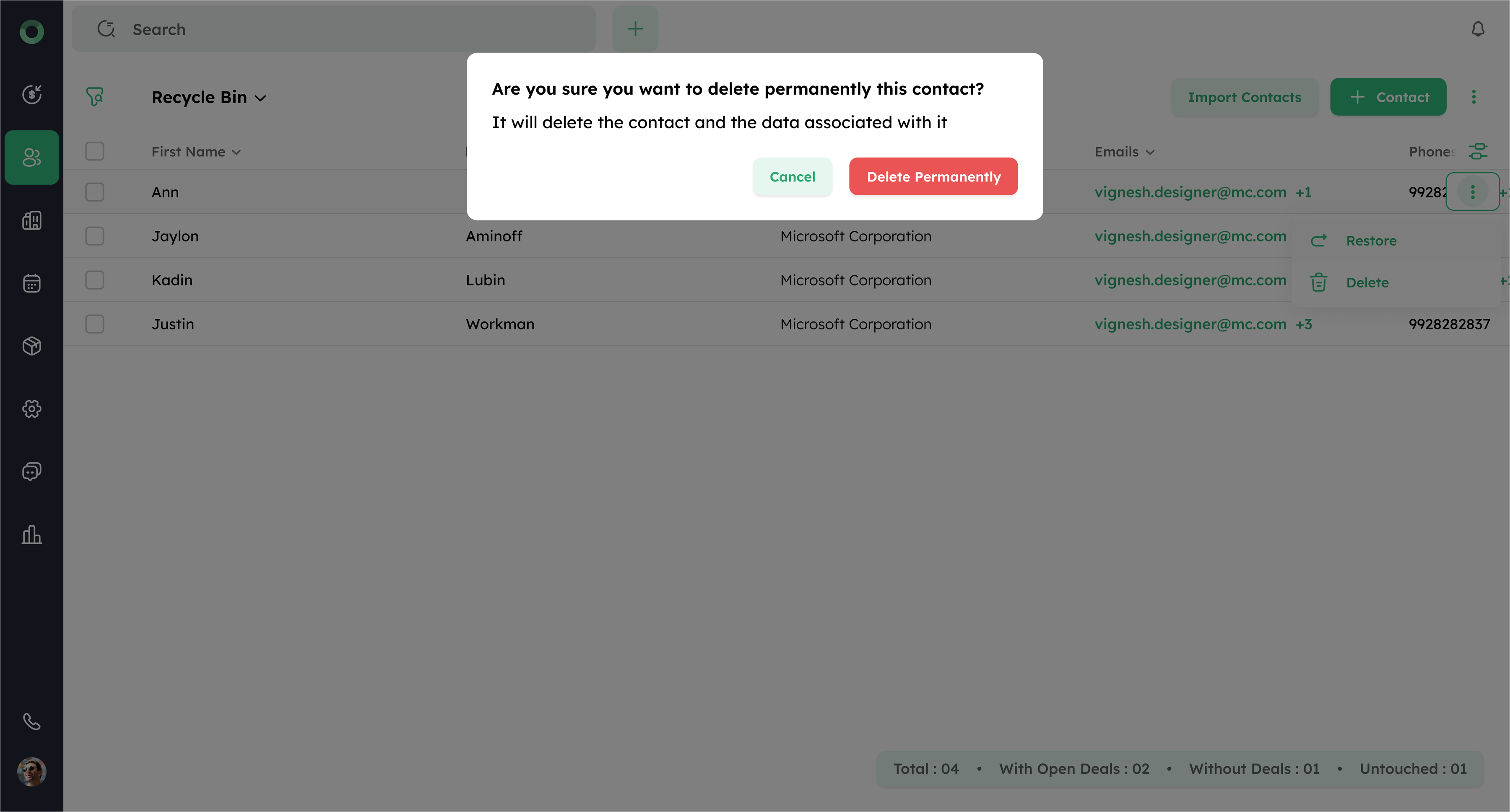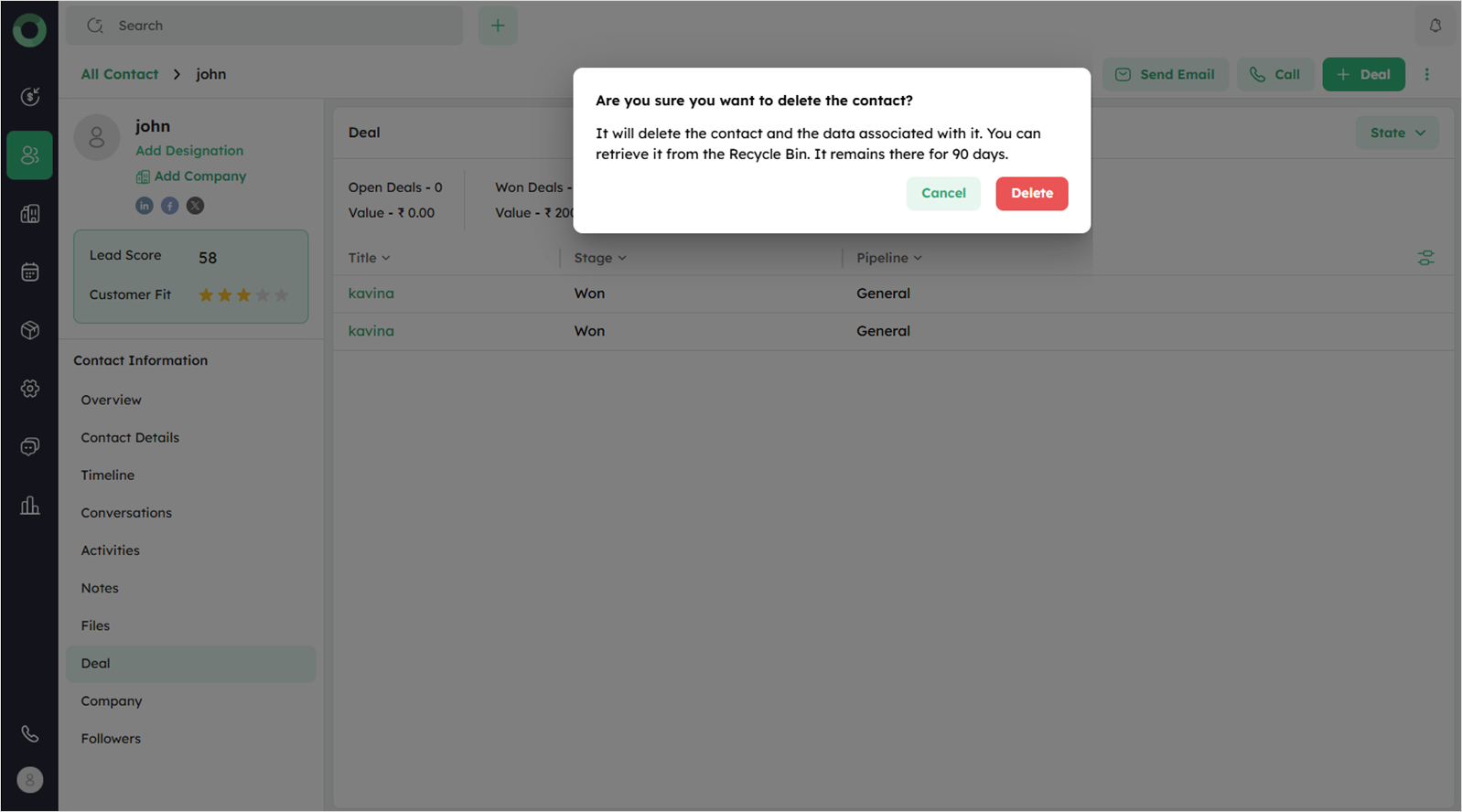You can delete a contact from its Detail View or use bulk actions to delete multiple contacts at once from the list view. The deleted contact will be moved to the Recycle Bin folder.