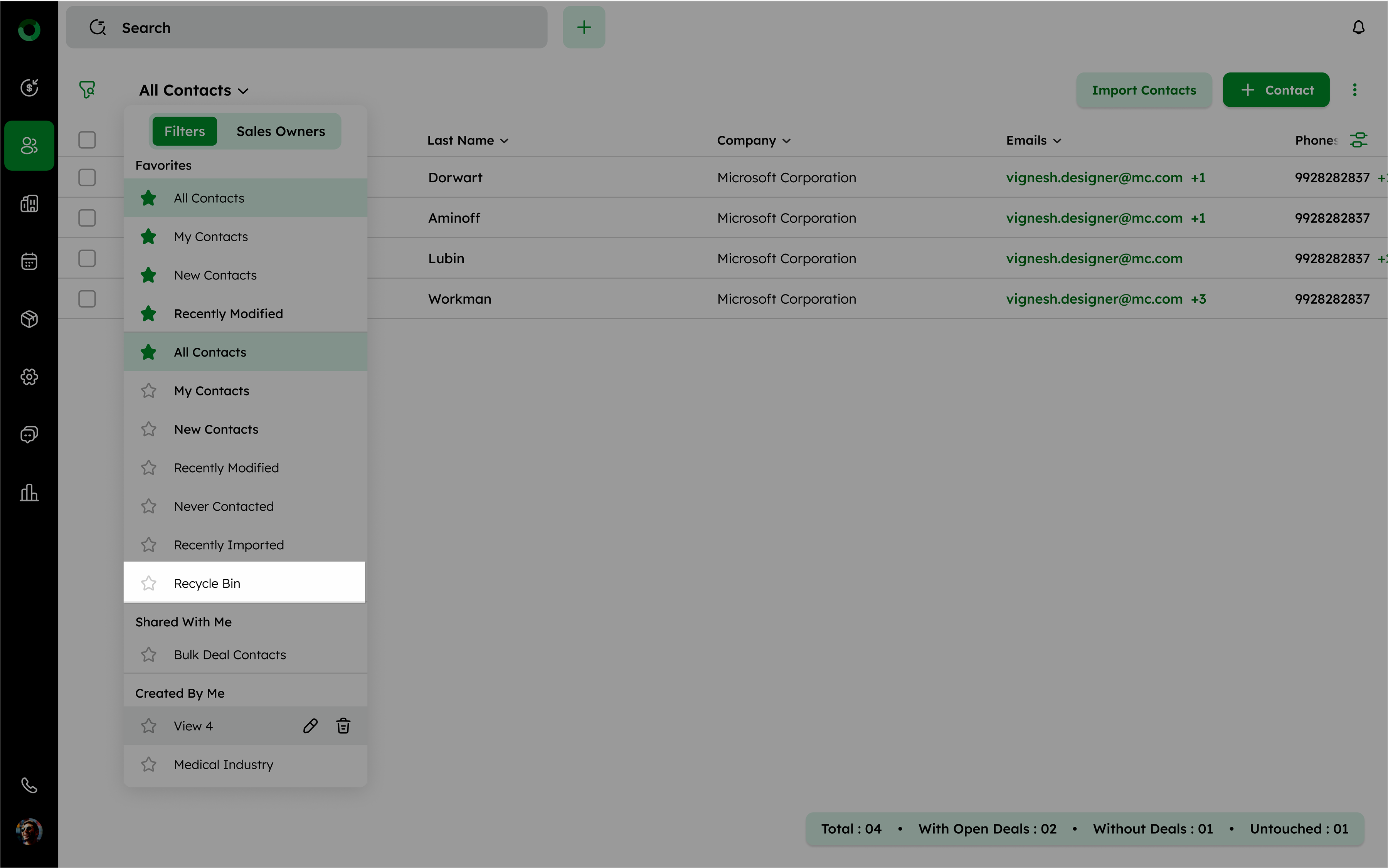 - Click on the Recycle Bin located at the bottom of the Filters option. This will navigate you to another screen where all deleted contacts are listed.