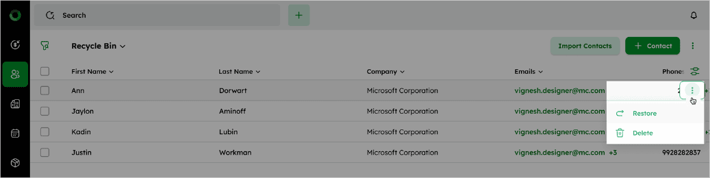 - To restore a contact, click the ellipsis (⁝) icon next to the contact you want to restore.