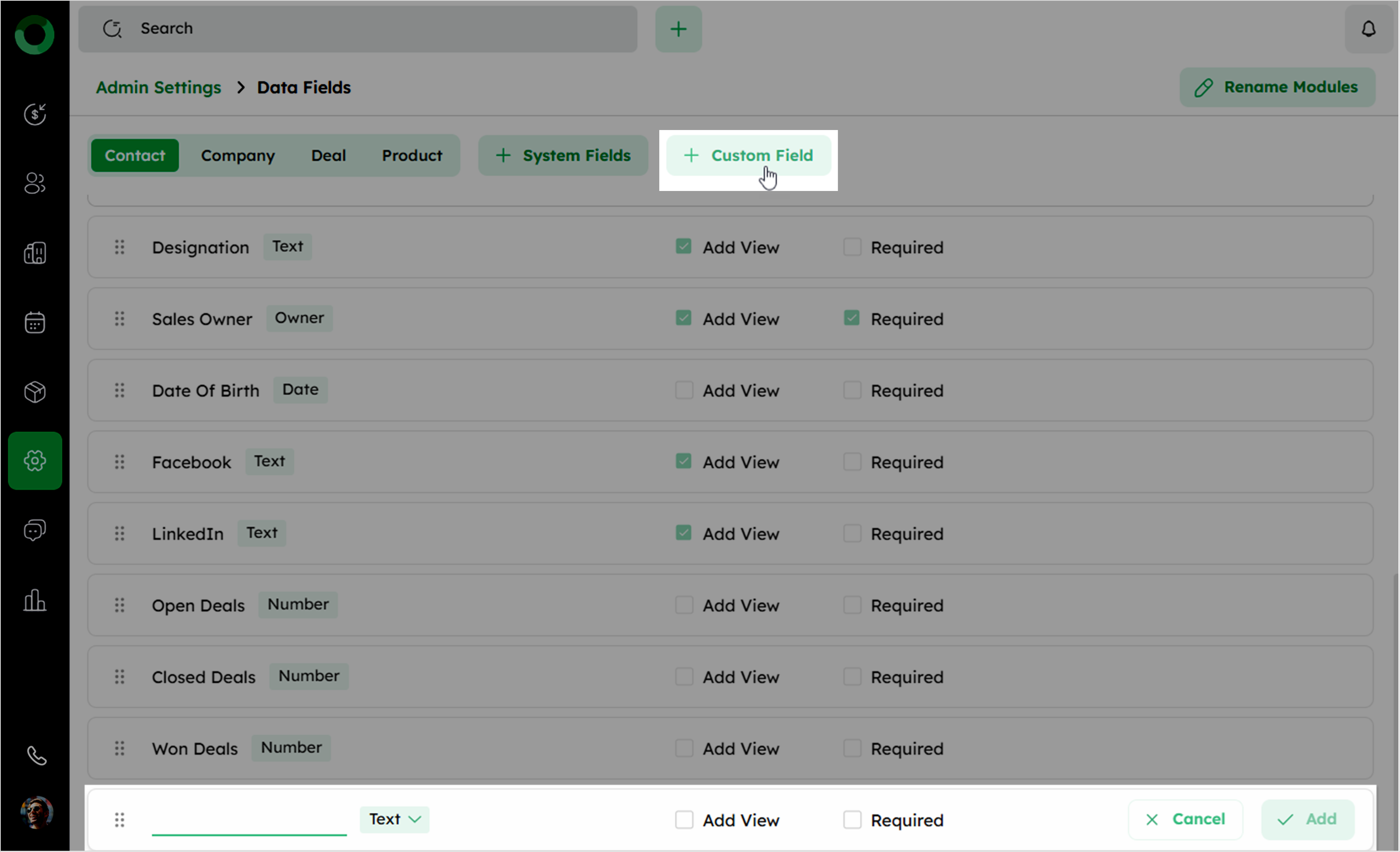 - Click on + Custom Field and specify the field name and type.