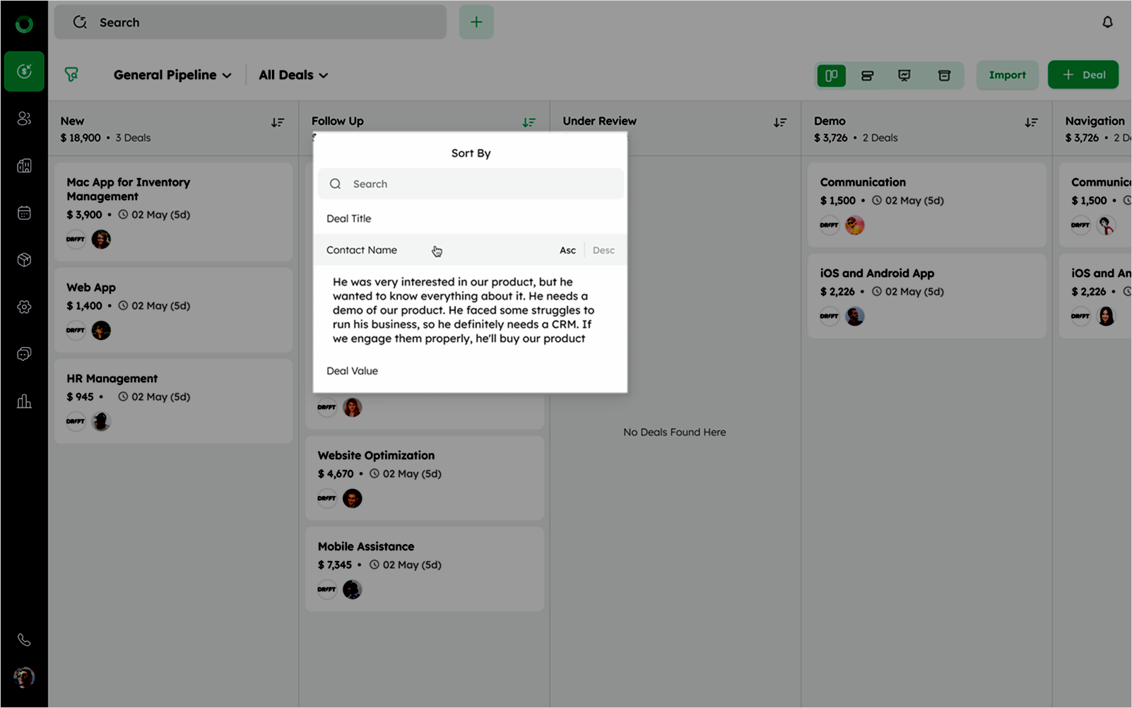 By default, deals are sorted by Created at Ascending.
