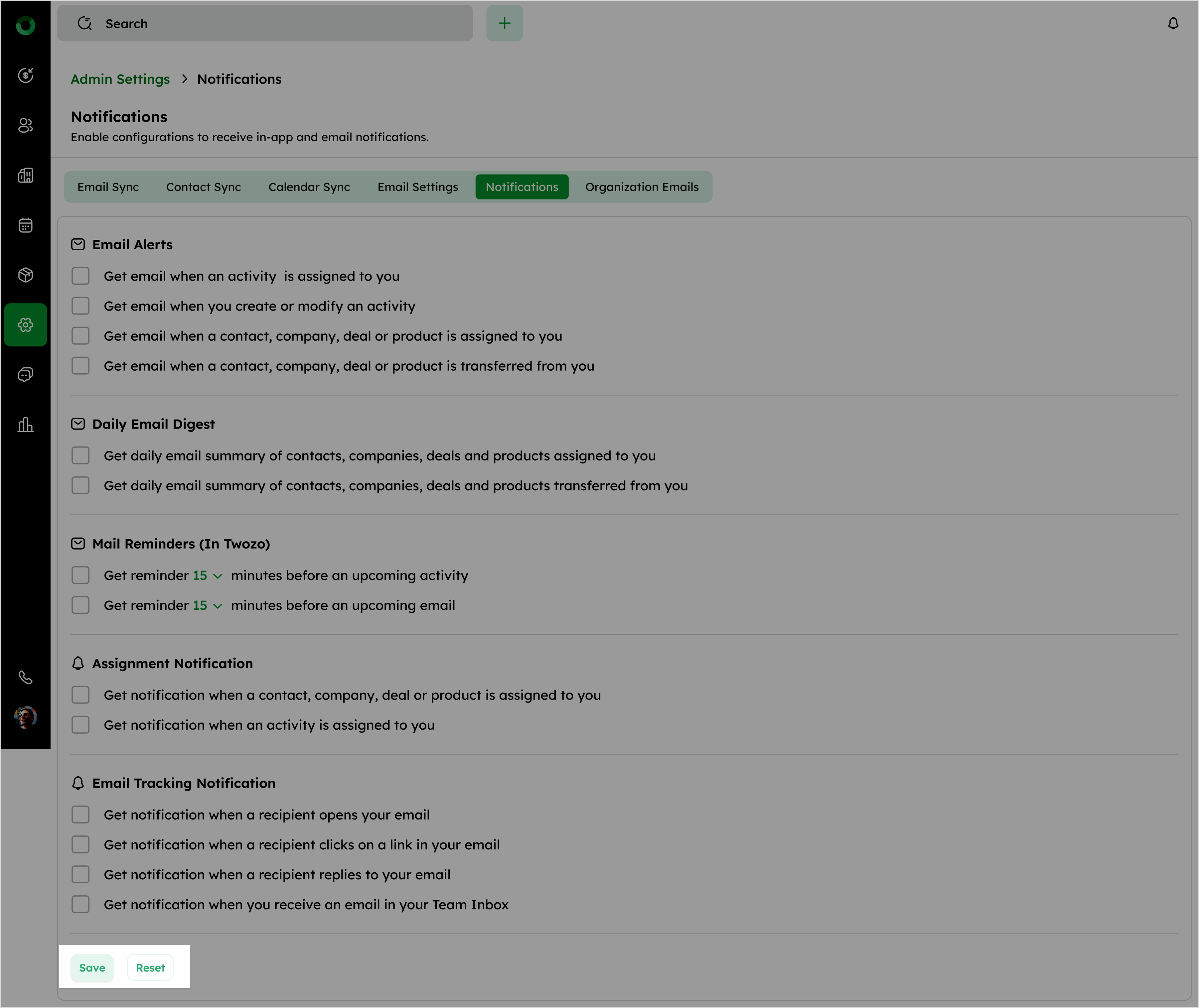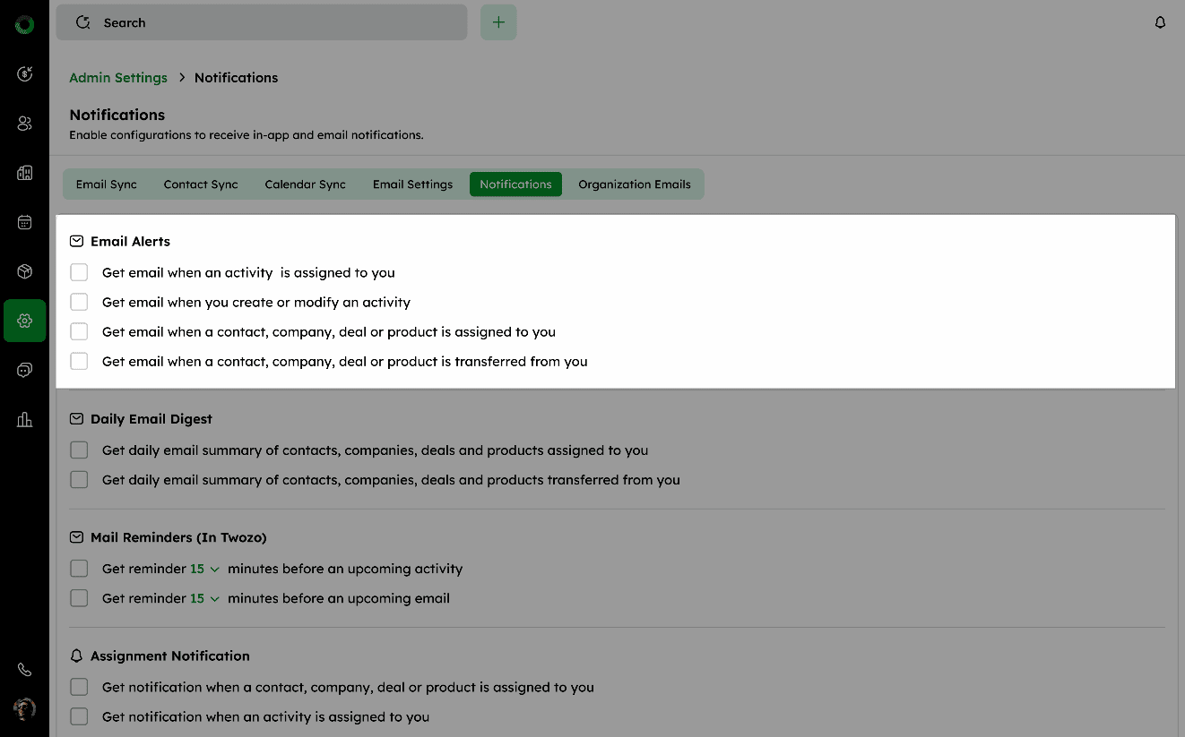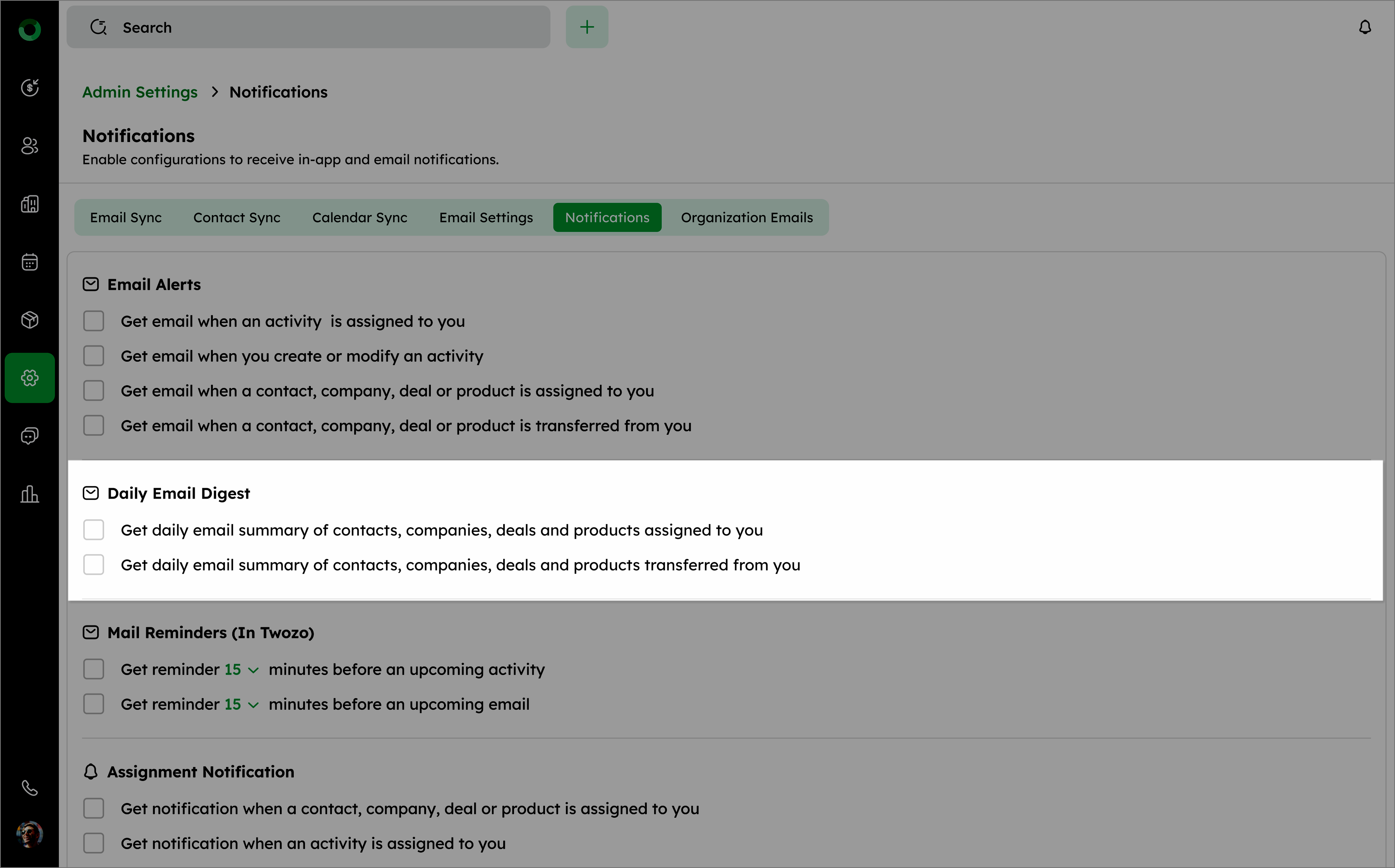 The list of settings enables you to choose on receiving email notifications of the fields that include, activities, contacts, companies, deals, and products.