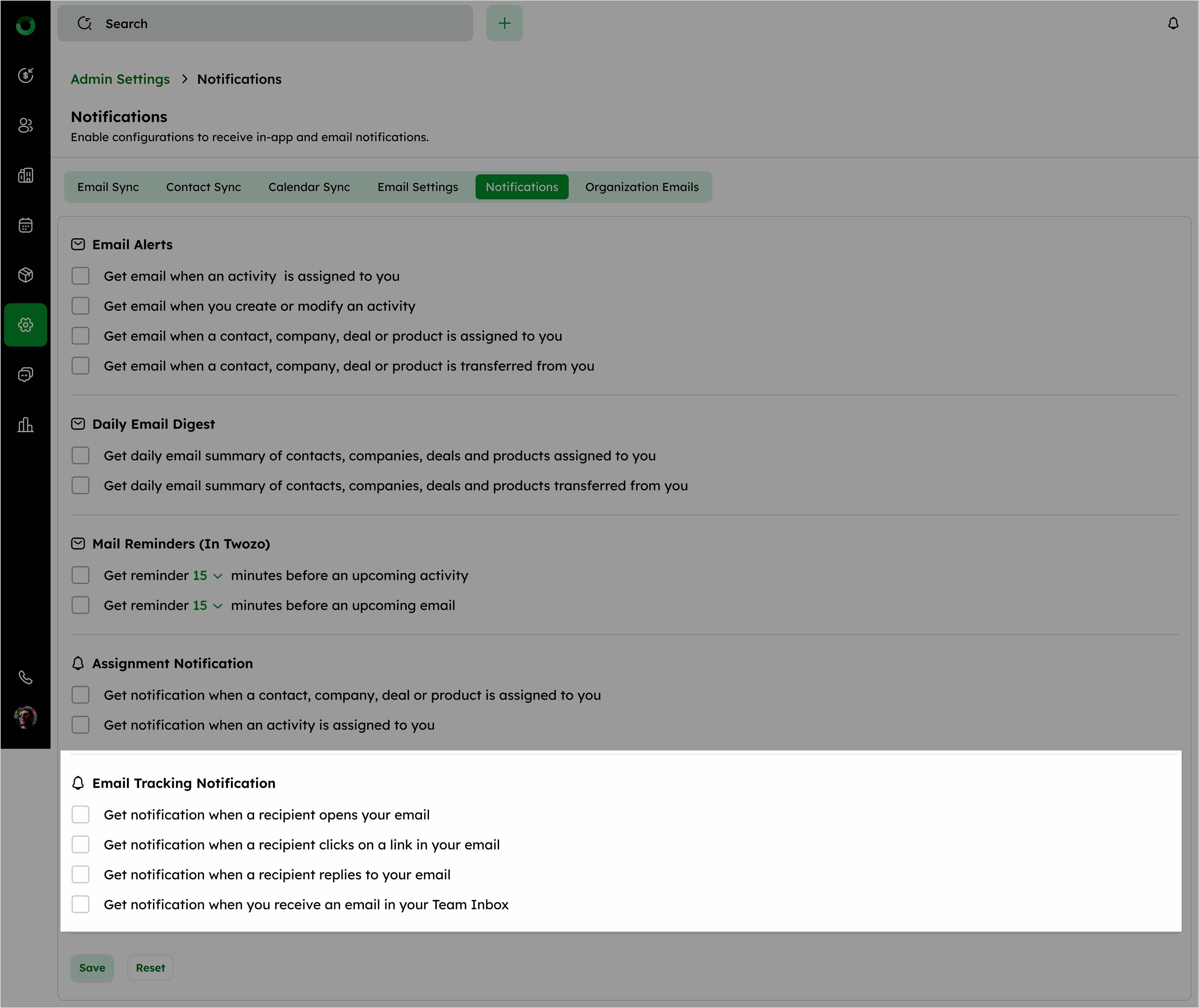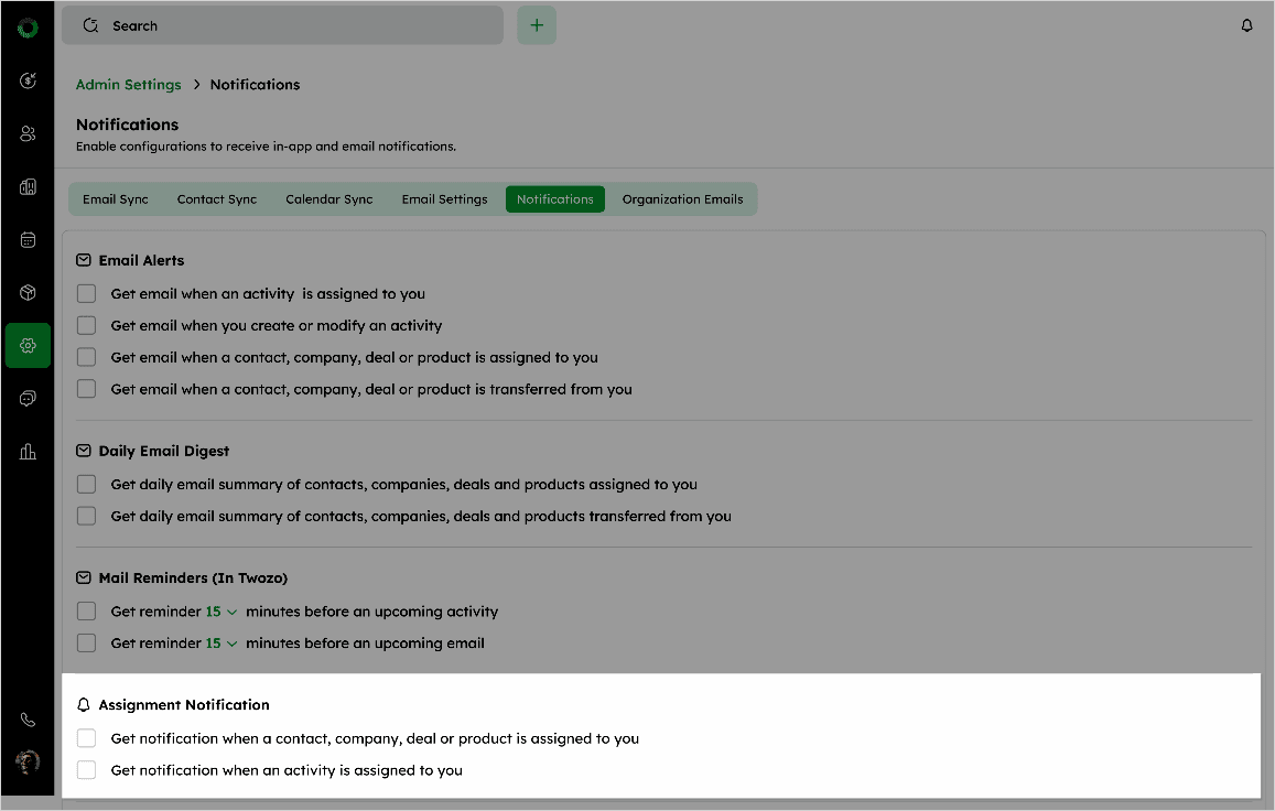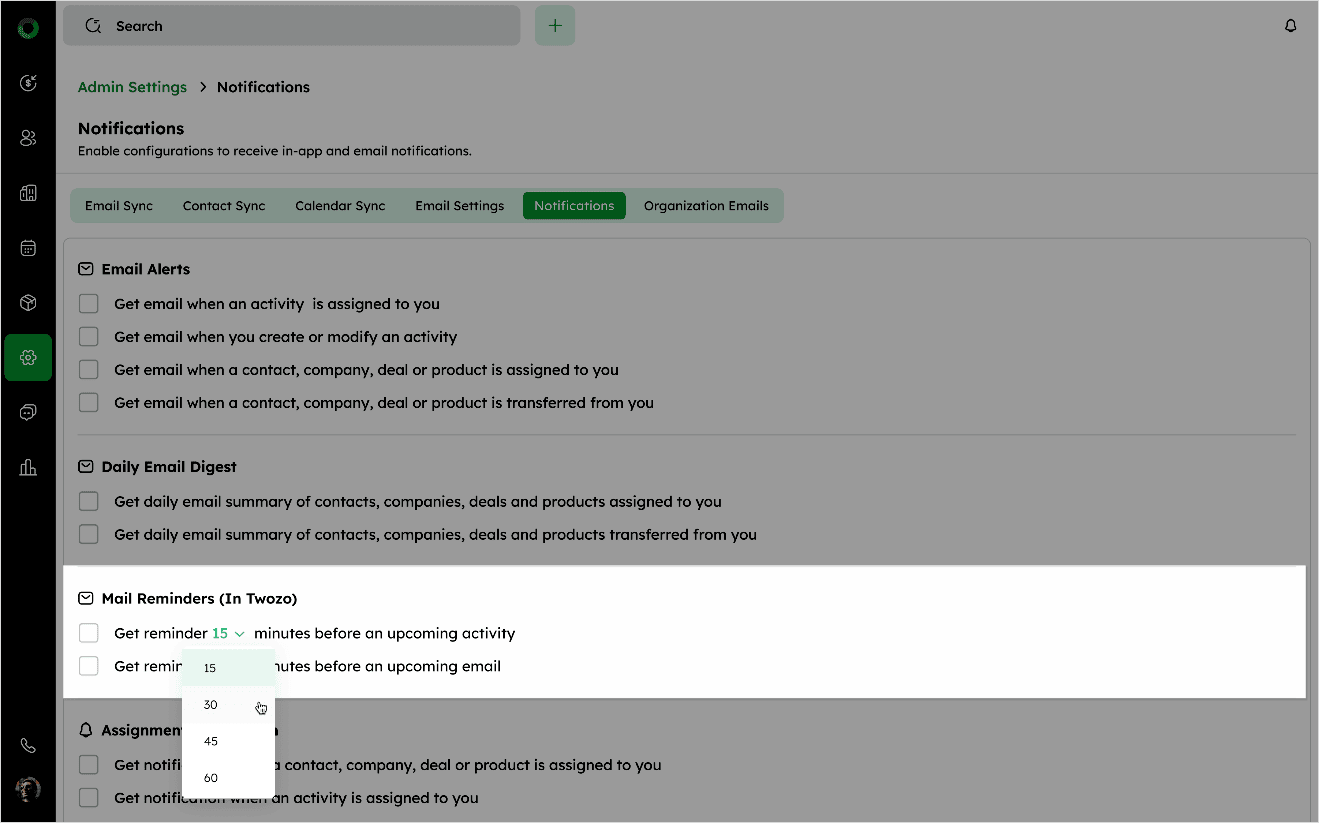 The list of settings enables you to choose on receiving email notifications of the fields that include, activities, contacts, companies, deals, and products.