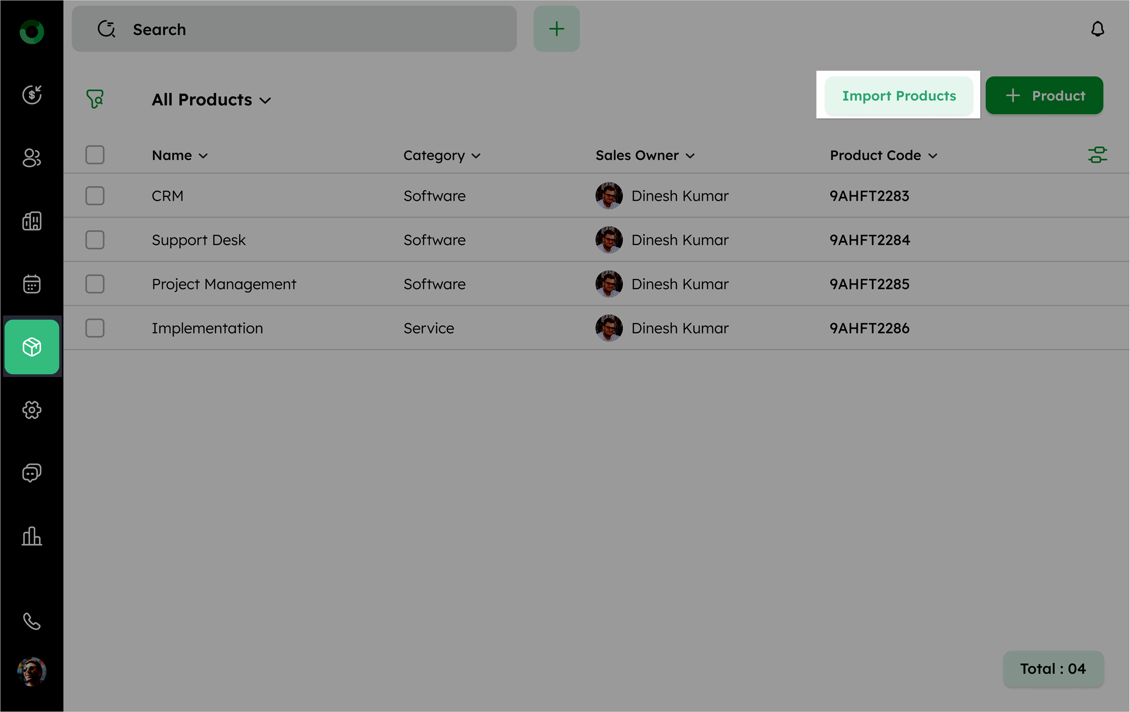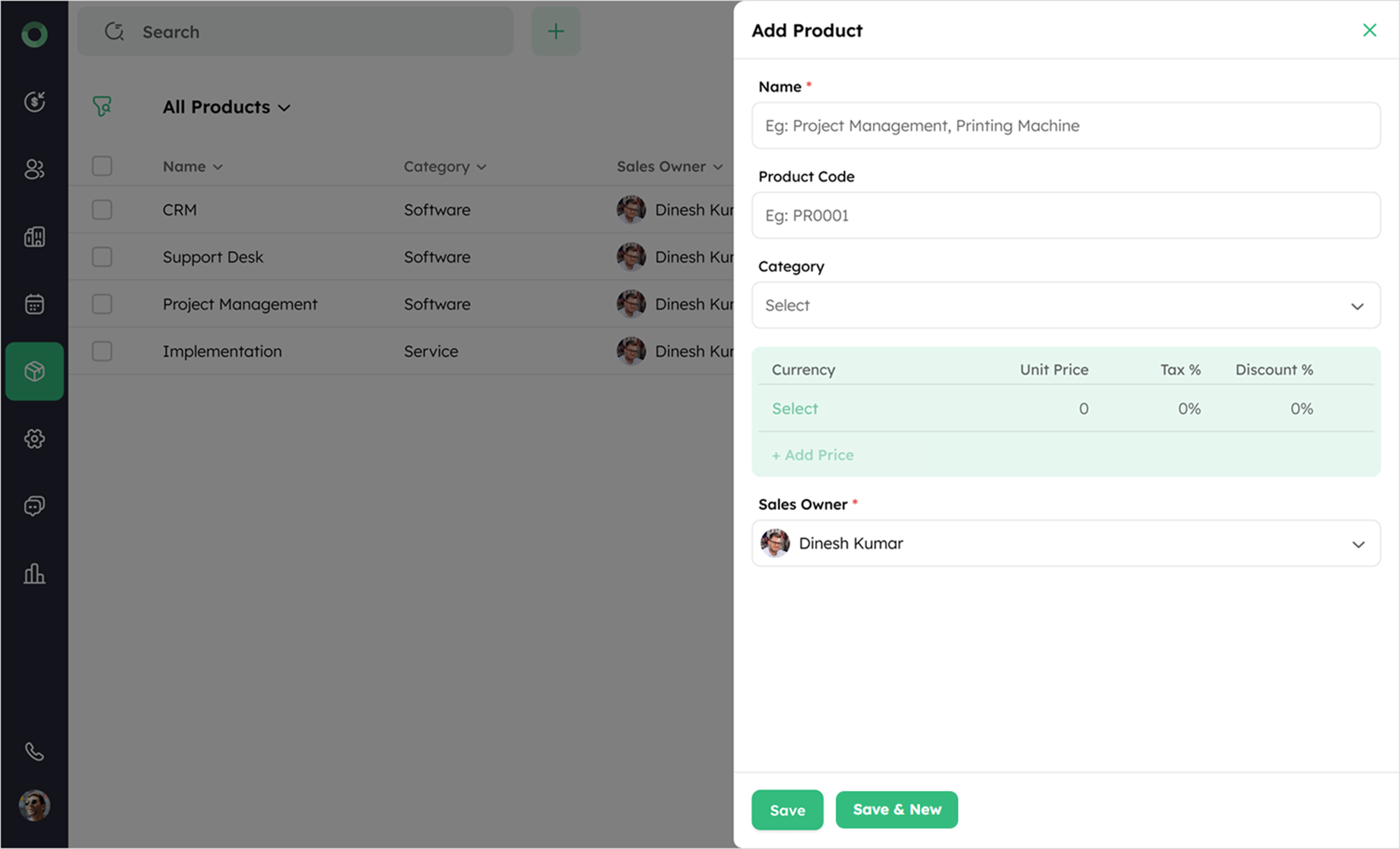 Fill in the necessary details, including Name, Product Code, Category, Unit Price, and Sales Owner.
