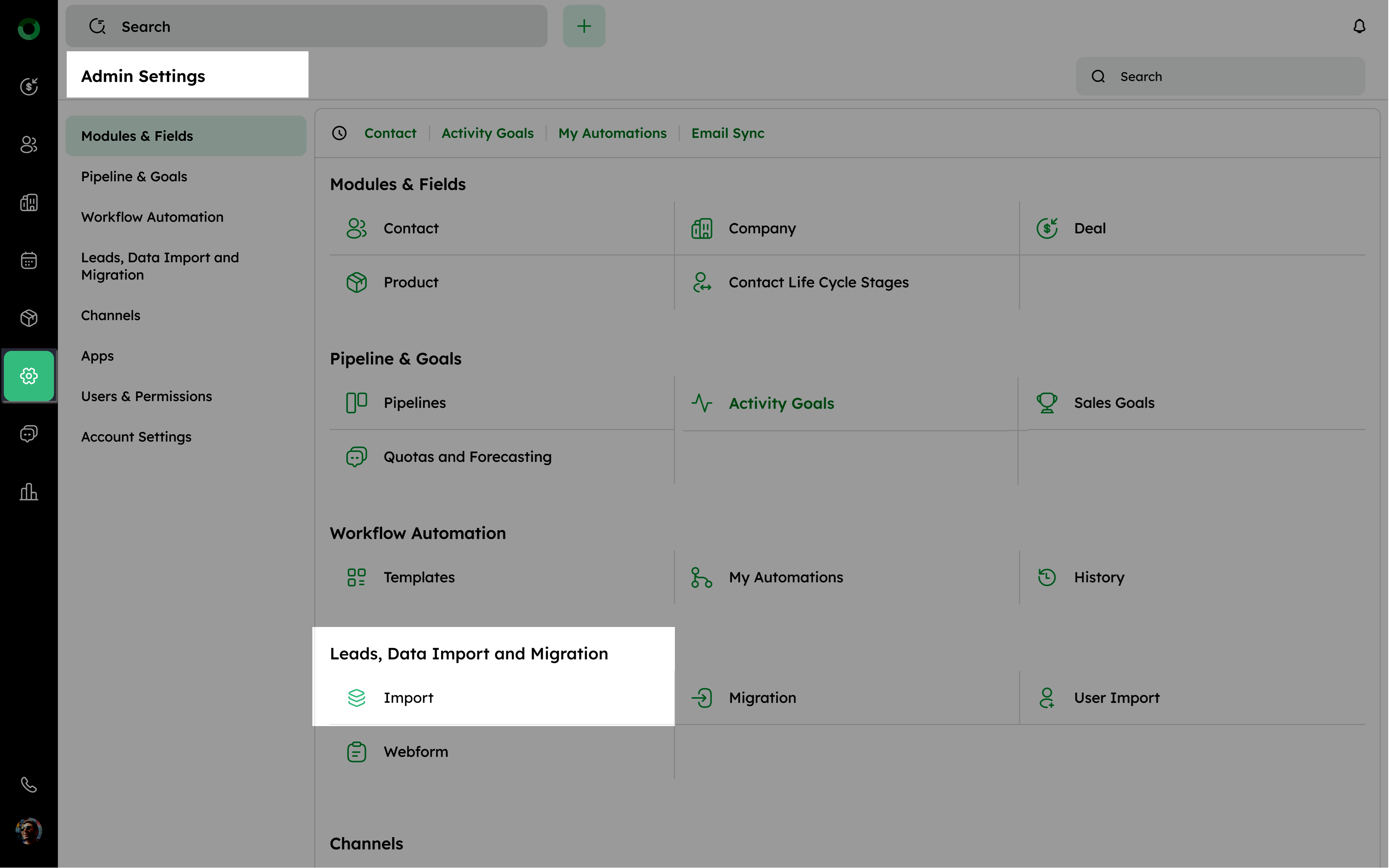 - Go to Admin Settings > Leads, Data Import & Migration > Import.