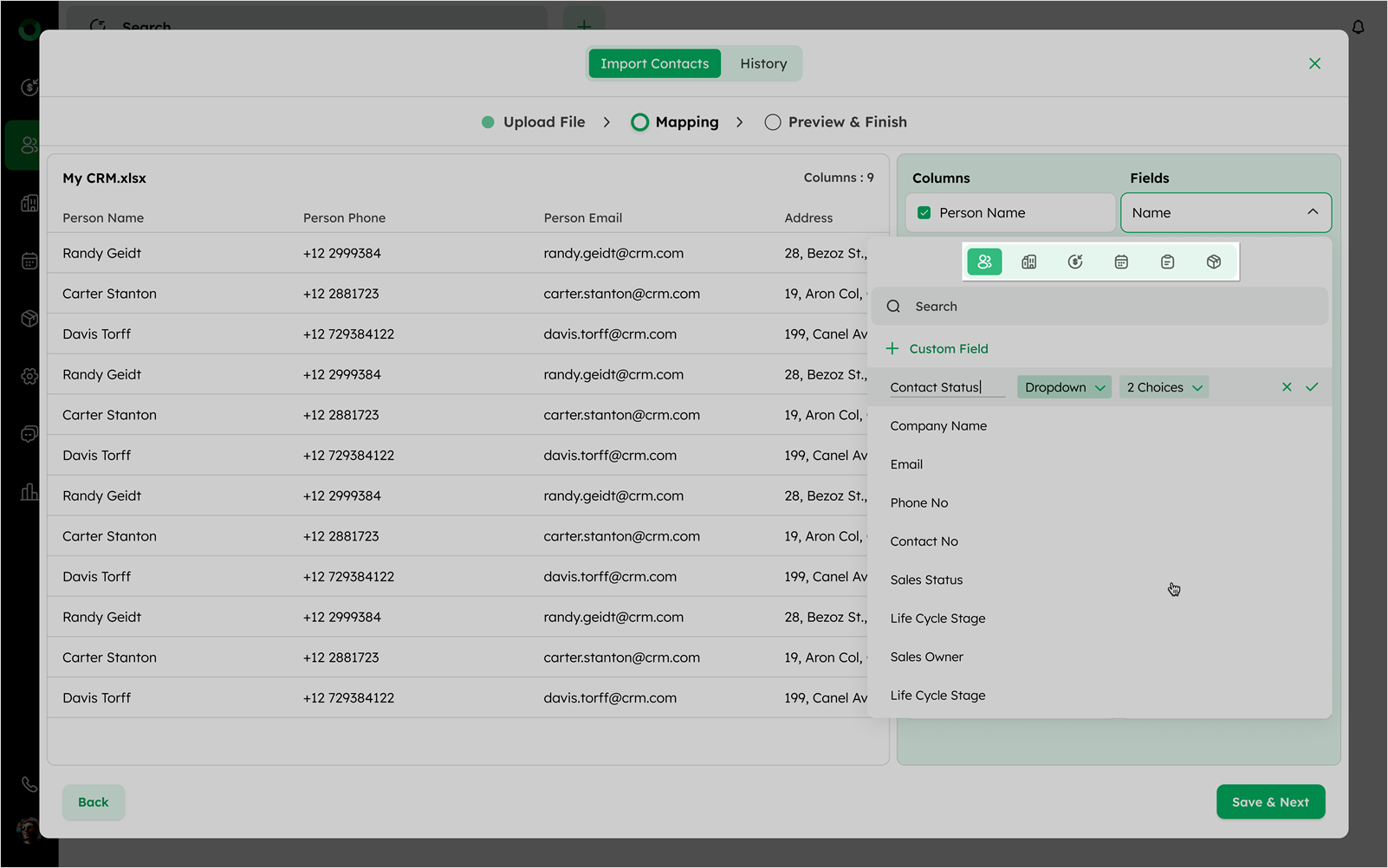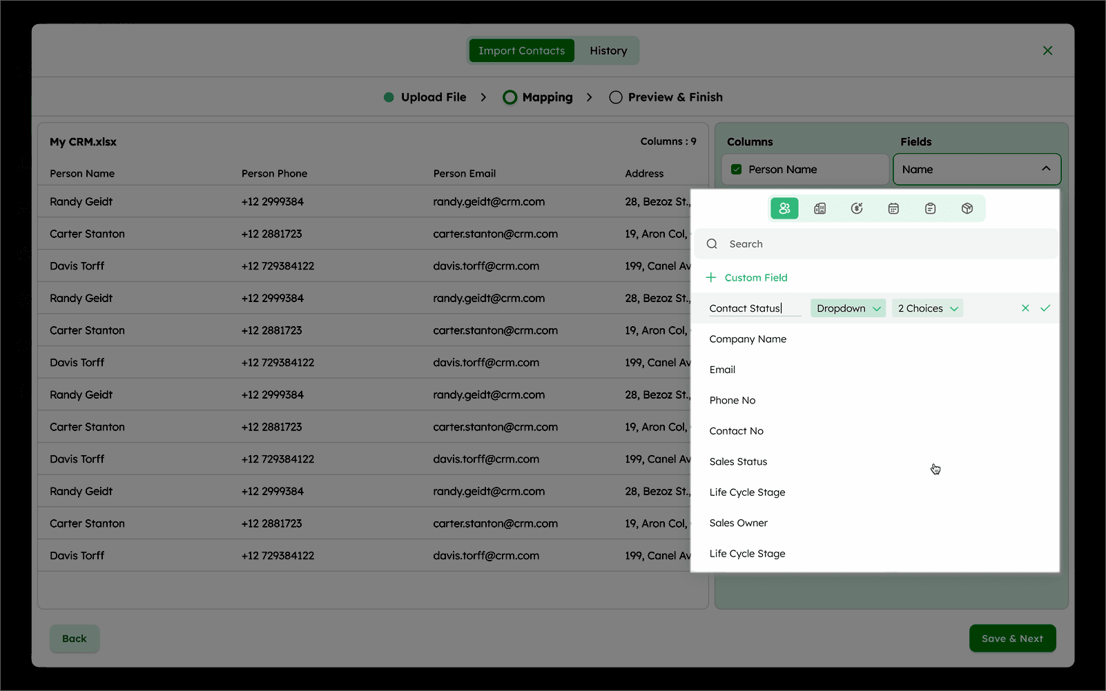 If your file contains fields but not present in the CRM, click +Custom Field to create a new custom field.