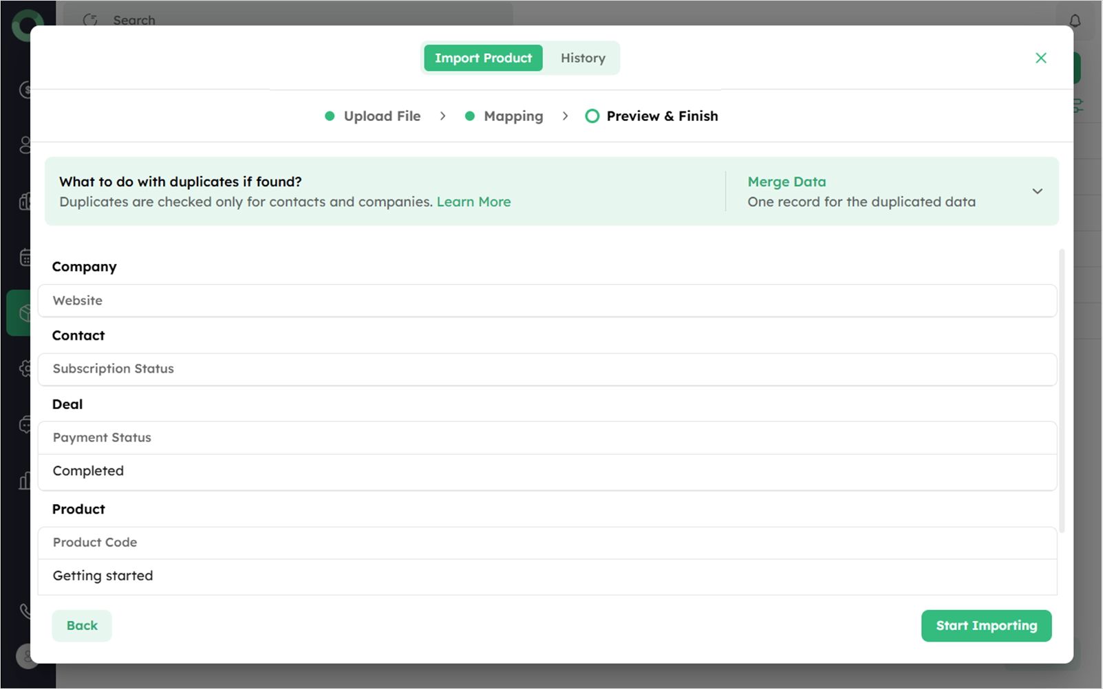 - Once verified, click Start Importing to proceed, or to make changes, click Back to return to the mapping step.