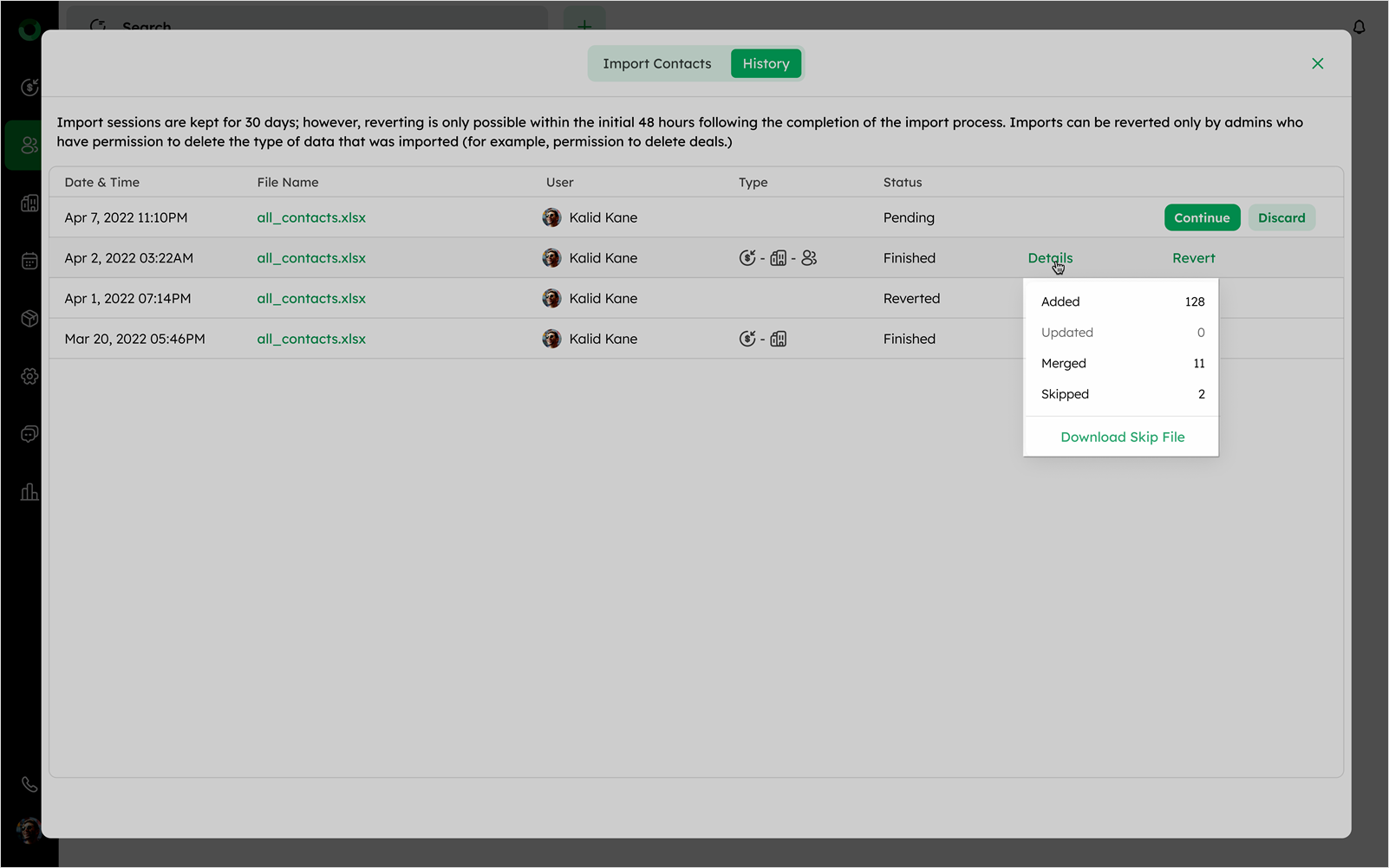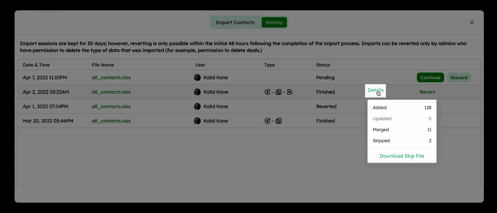 Only admins with the appropriate permissions can revert an import. (e.g., permission to delete deals)