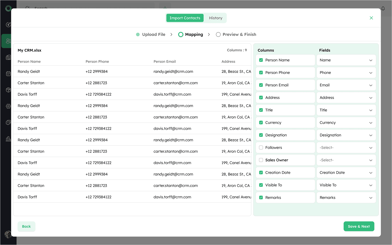 - After uploading of file, review the import preview, the system will auto-map columns where column names match CRM field names.