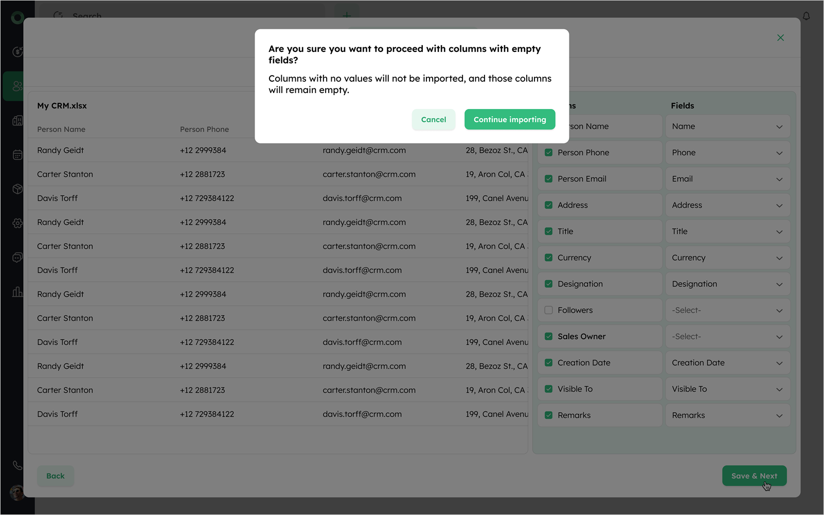 If any checked column remains unmapped, a confirmation dialog will appear choose Continue Importing to proceed without those columns or Cancel to return and finish mapping.