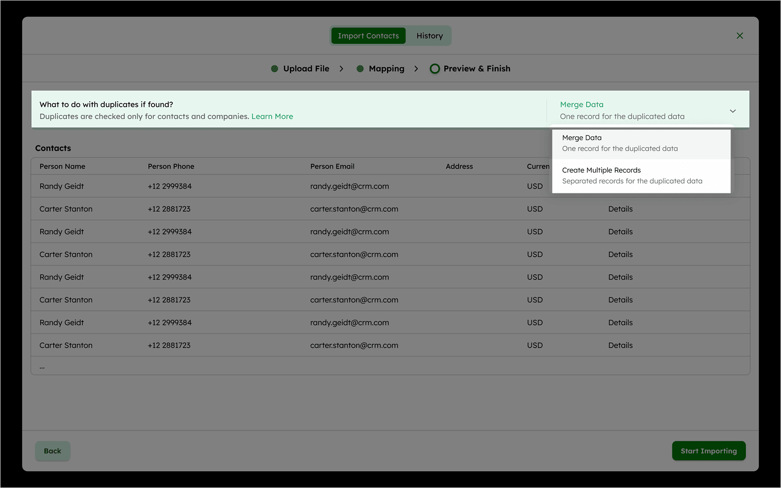 Create Multiple Records: Keeps duplicates as separate records.