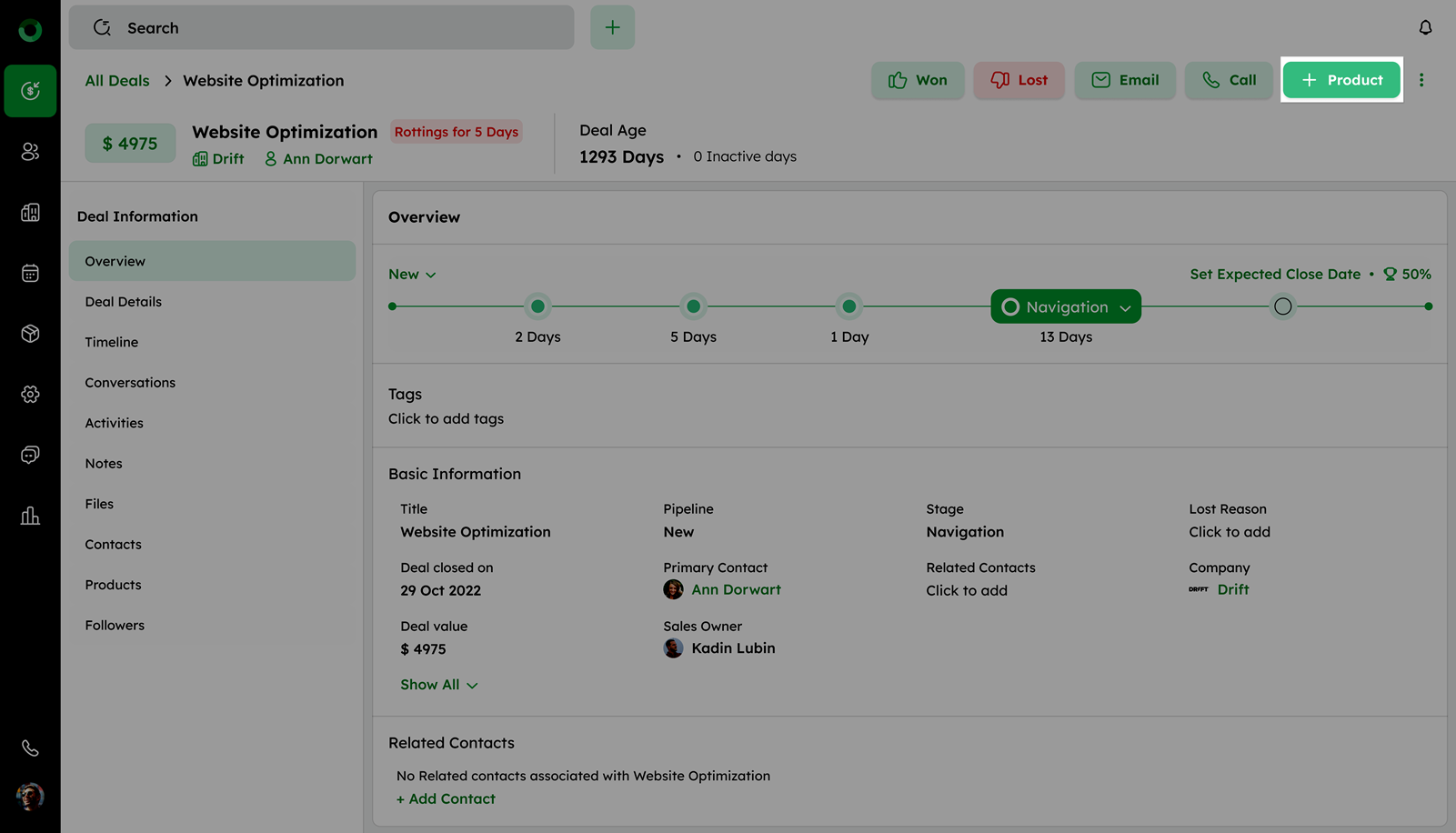 On the Deal Detail Page, click the +Product button in the top-right corner.