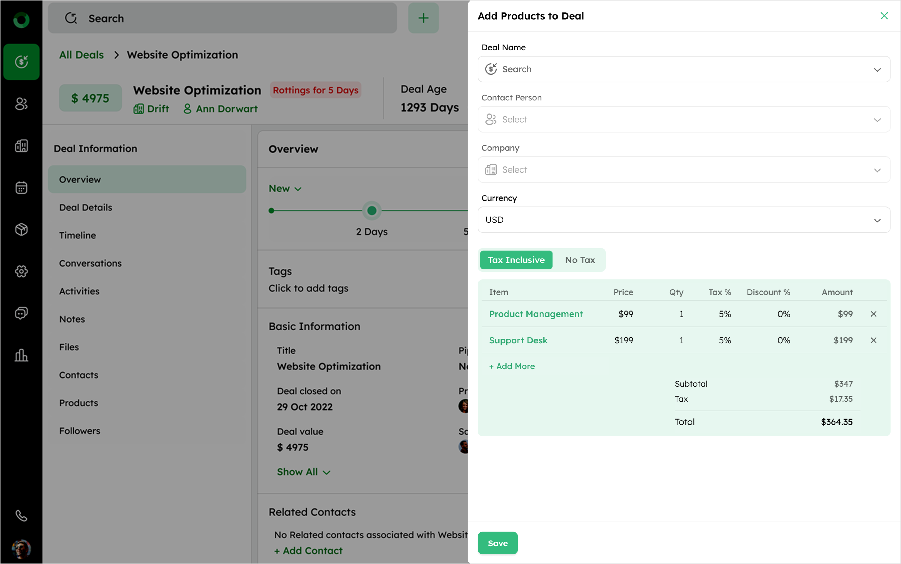 Adding a product from the Deal Detail Page allows you to directly link products with a deal without navigating to other modules. This ensures s all deal-related information accurate and organized.