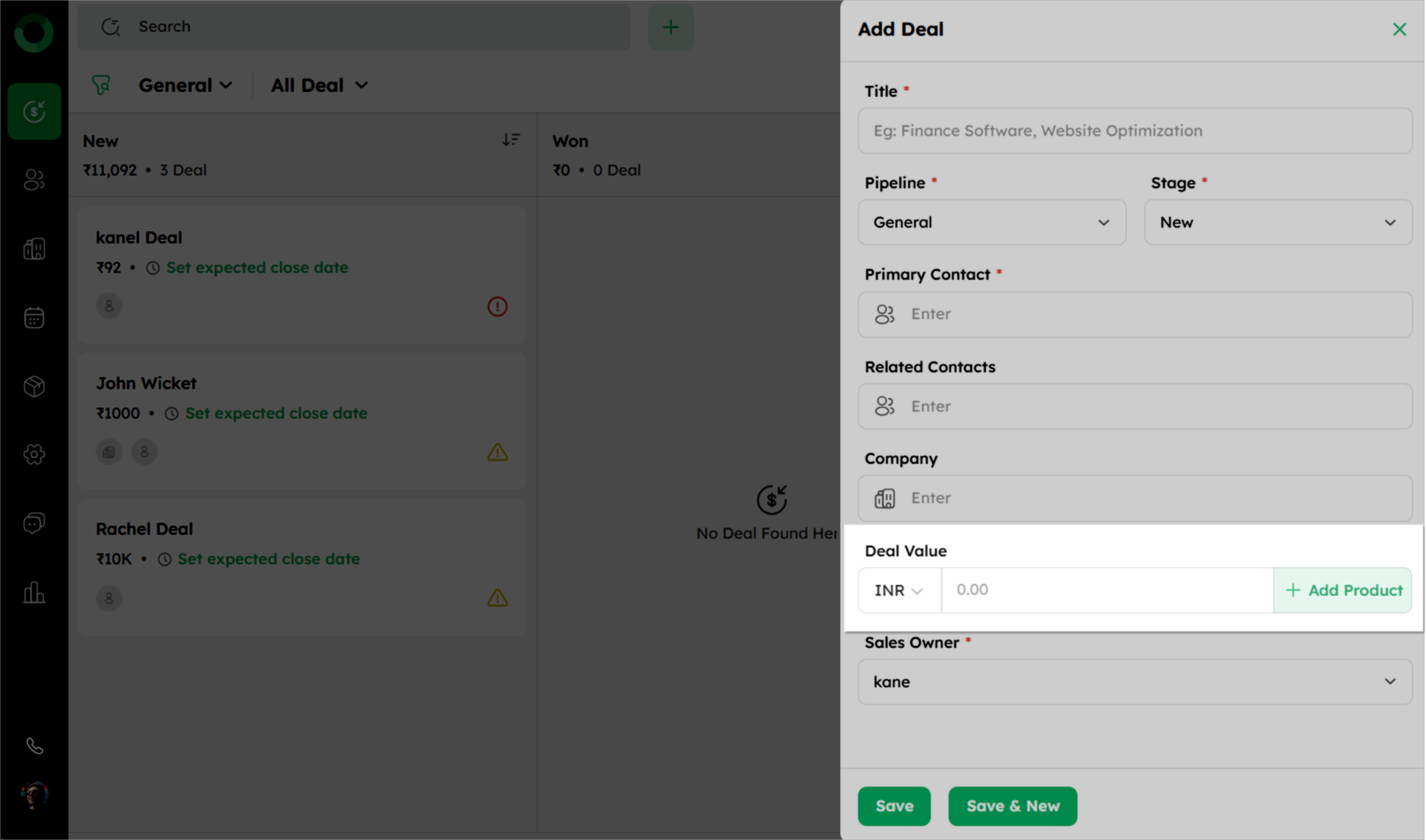 - Navigate to the Deal Module and click +Deal to open the Add Deal drawer.