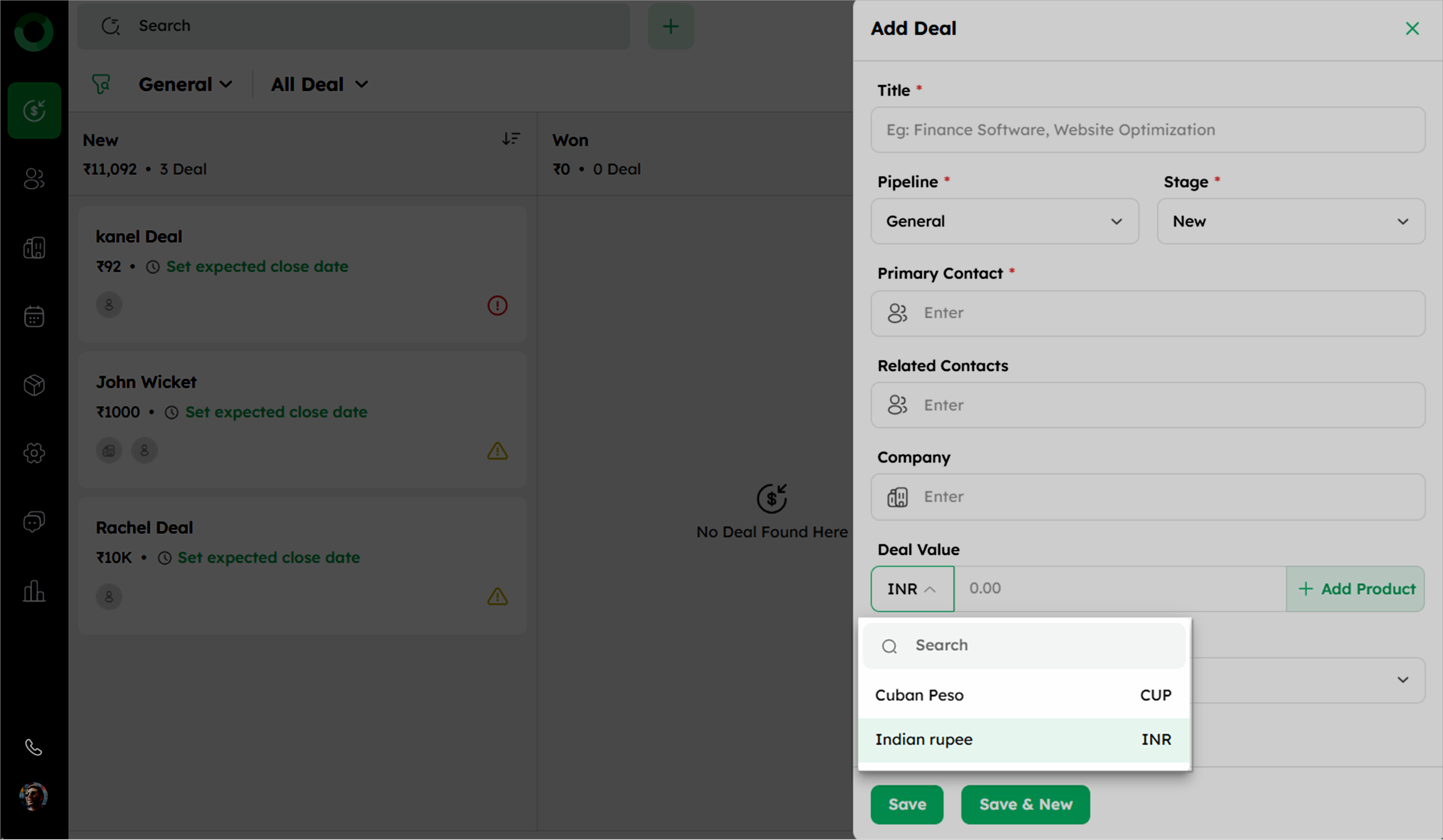 - Select the deal currency from the dropdown in the Deal Value section.