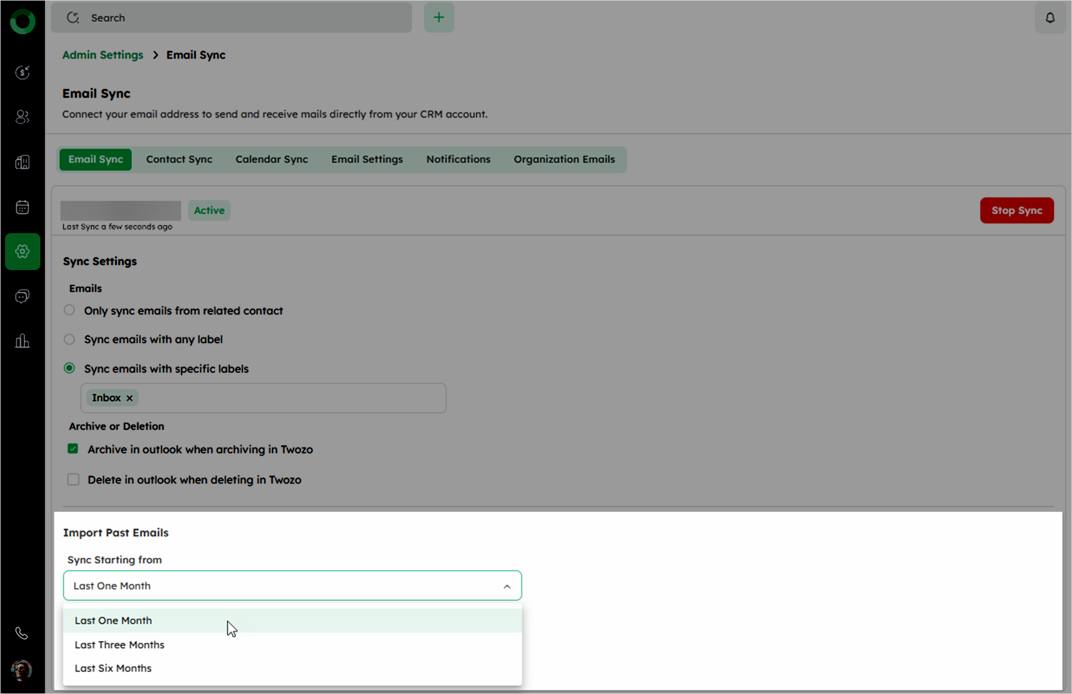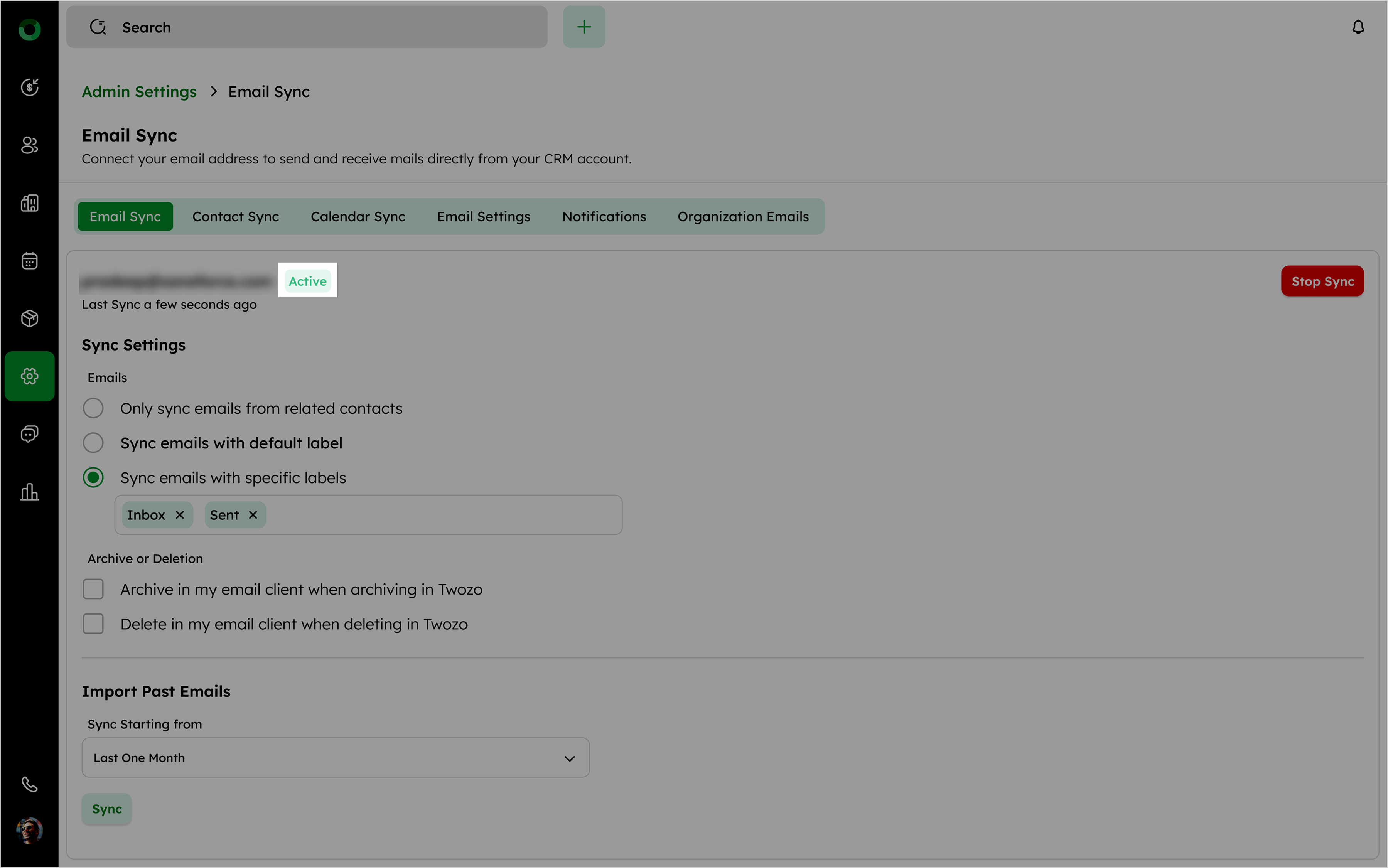 The Sync Settings in Twozo CRM for emails allow you to customize how your email interactions are handled, ensuring seamless integration between your email provider and the CRM. You can also modify the Sync Settings after clicking Start Sync to adjust how your emails are synced. Here's a breakdown of the available options: