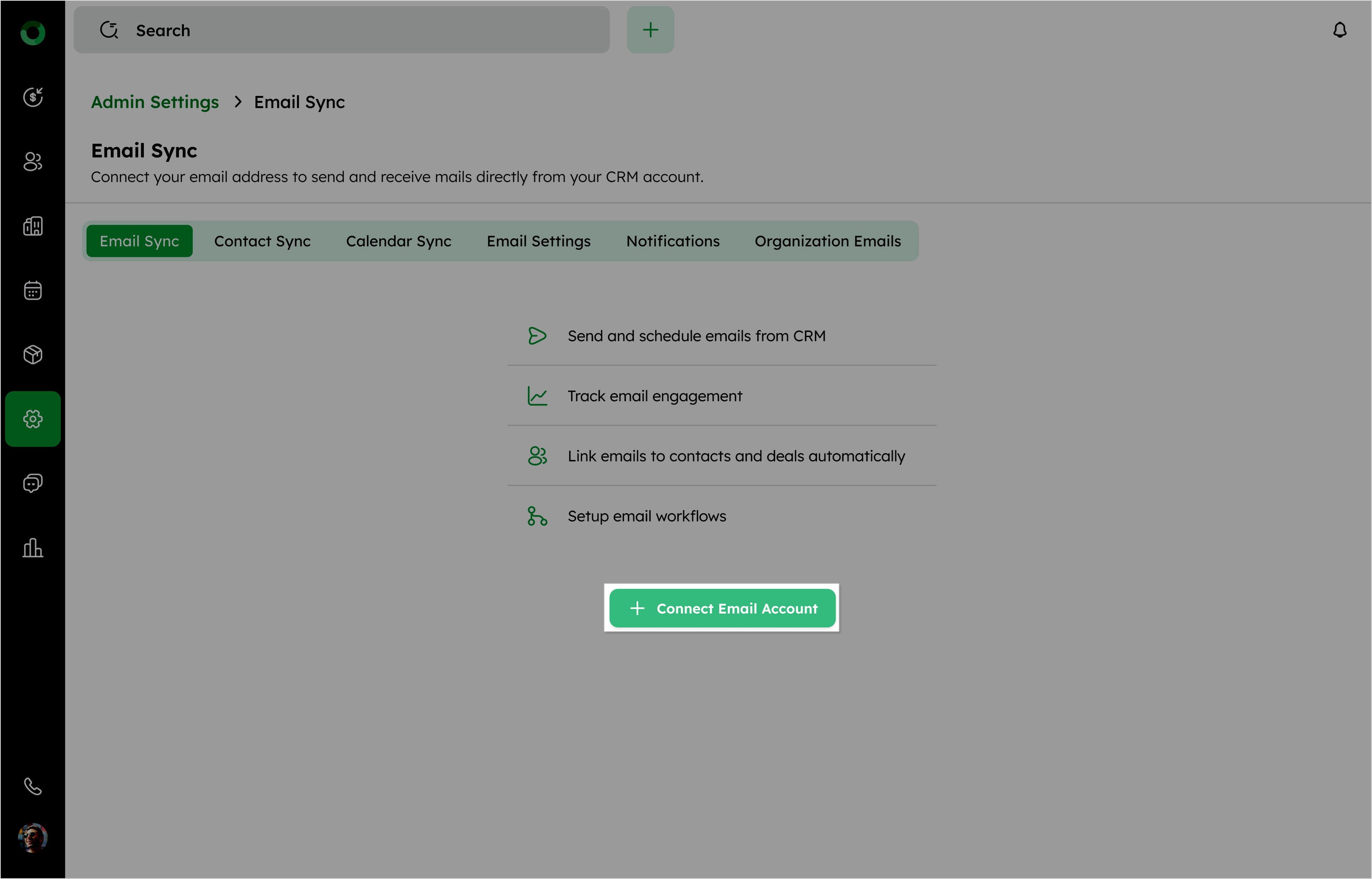 In the admin settings, locate the Email section and click Email Sync to open the email sync page.